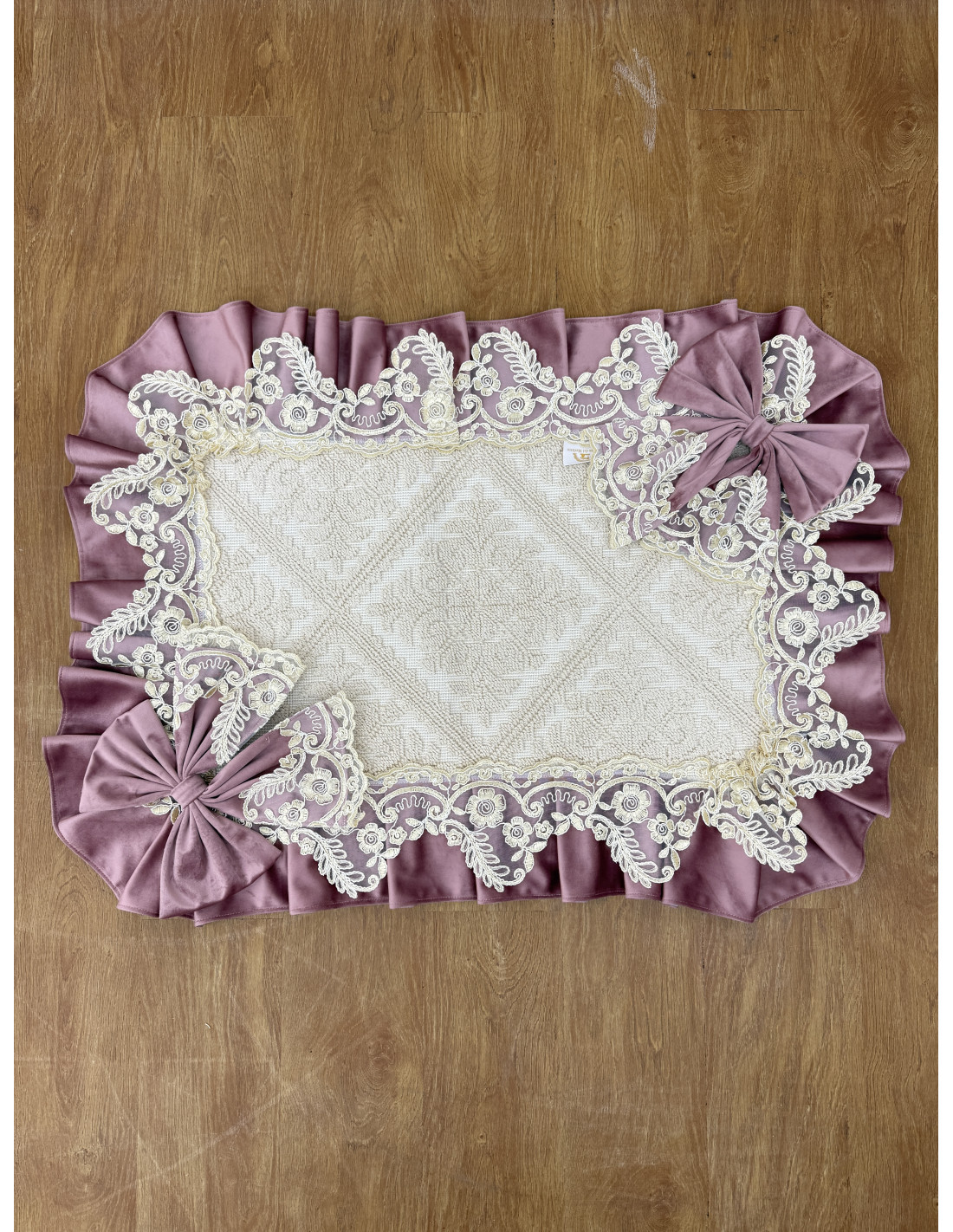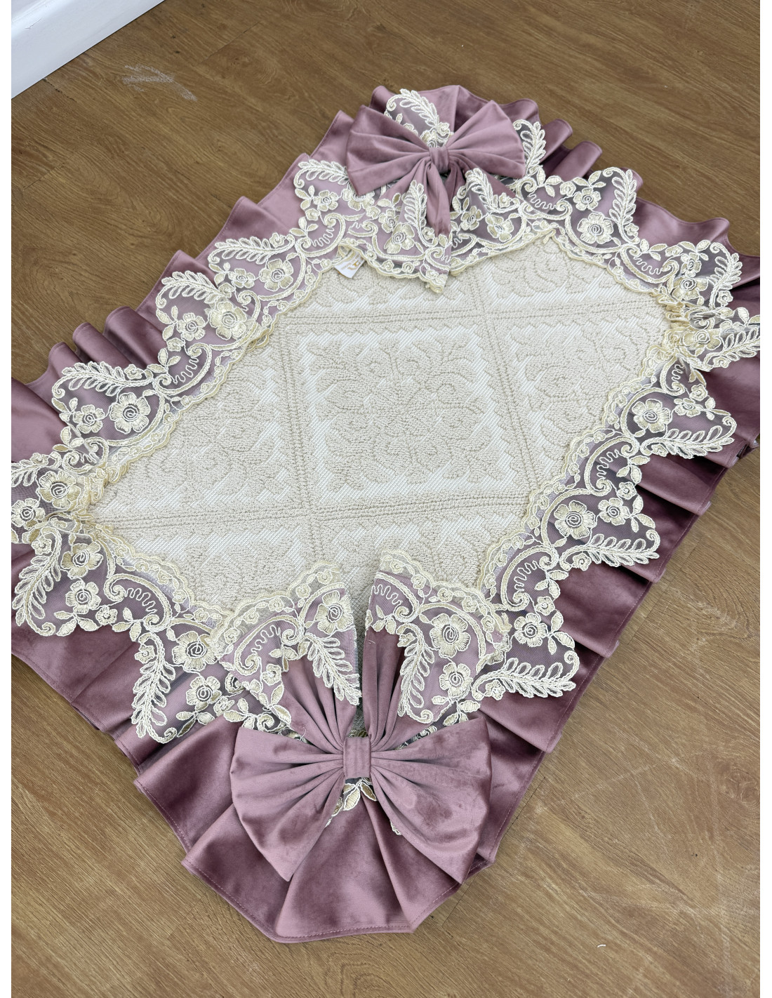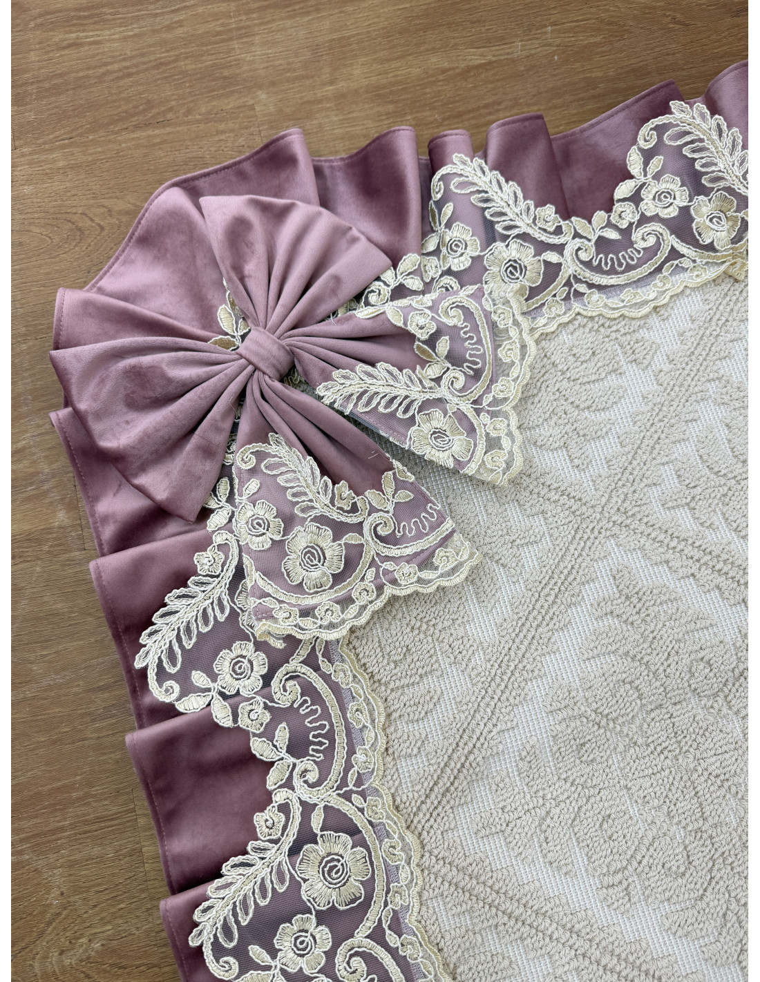 Raffinato tappeto sardo in tonalità avorio, rifinito con un’elegante volà in velluto rosa e prezioso pizzo rebrodé.