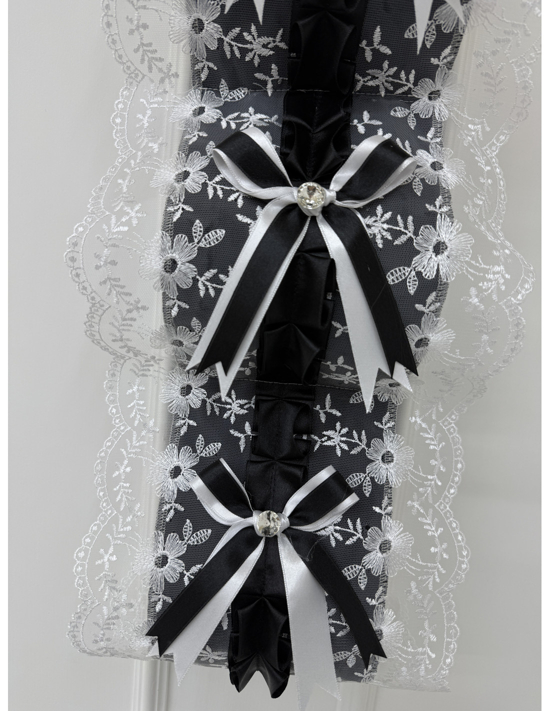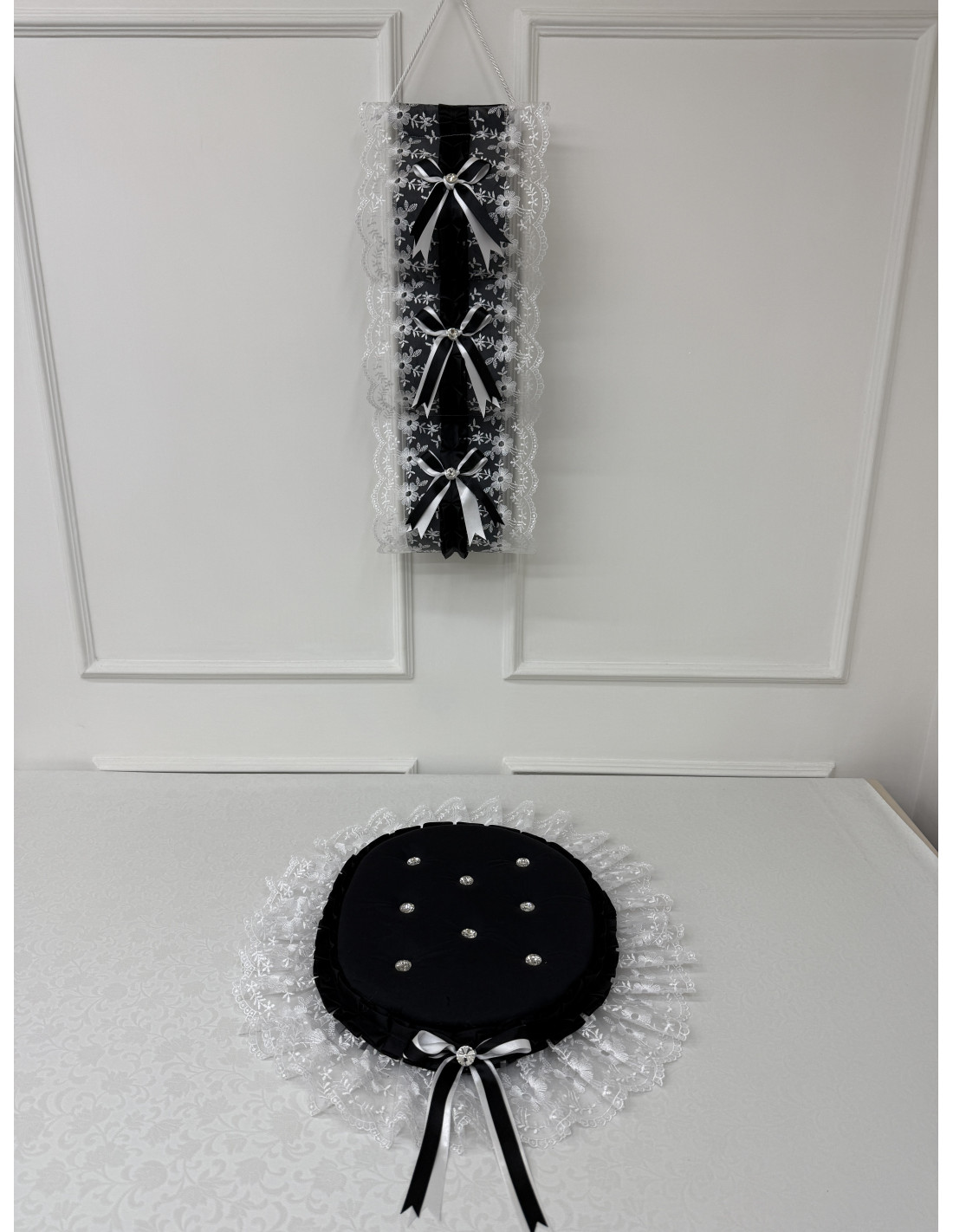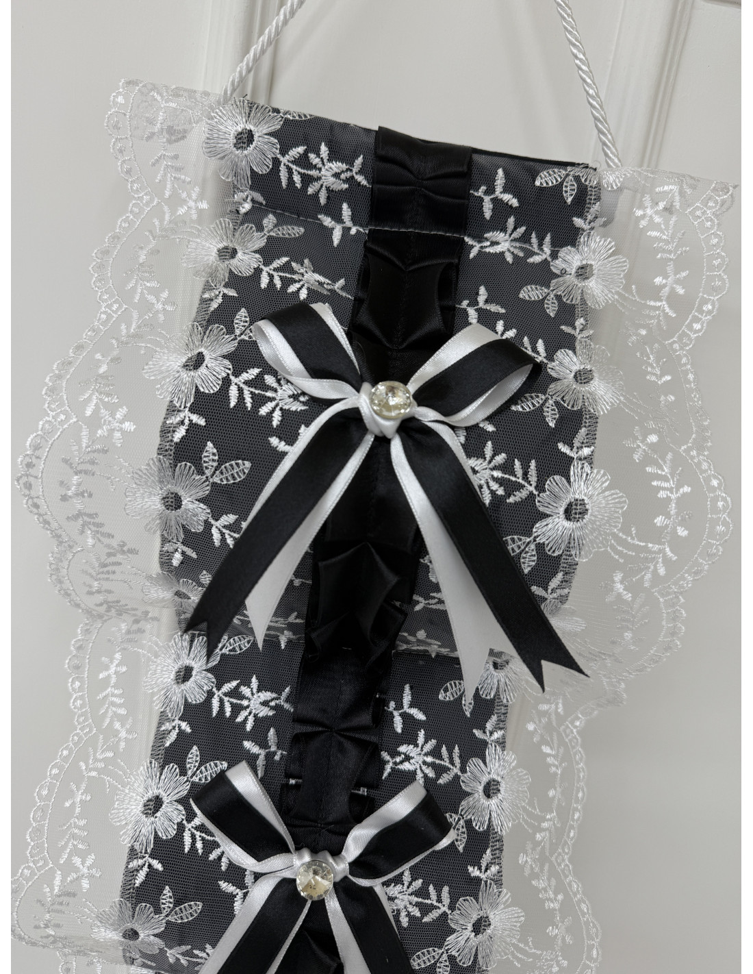 Raffinato portarotolo realizzato in velluto nero, impreziosito da tulle bianco che aggiunge luce ed eleganza.