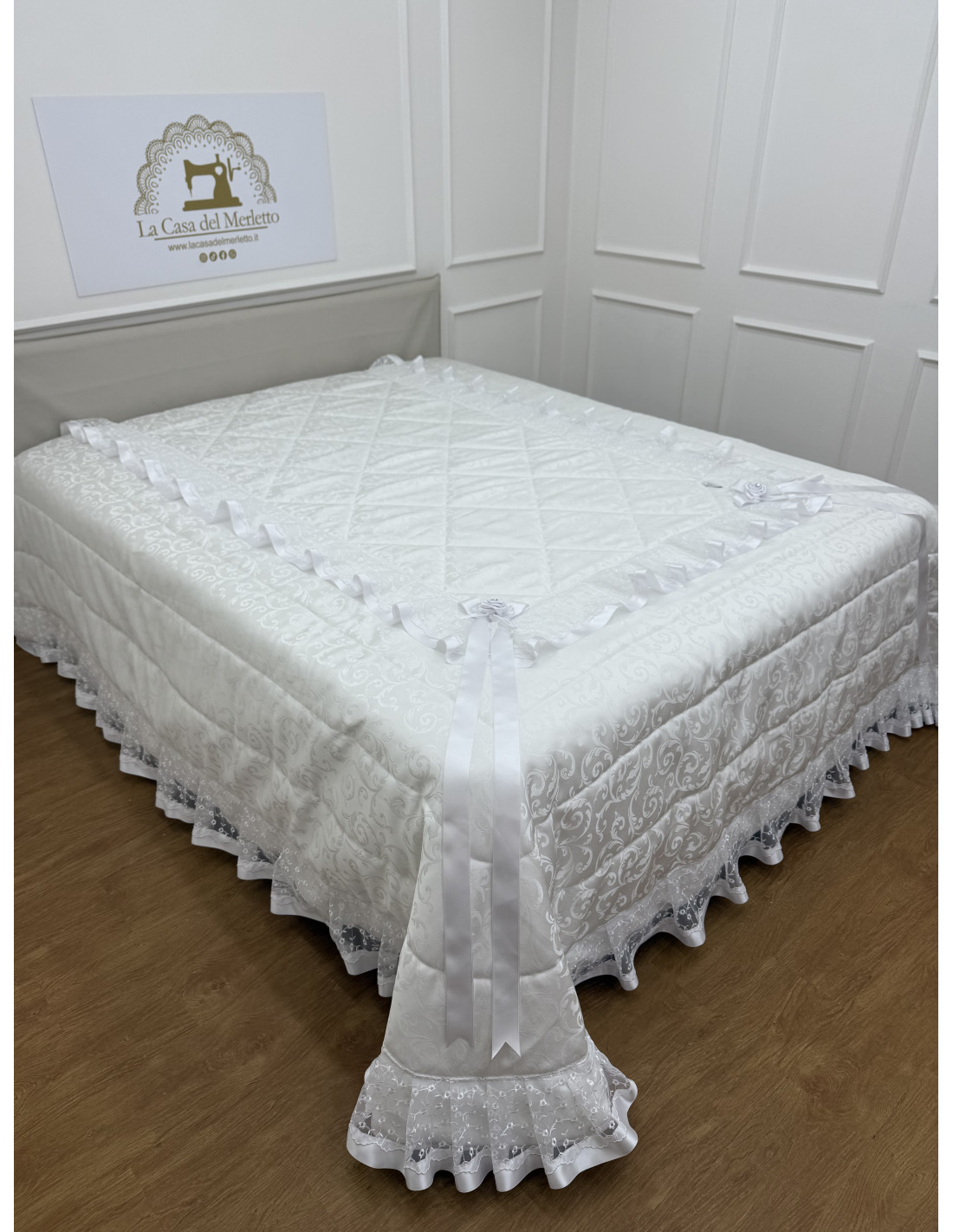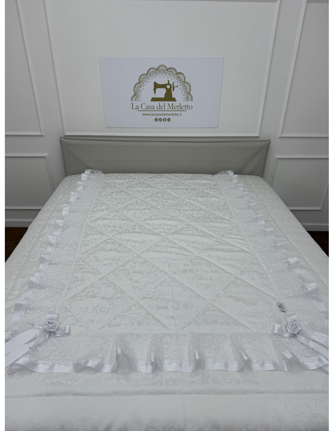 Piumone matrimoniale con doppia balza di organza e raso, impreziosito da fiocchi, rose applicate e Swarovski.