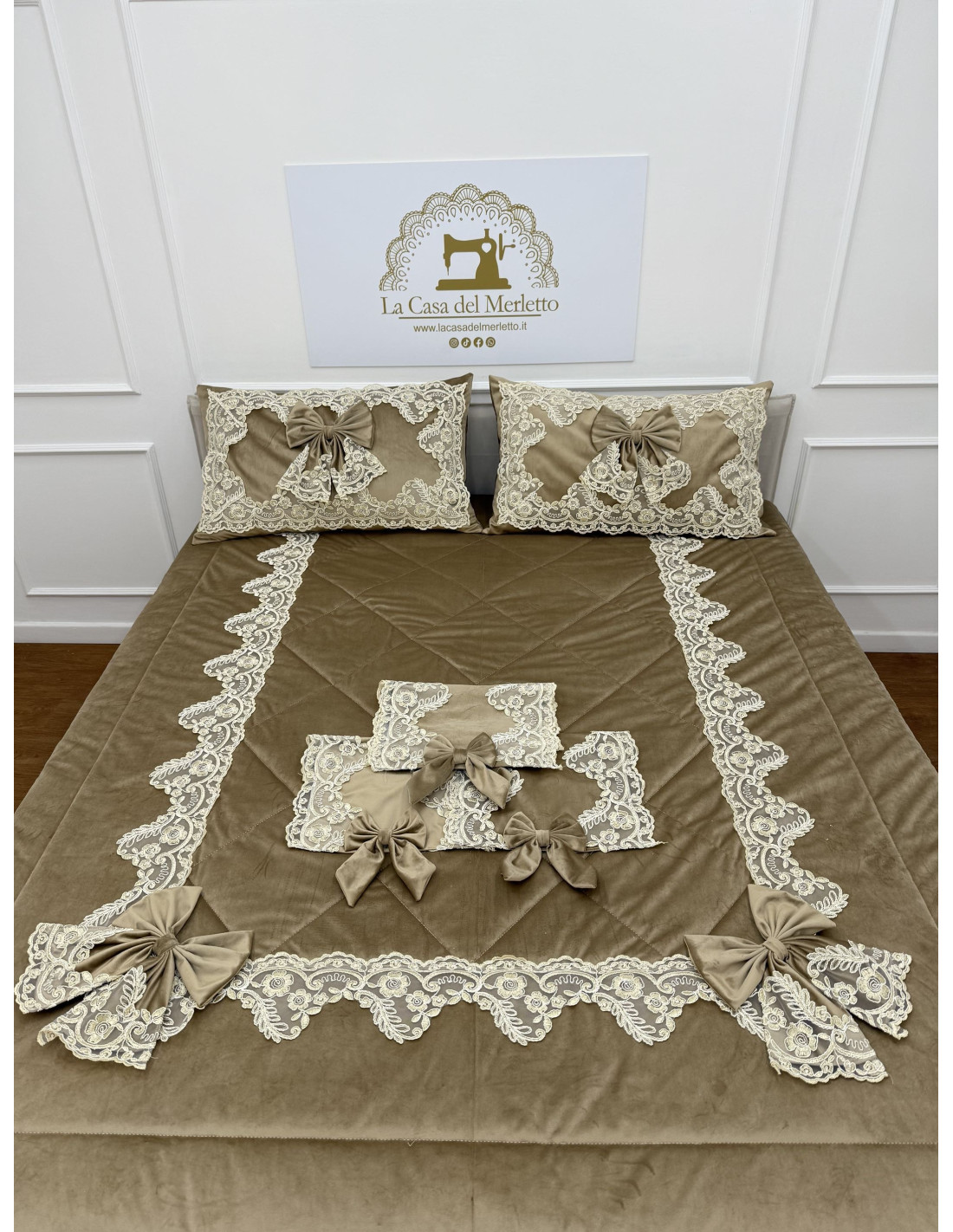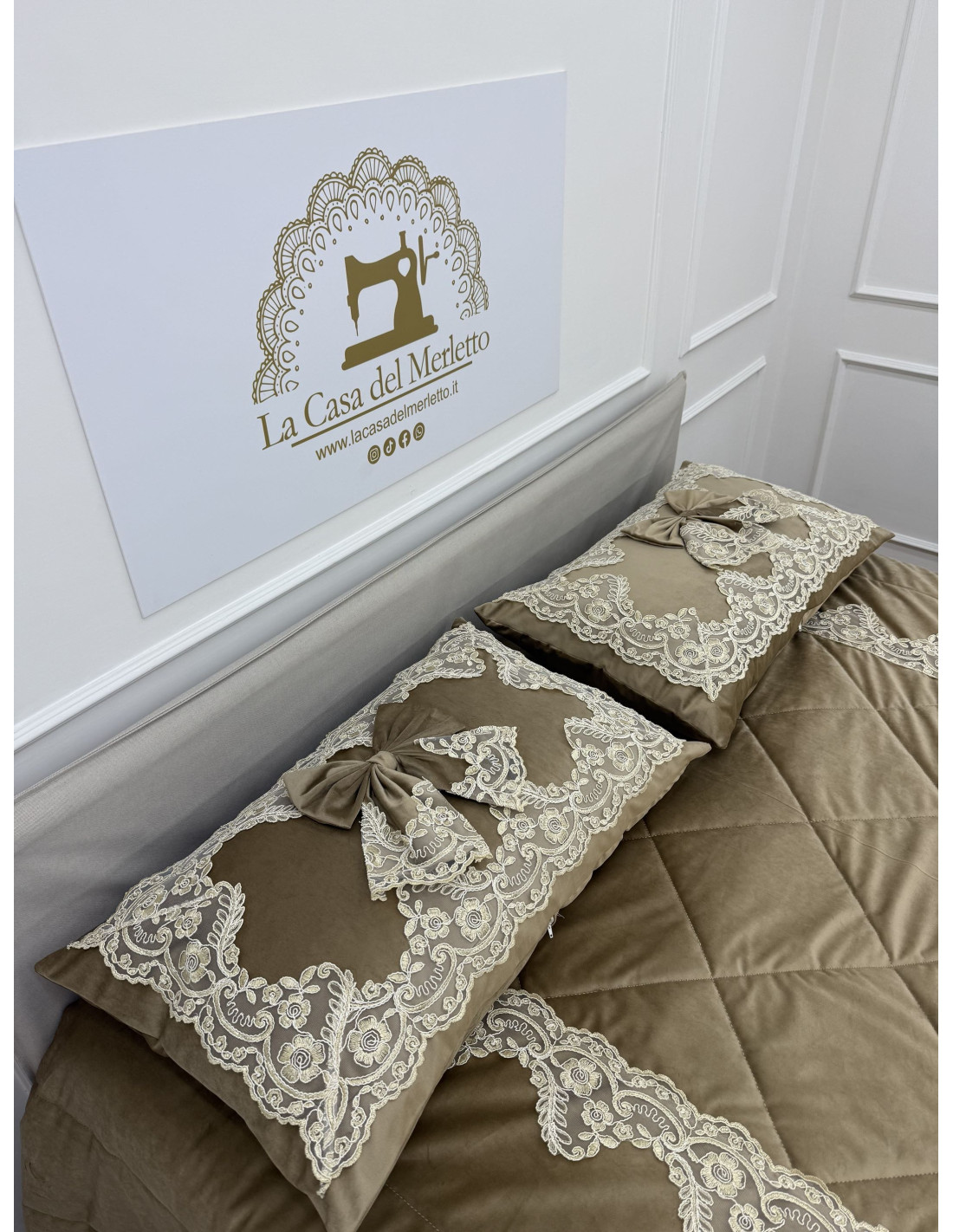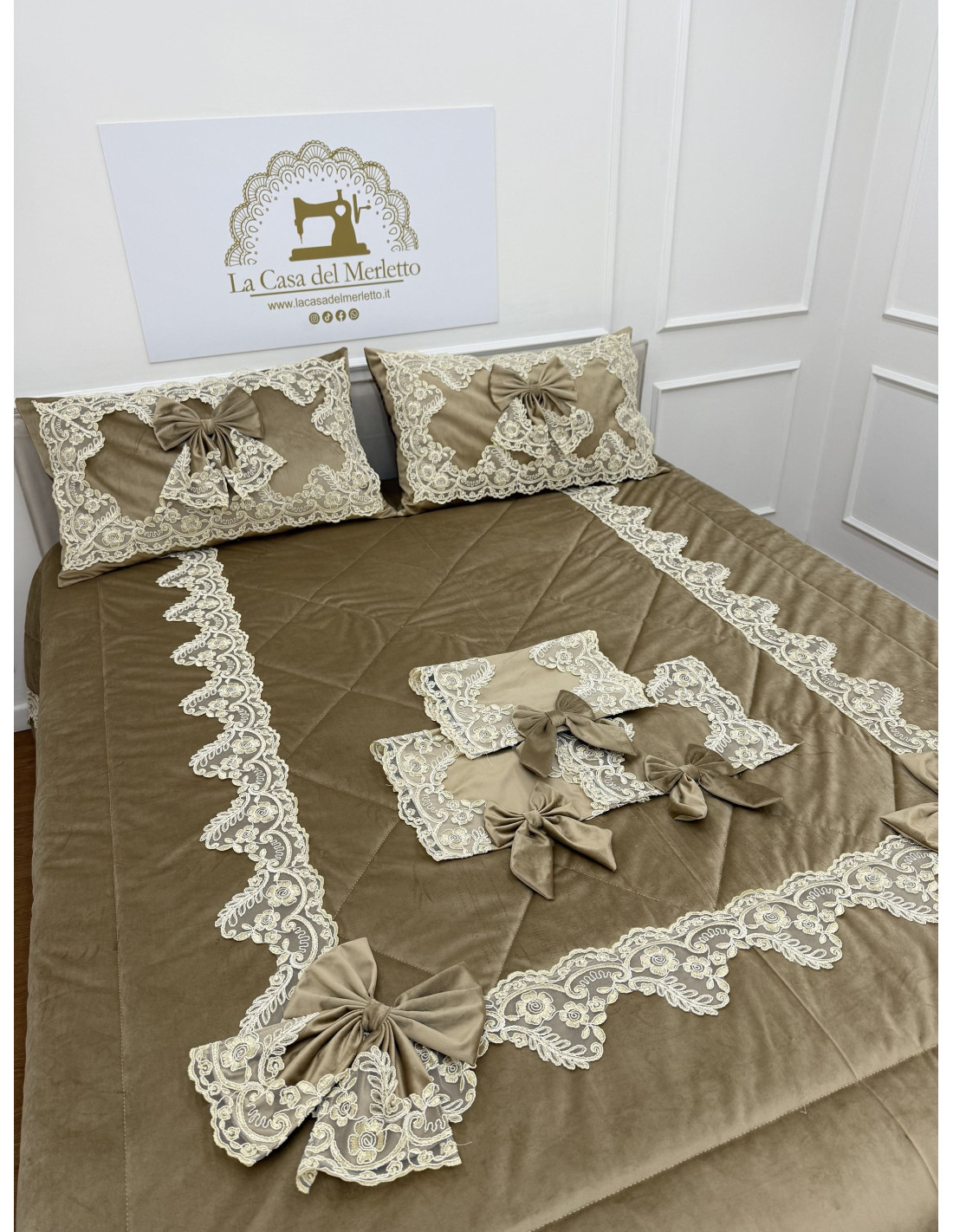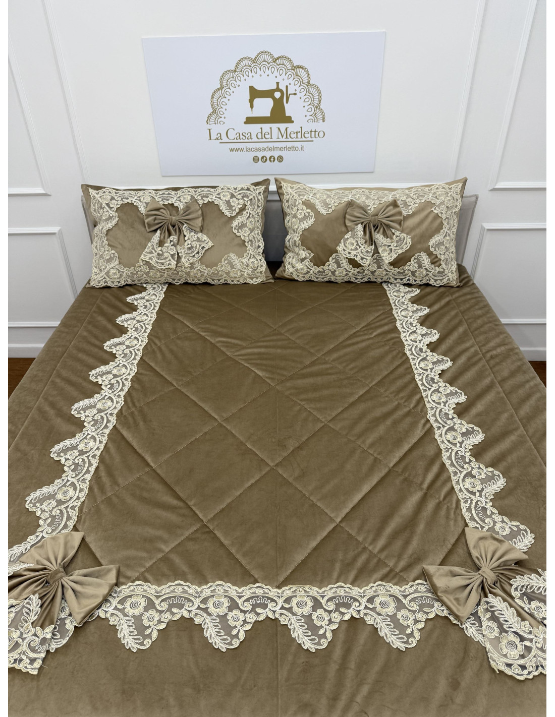 - Trapunta 320gr in velluto tortora impreziosita da inserti in rebrodé panna, soffice e avvolgente.