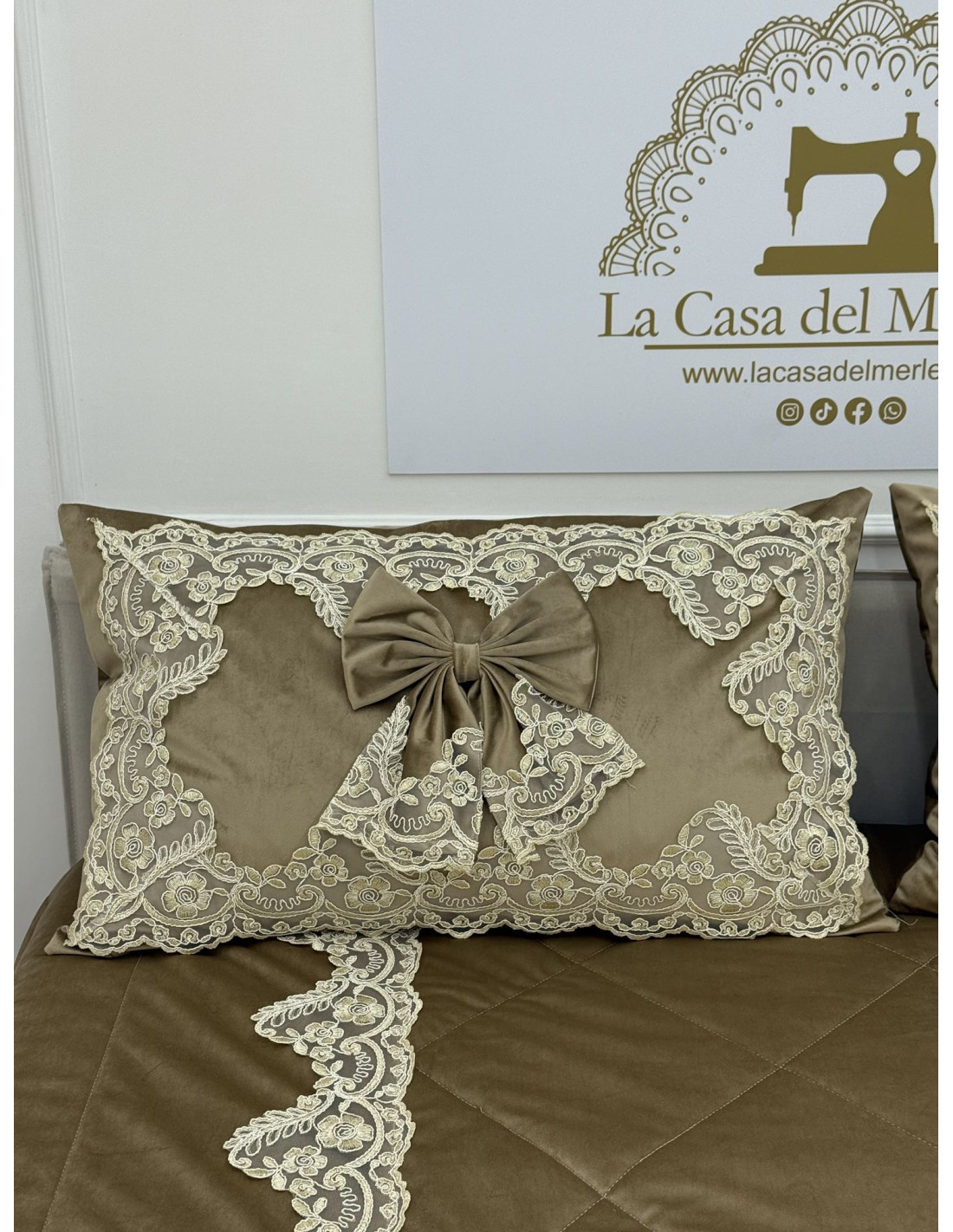 - Coppia guanciali 50x80 cm in velluto coordinato, con dettagli raffinati.