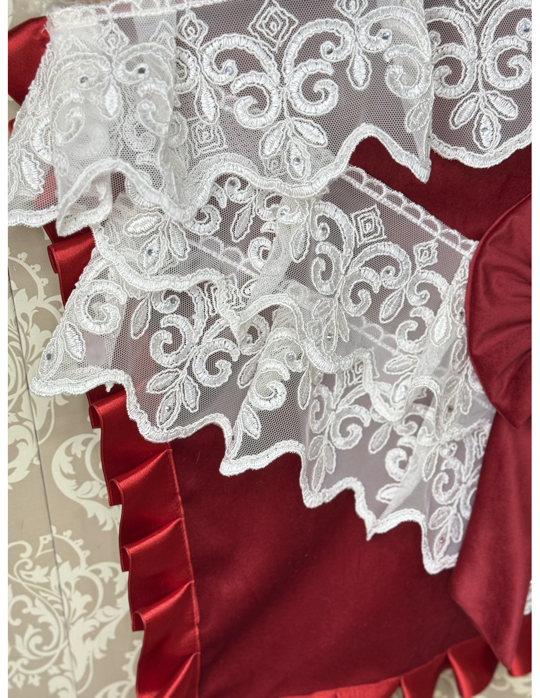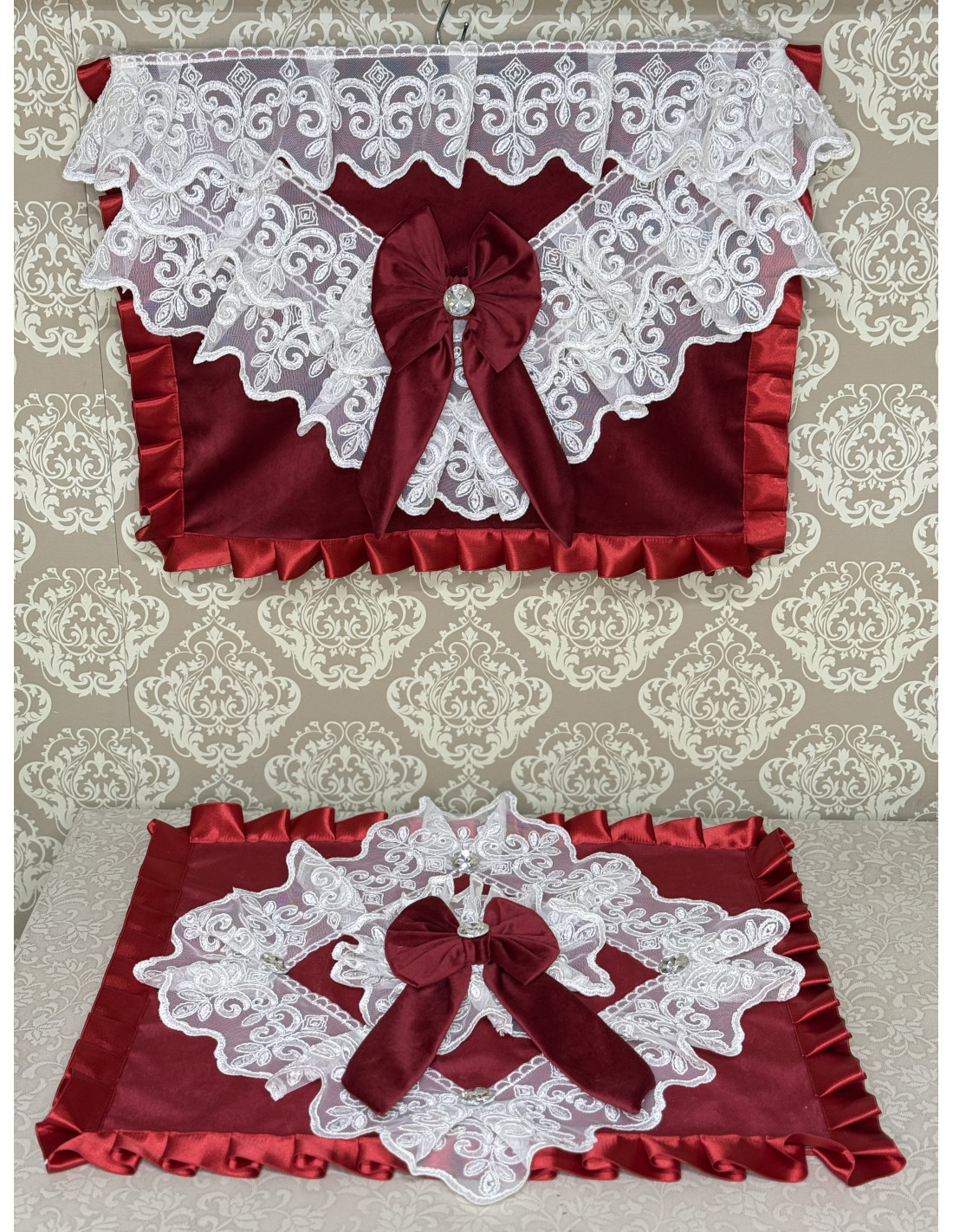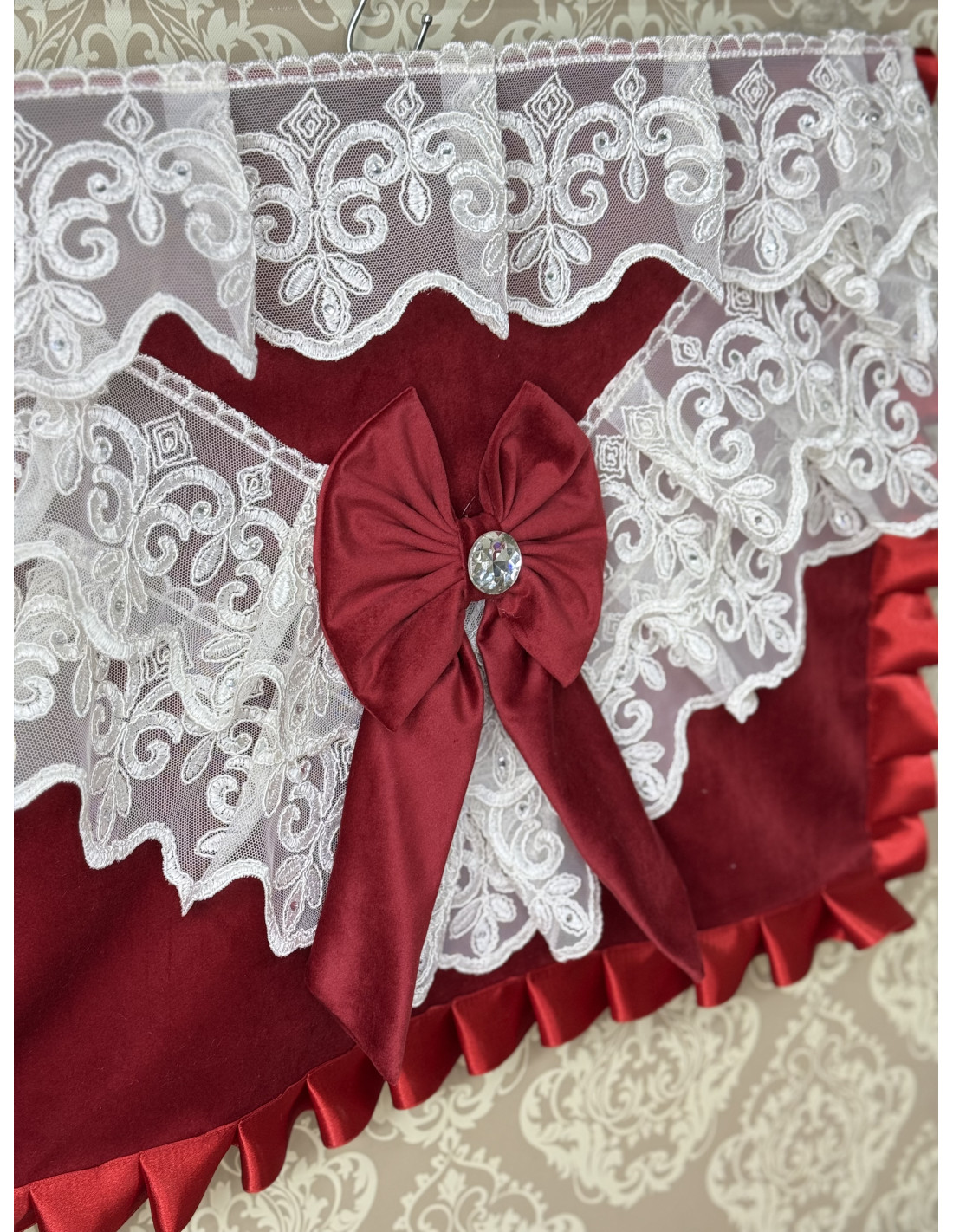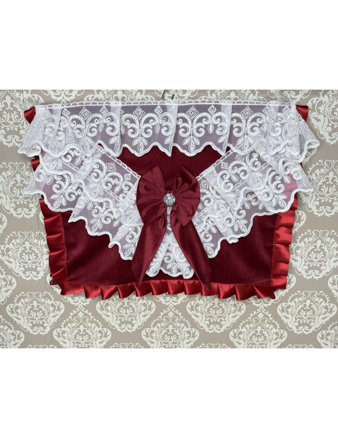 Copri forno in velluto avorio e plissè intorno.Il prodotto presenta una tripla balza di tulle in avorio e panna e un fioccone in velluto con swarovsky. Il forno ha una molla dietro che si inserisce all'apertura dello stesso. Il prezzo comprende solo il copri forno