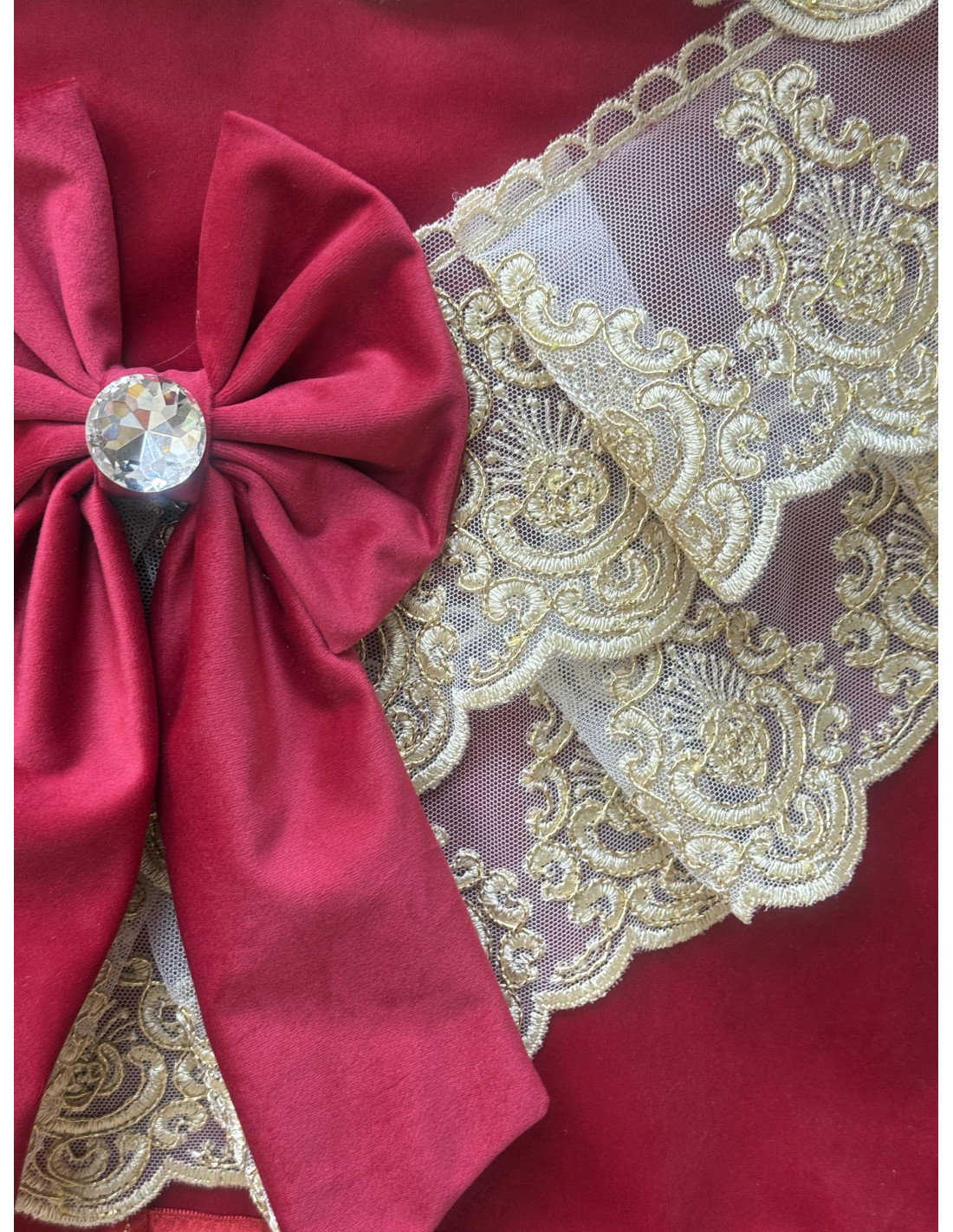 Copri forno in velluto avorio e plissè intorno.Il prodotto presenta una tripla balza di tulle oro LUREX e un fioccone in velluto con swarovsky. Il forno ha una molla dietro che si inserisce all'apertura dello stesso. Il prezzo comprende solo il copri forno