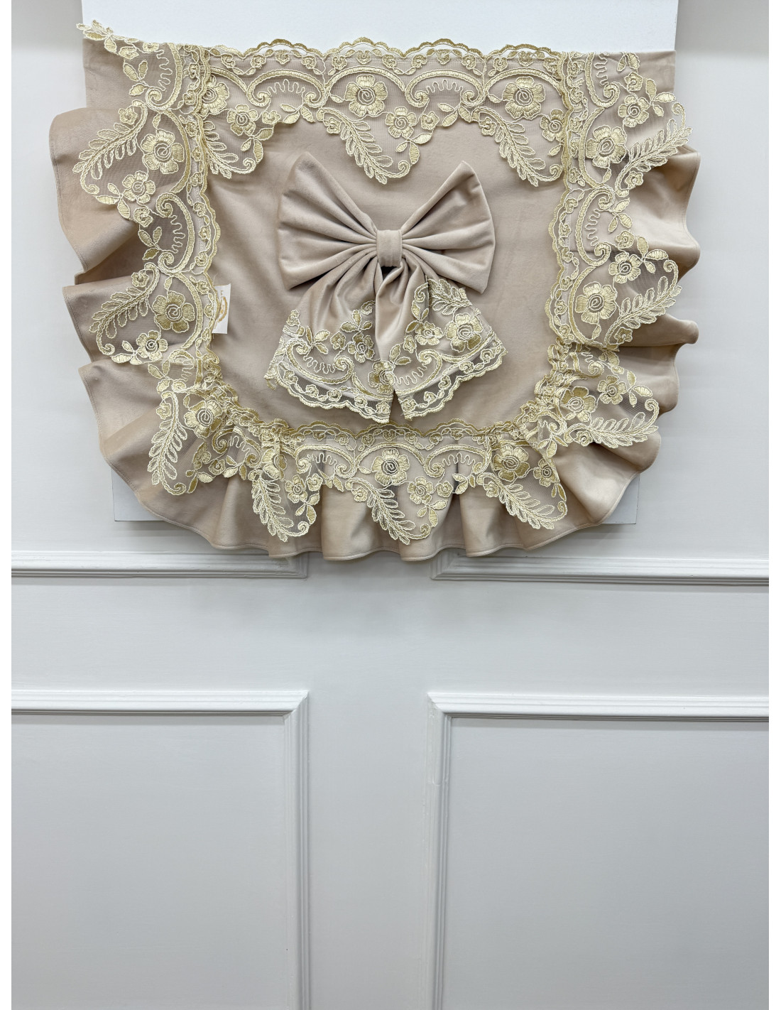 Elegante copriforno realizzato in morbido velluto, impreziosito da una raffinata balza in velluto e pizzo rebrodé lungo il contorno e da un fioccone centrale con code e dettagli in rebrodé.