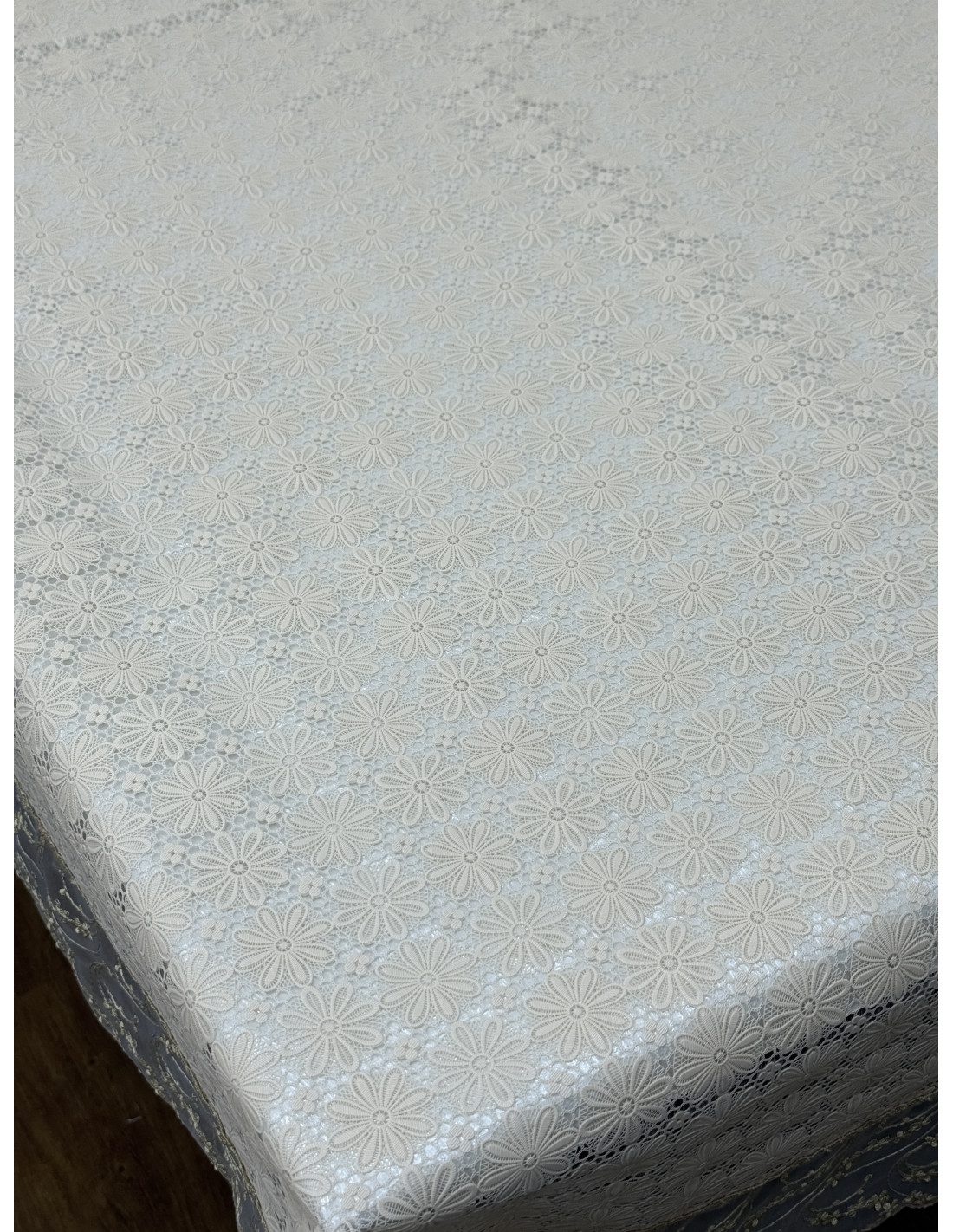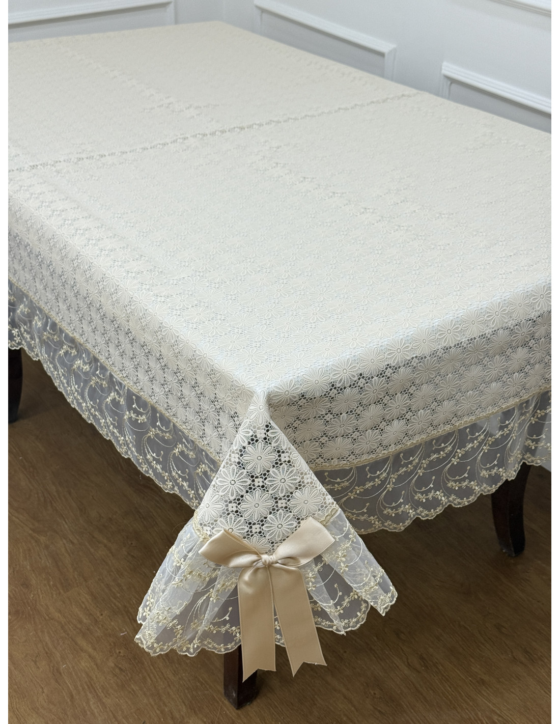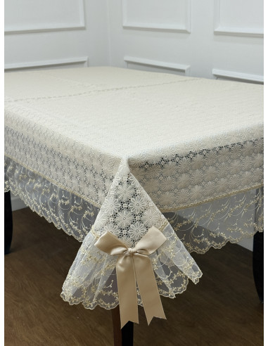 Tovaglia in plastica avorio, rifinita merletto avorio e fiocchi grandi avorio.