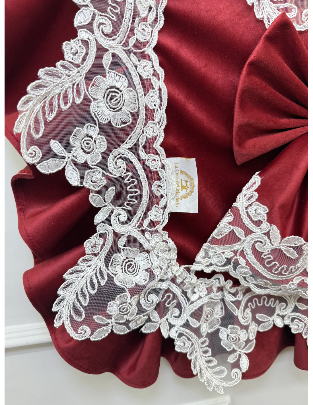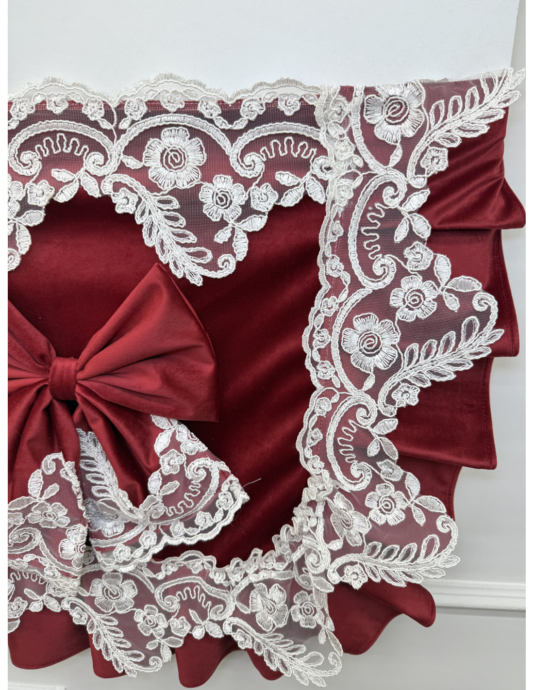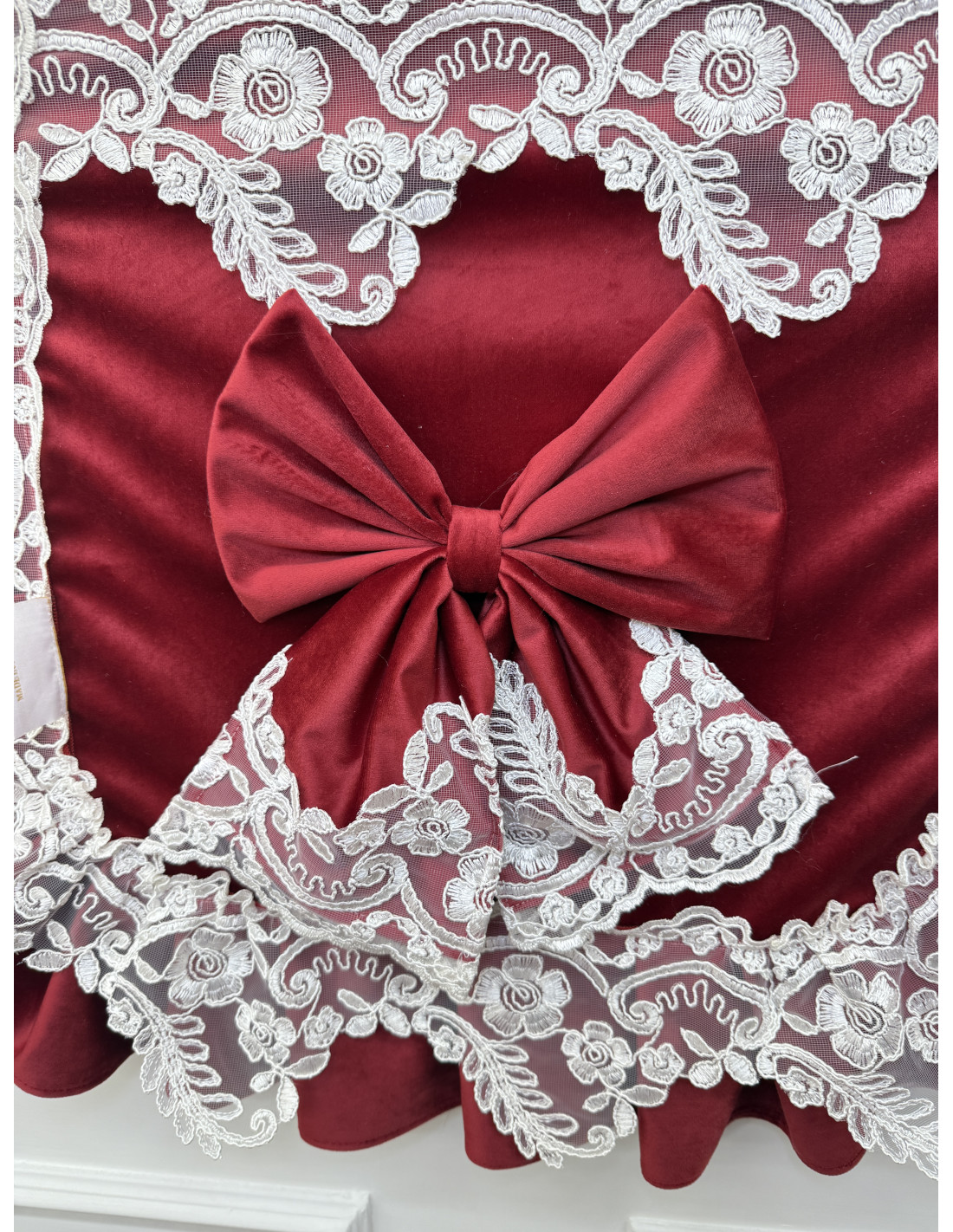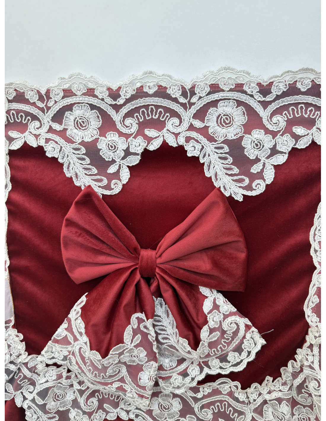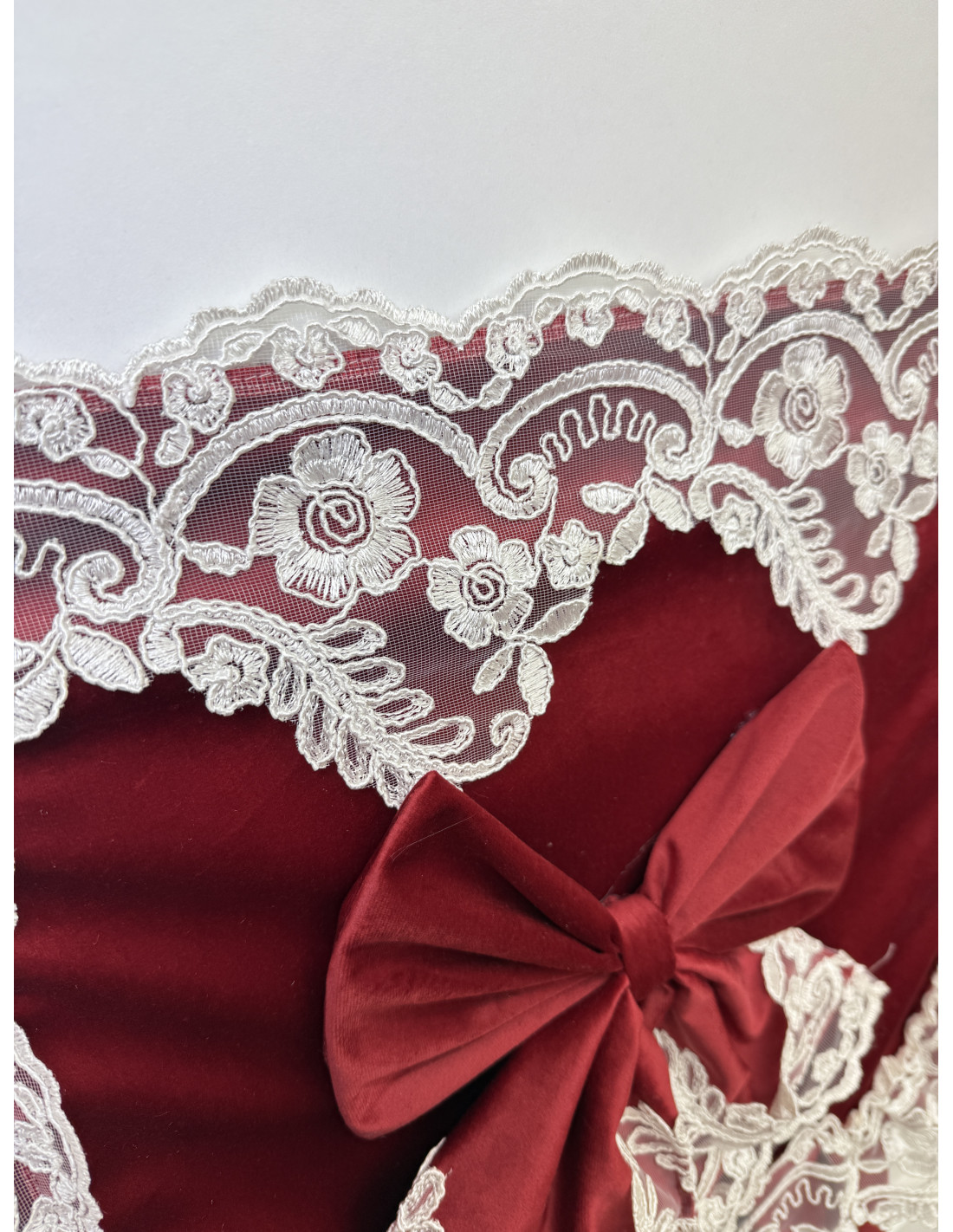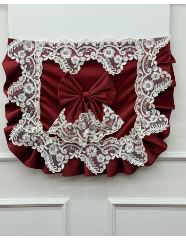 Elegante copriforno realizzato in morbido velluto, impreziosito da una raffinata balza in velluto e pizzo rebrodé lungo il contorno e da un fioccone centrale con code e dettagli in rebrodé.