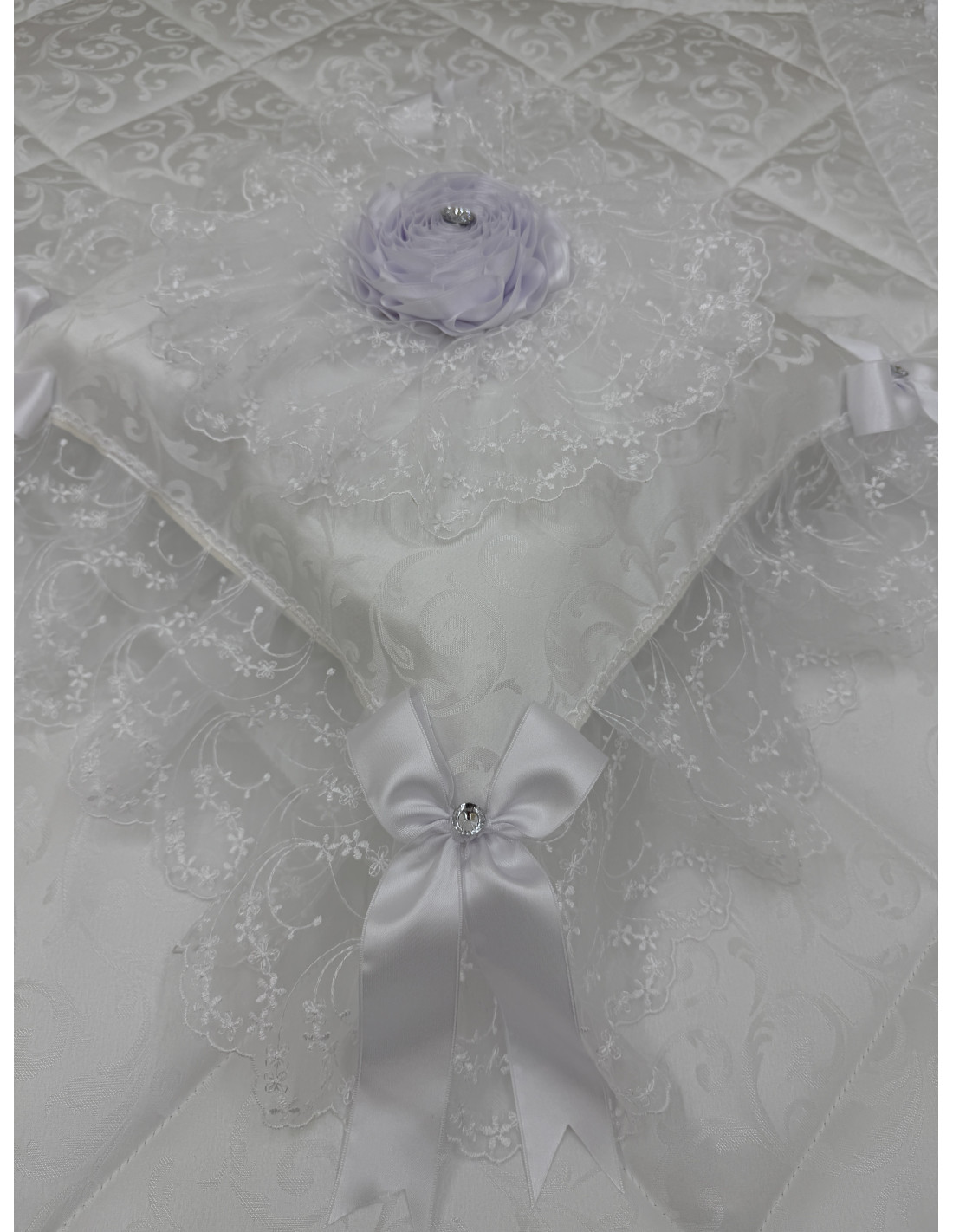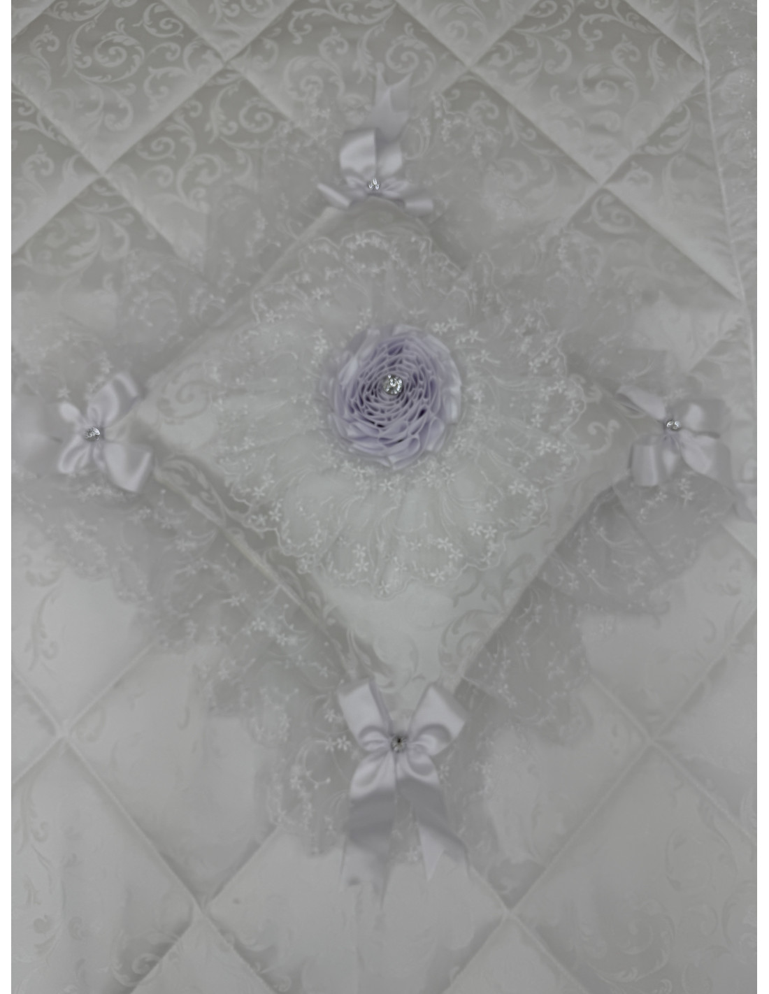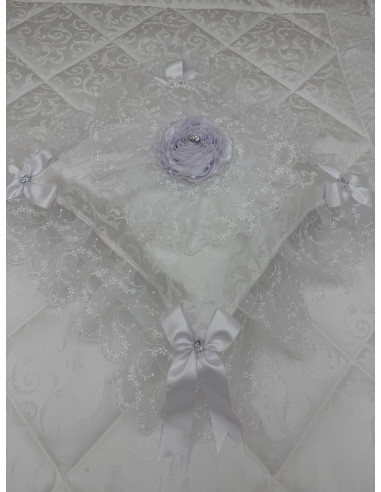 Cuscino in stoffa bianca con organza. Il prodotto si presenta rifinito intorno con tulle e fiocchi grandi, mentre al centro una coccarda con con rosone in raso.