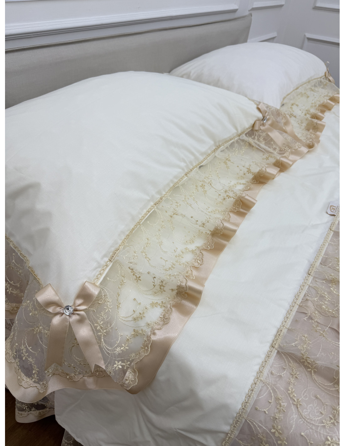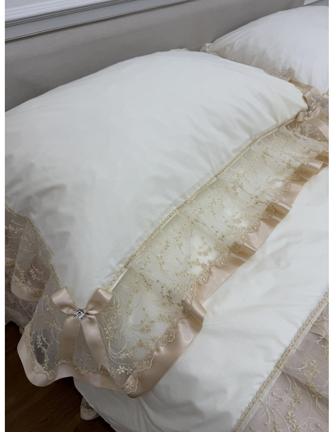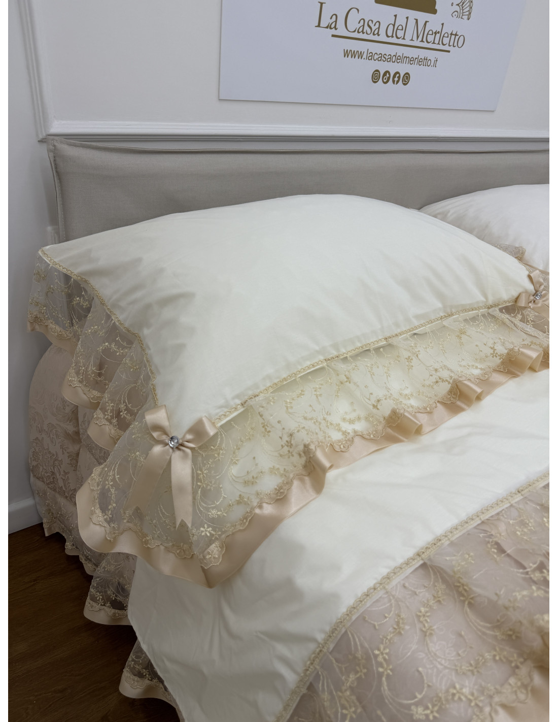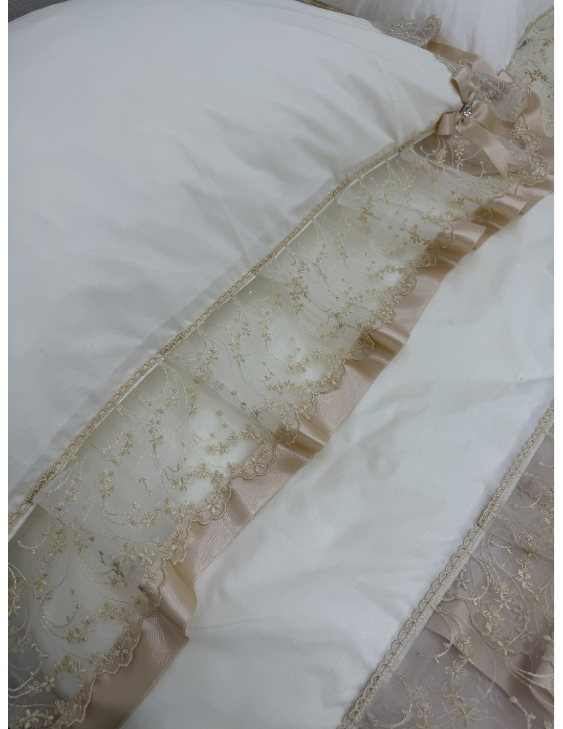Completo letto in cotone avorio, composto da un lenzuolo sotto CM 175x200+25, lenzuolo sopra CM 240x290 e due federe di guanciali 50x80 più ricamo, tutto rifinito con merletto in organza avorio e fiocchi in avorio