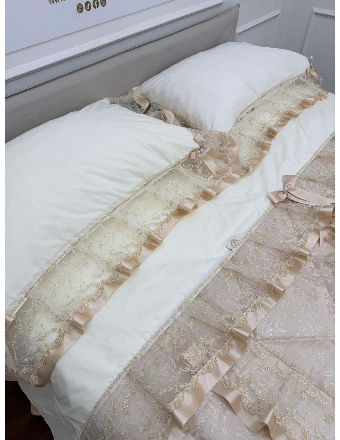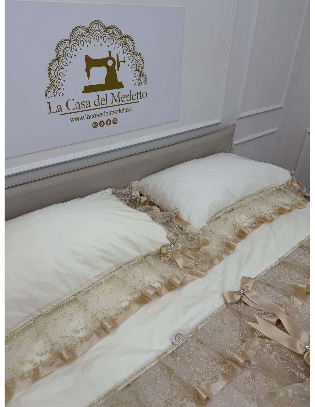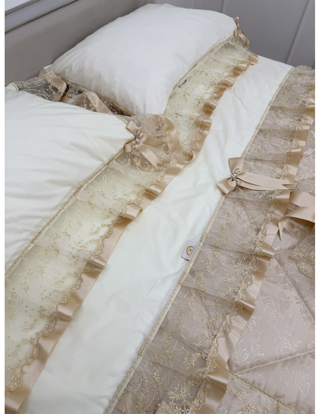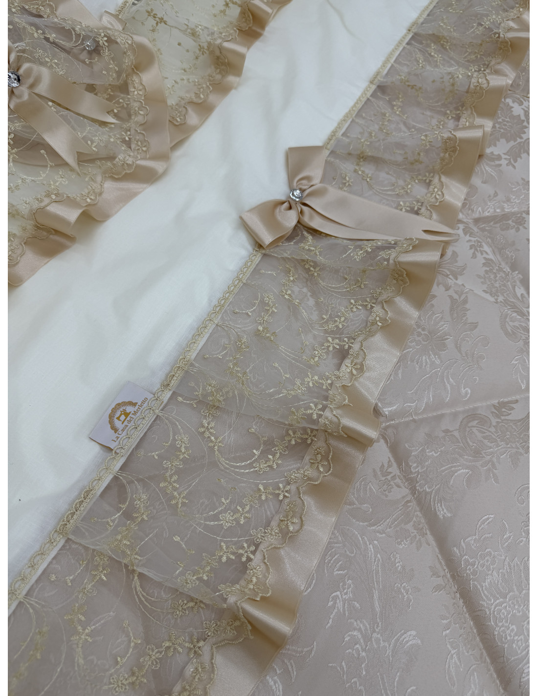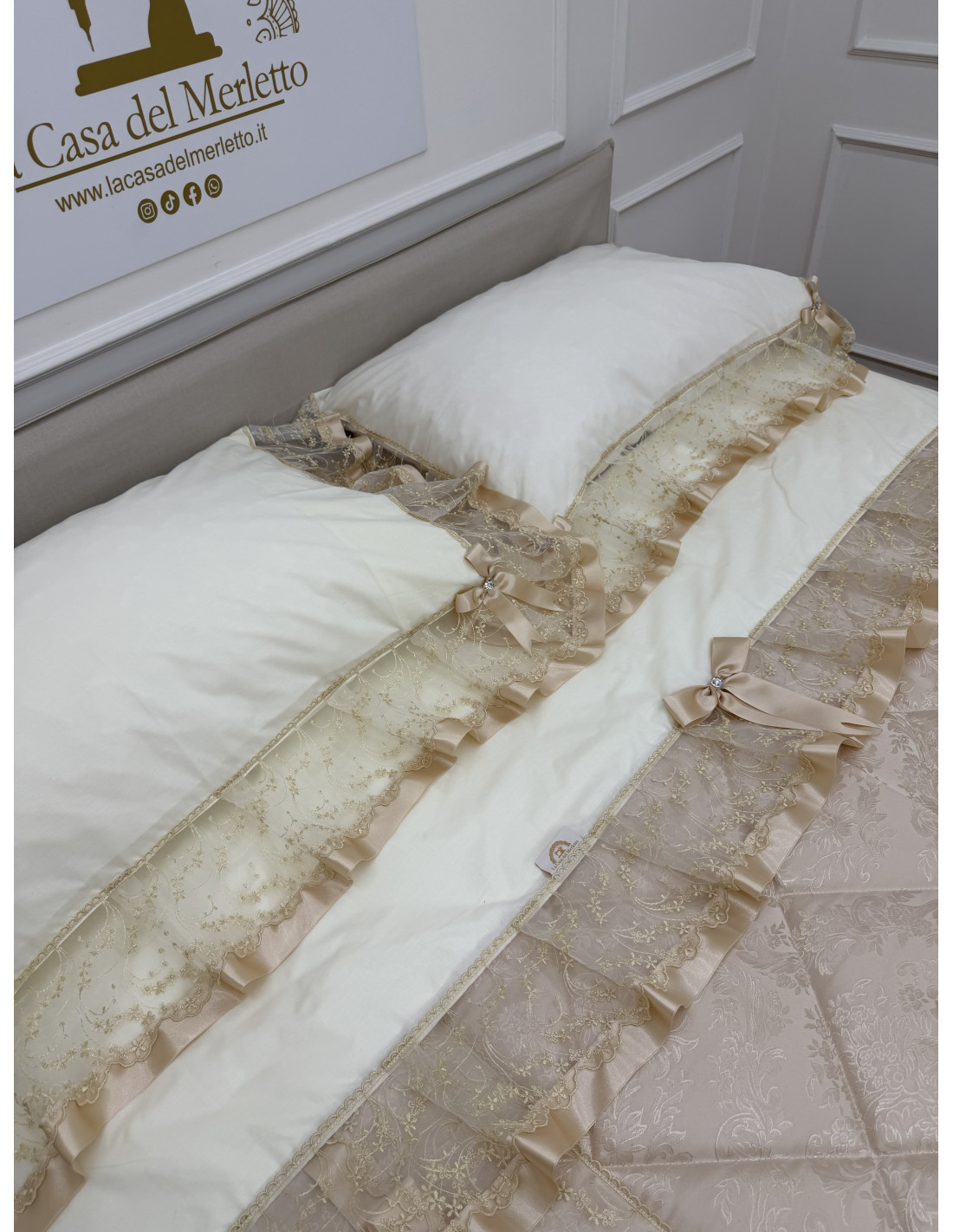 Completo letto in cotone avorio, composto da un lenzuolo sotto CM 175x200+25, lenzuolo sopra CM 240x290 e due federe di guanciali 50x80 più ricamo, tutto rifinito con merletto in organza avorio e fiocchi in avorio