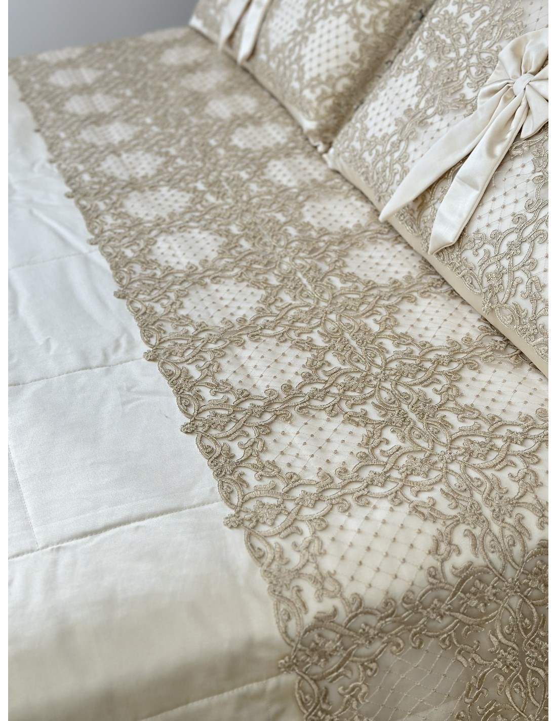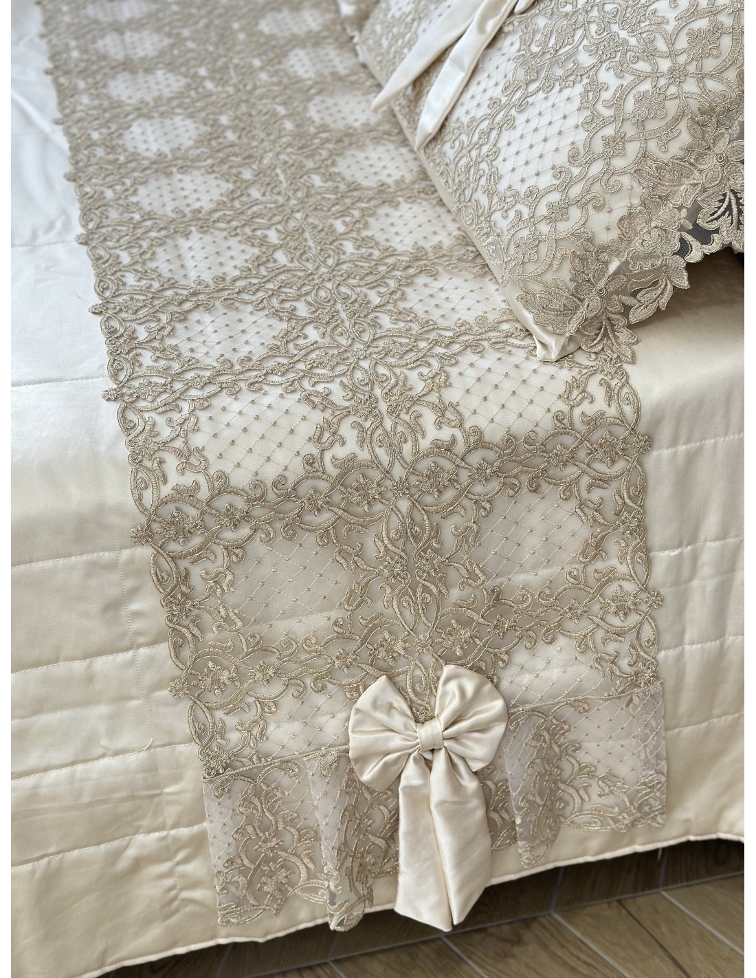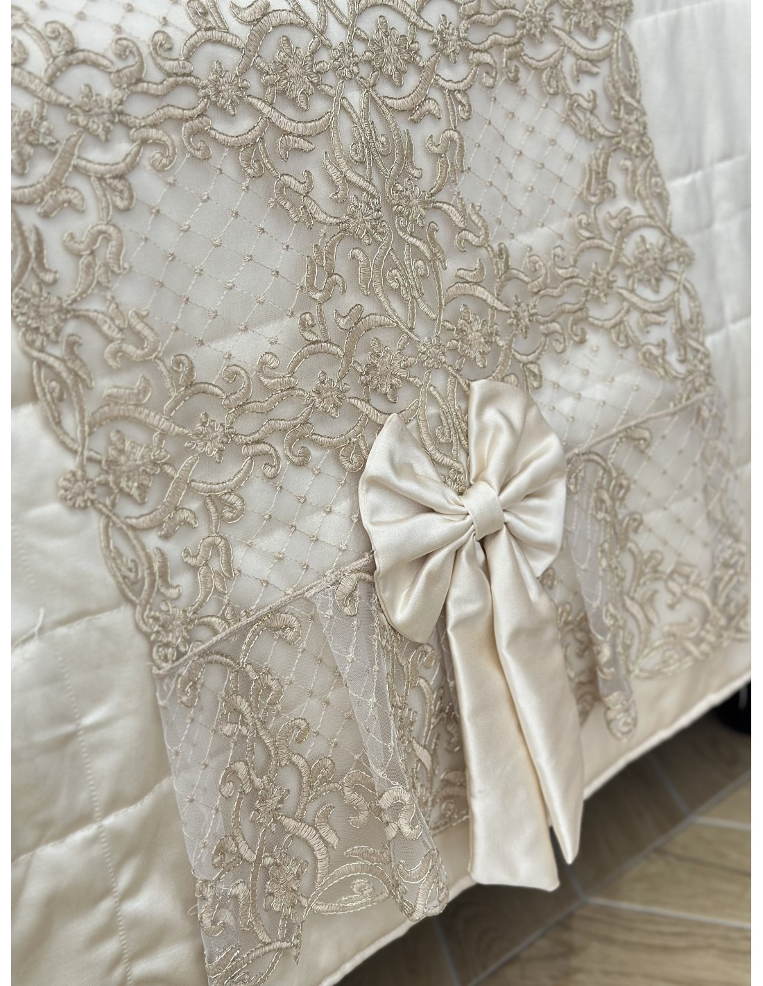 La finta balza lenzuolo applicabile su qualsiasi copriletto o trapunta per impreziosirla si presenta in tulle avorio e oro LUREX rifinita con fiocchi in raso, che richiama il coordinato.