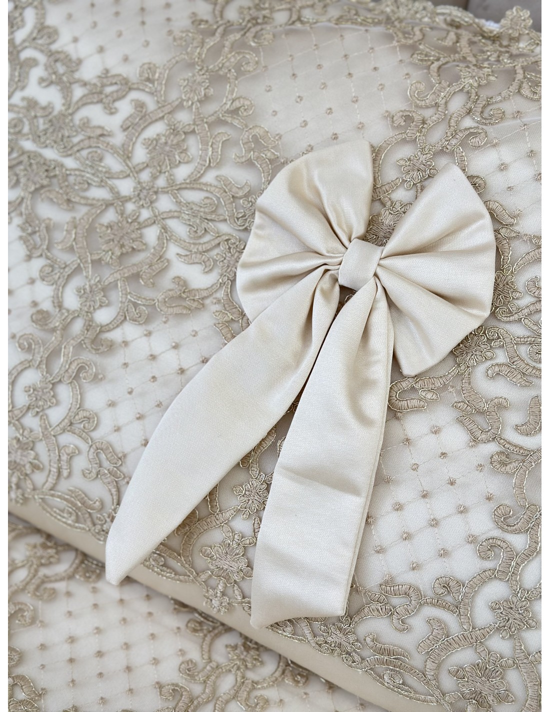 Il completo dei guanciali si presenta con stoffa in raso e tulle lurex avorio e oro, rifinito con fiocchi in raso centrali.
