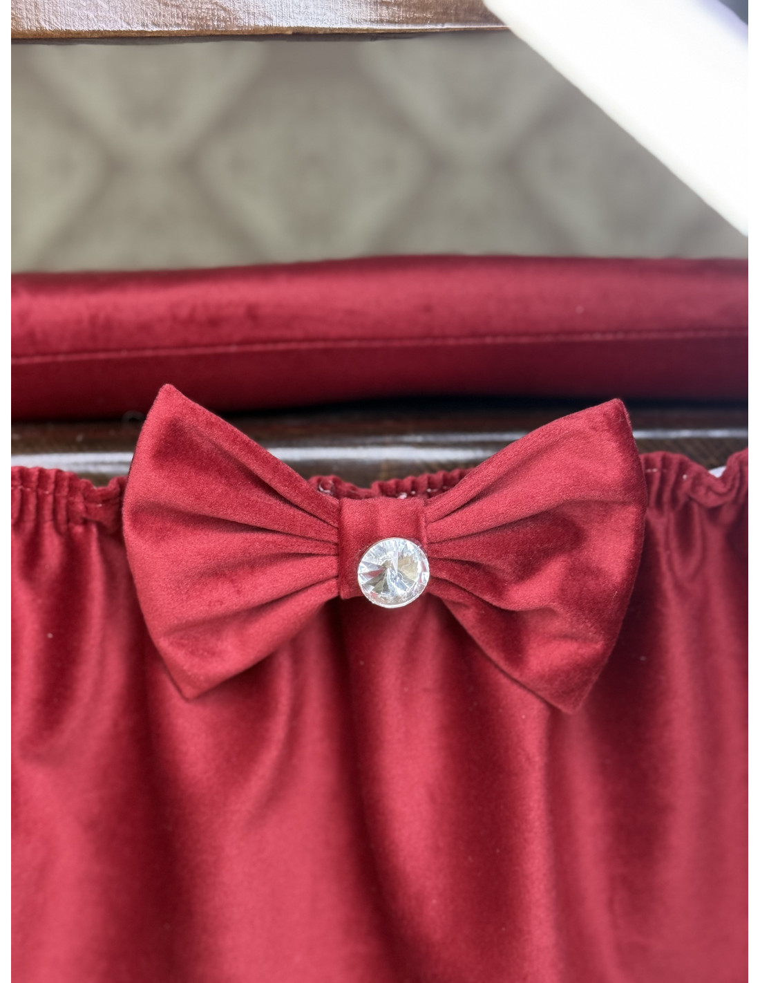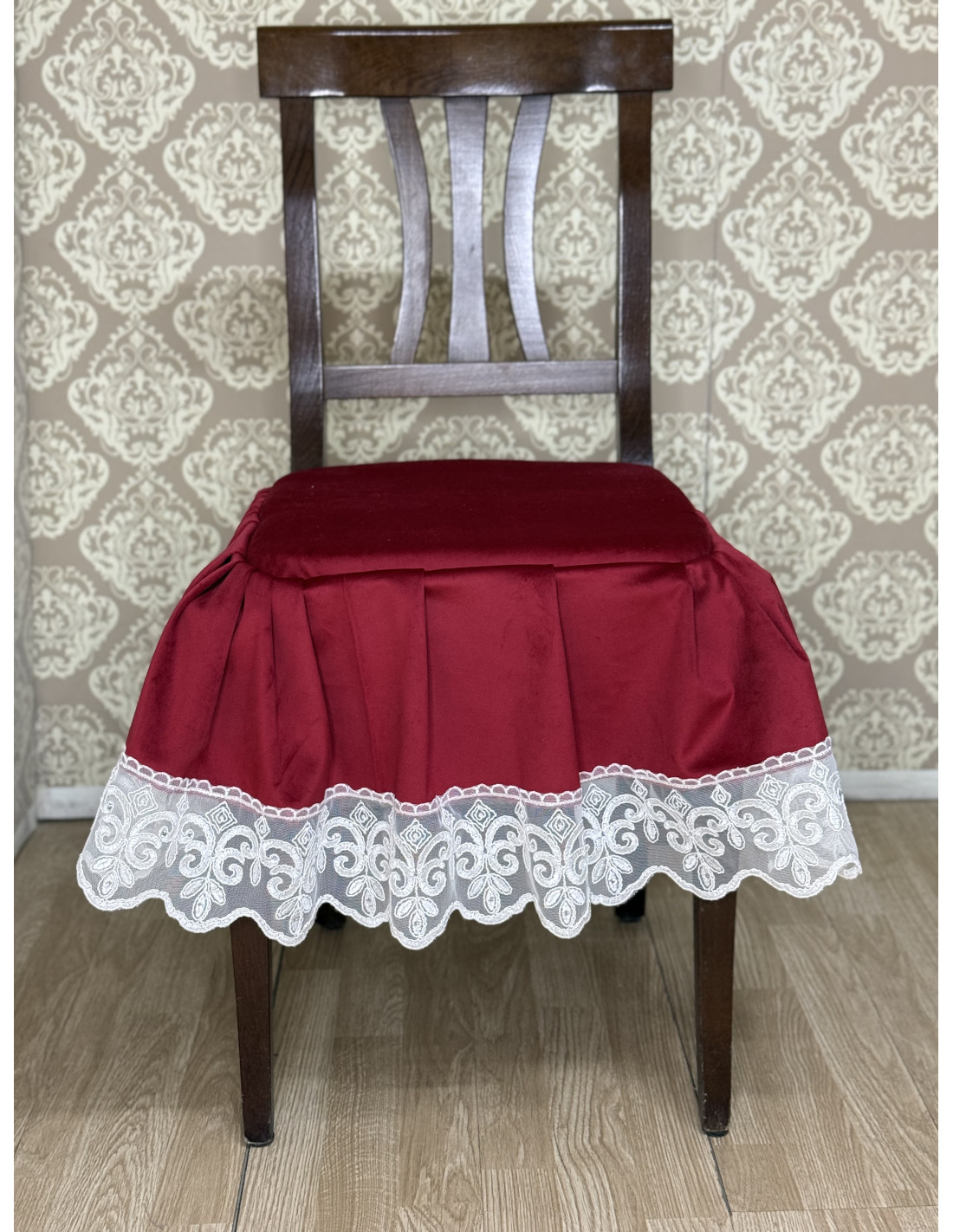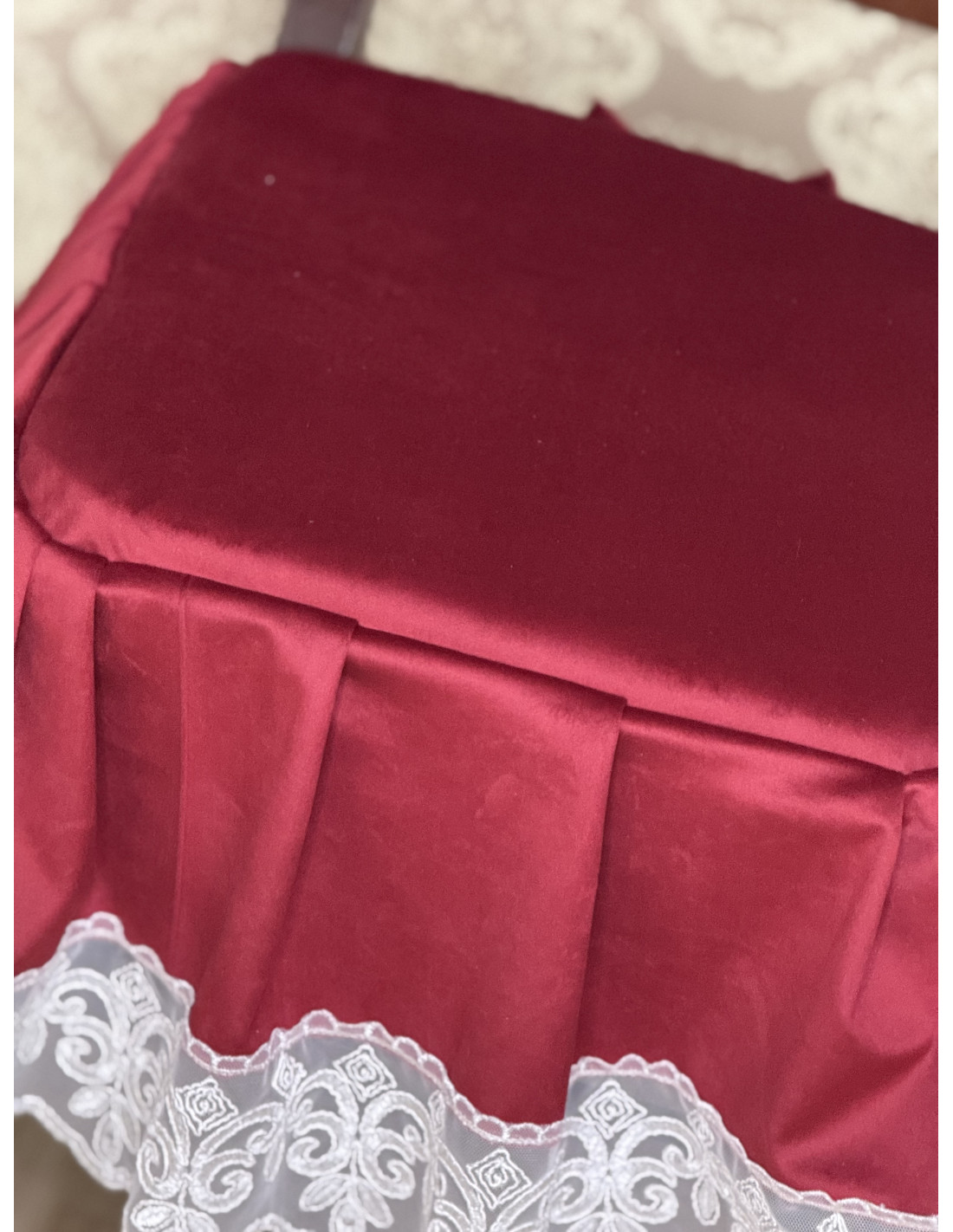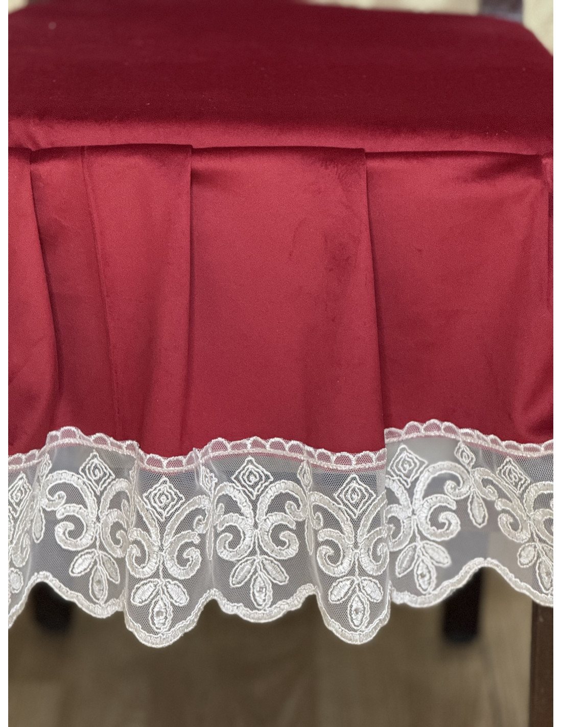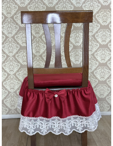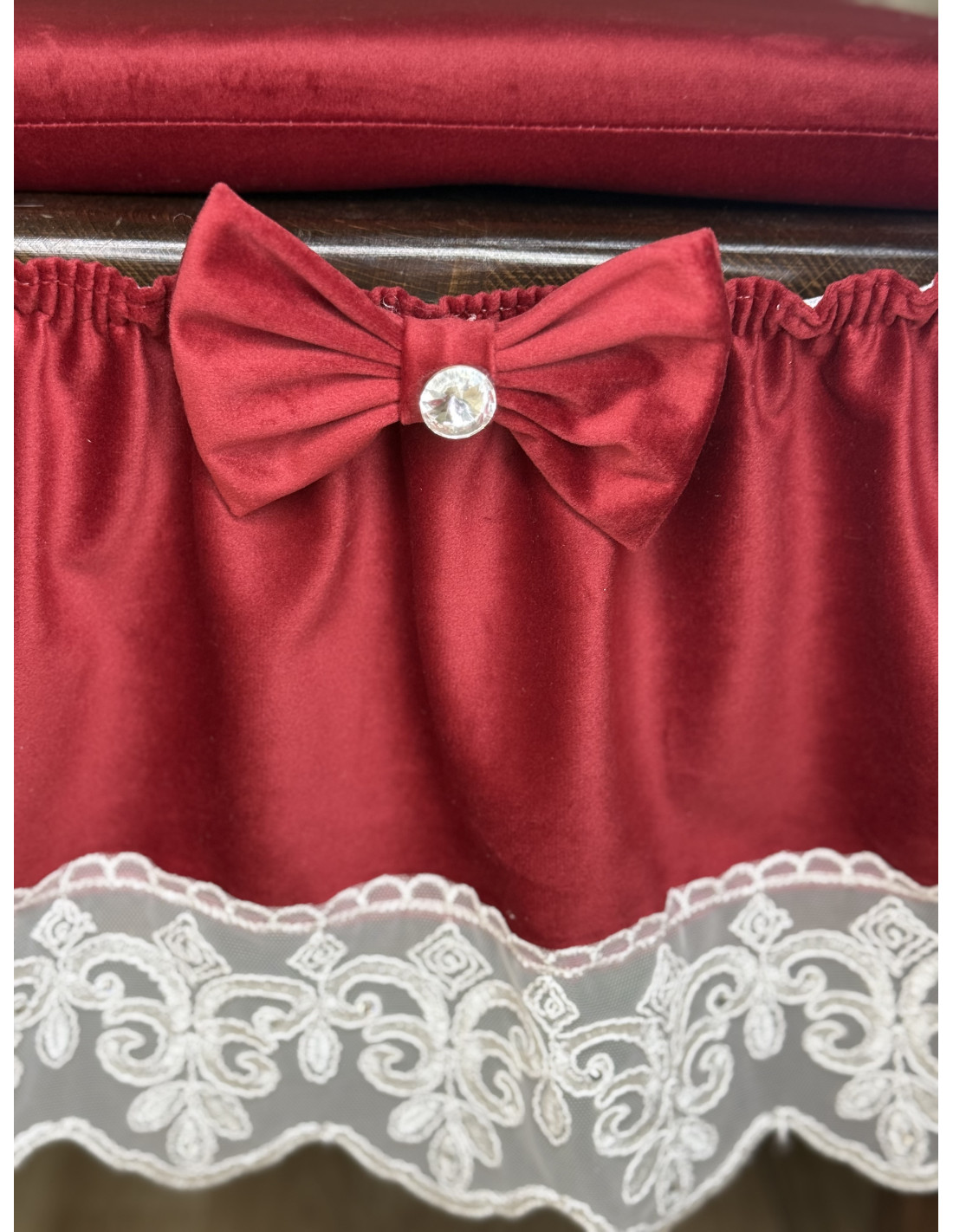 Copri sedia comprende solo la seduta con velluto rosso, volà intorno con merletto panna, il prodotto si presenta con molla sul retro e un fiocco in velluto medio con Swarovski
