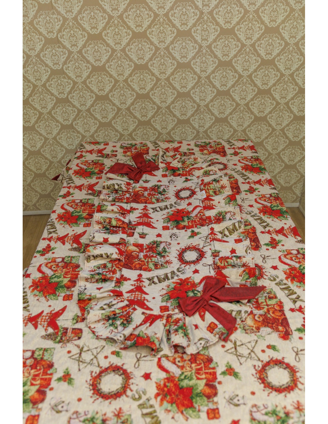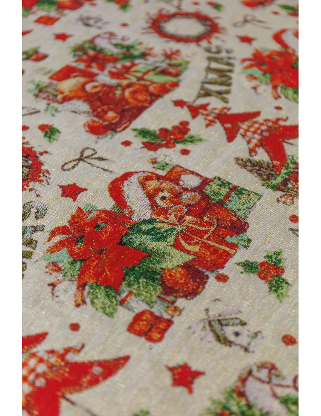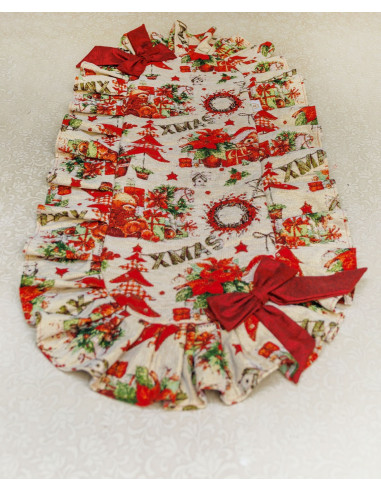 Runner in stoffa natalizia laminata e volá in stoffa , rifinito con fiocchi rossi