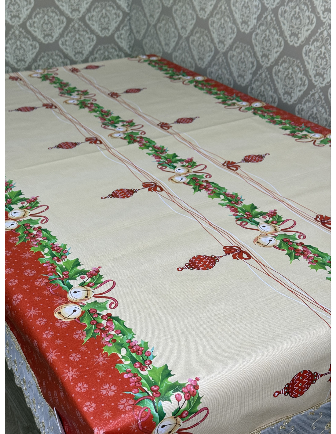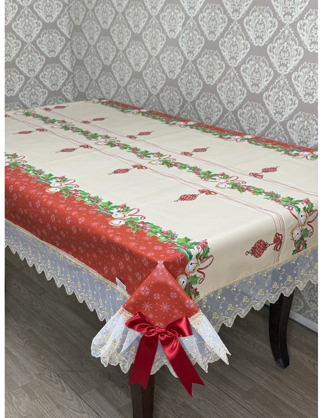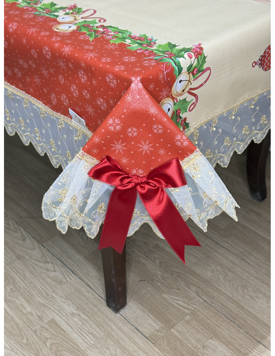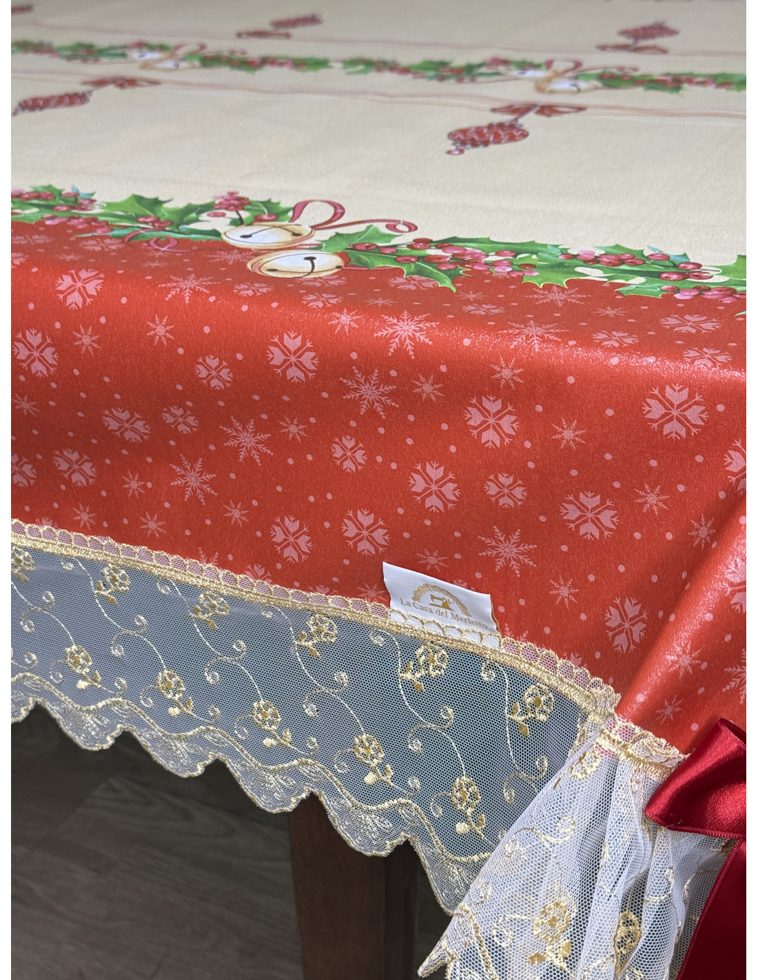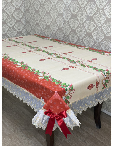 Tovaglia in plastica impermeabile rossa  rifinita con tulle oro oro e fiocchi rossi