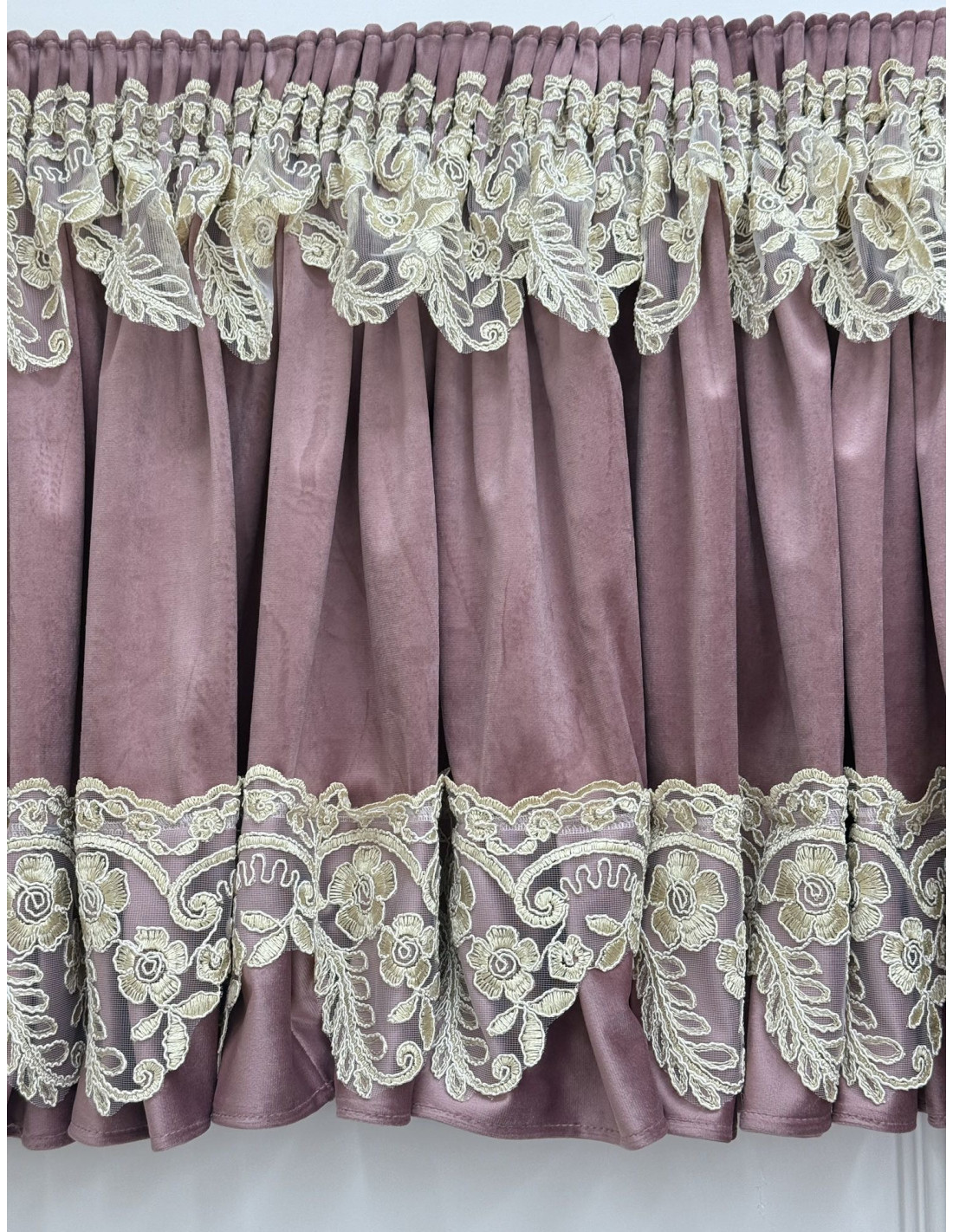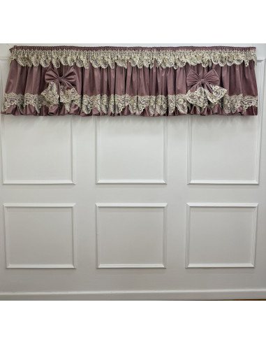 Mantovana velluto rosa, rifinita con vola’ e rebrode avorio , con fiocconi in velluto e rebrode con spilla sul retro . Il prodotto si presenta con 2.80 mt di stoffa cucita su una fascia regolabilile adesiva che permette la sua arricciatura. E' adattabile a bastoni fino a 2.00 mt se si vuole un risultato ricco come in foto, oppure la si può allargare completamente su bastoni più grandi fino a circa 2.80. La mantovana ha un altezza STANDARD di 65 cm