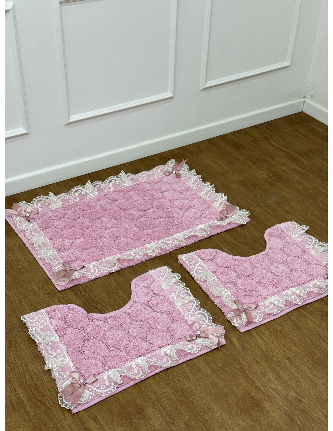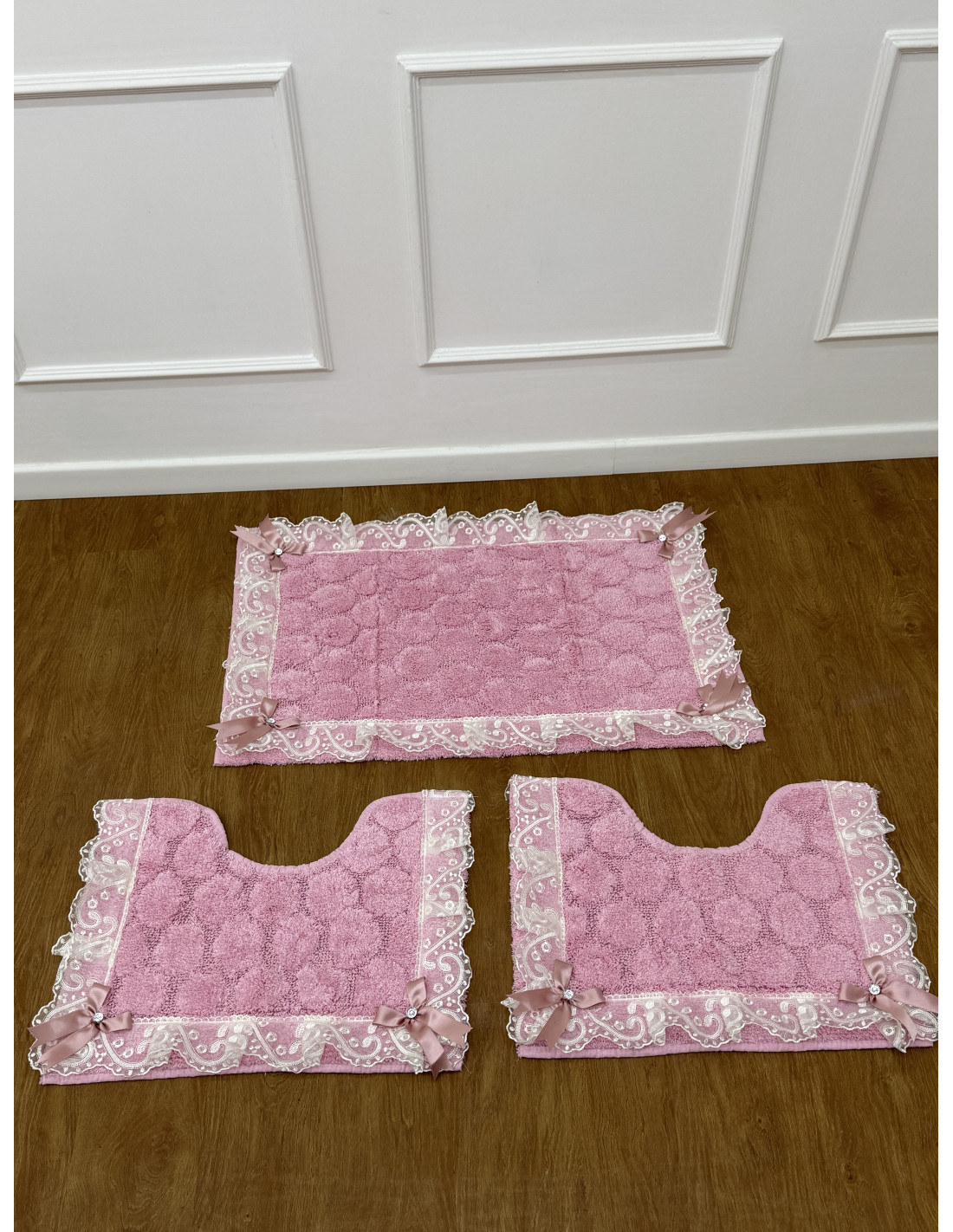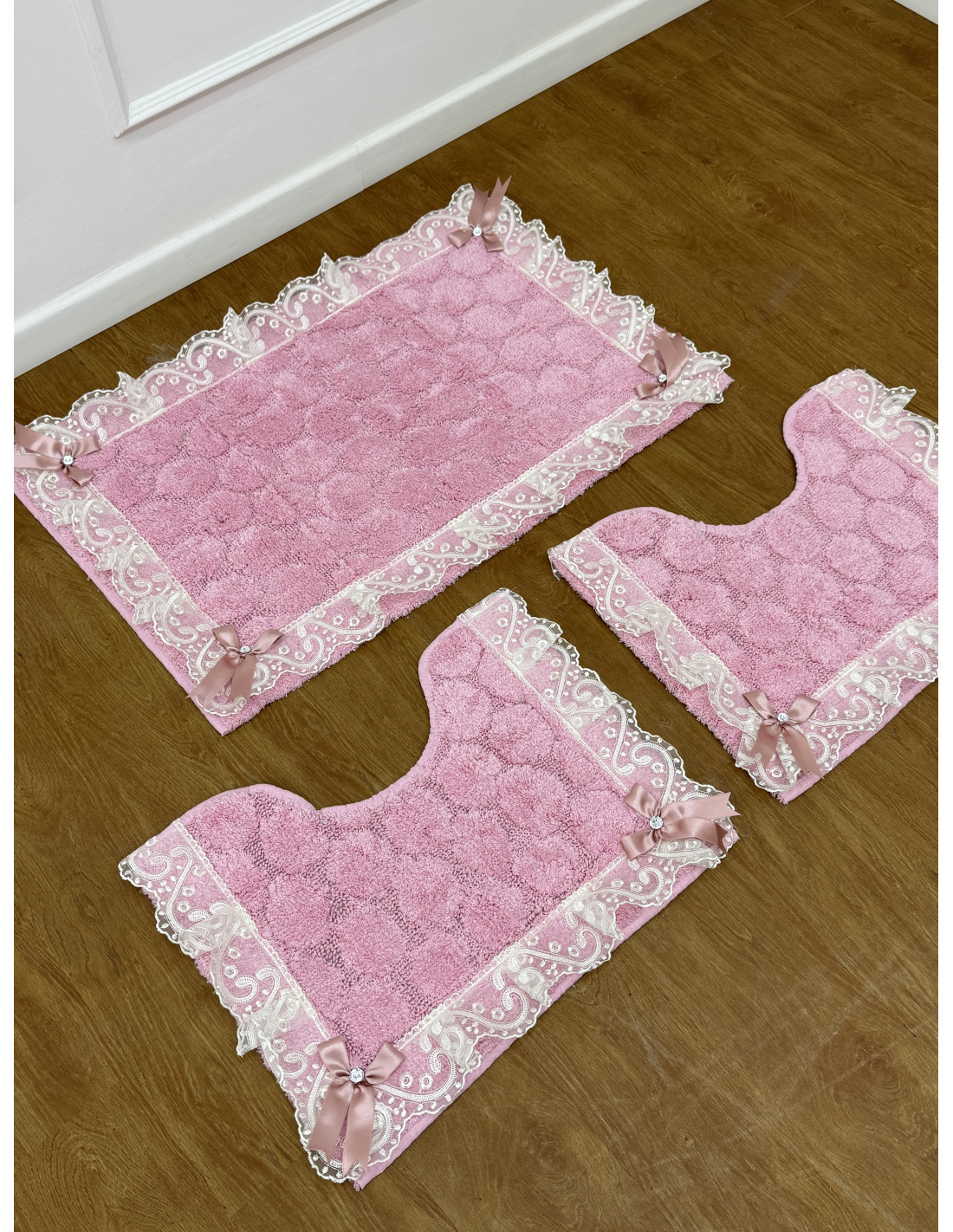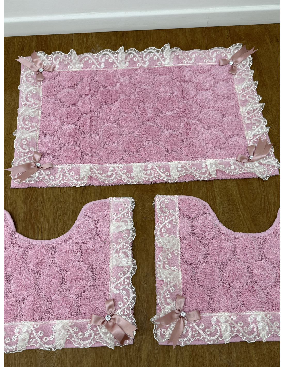 Tris tappeti in spugna rosa con rifinitura in merletto e fiocchi con Swarovski.Il tris e composto da un piccolo per water, un piccolo per bidet e un grande.