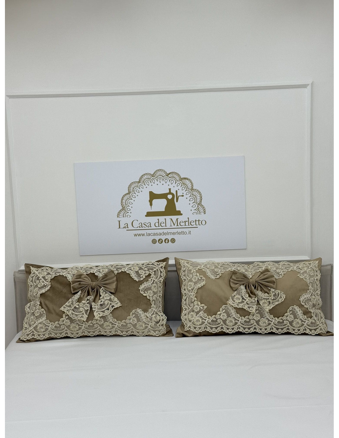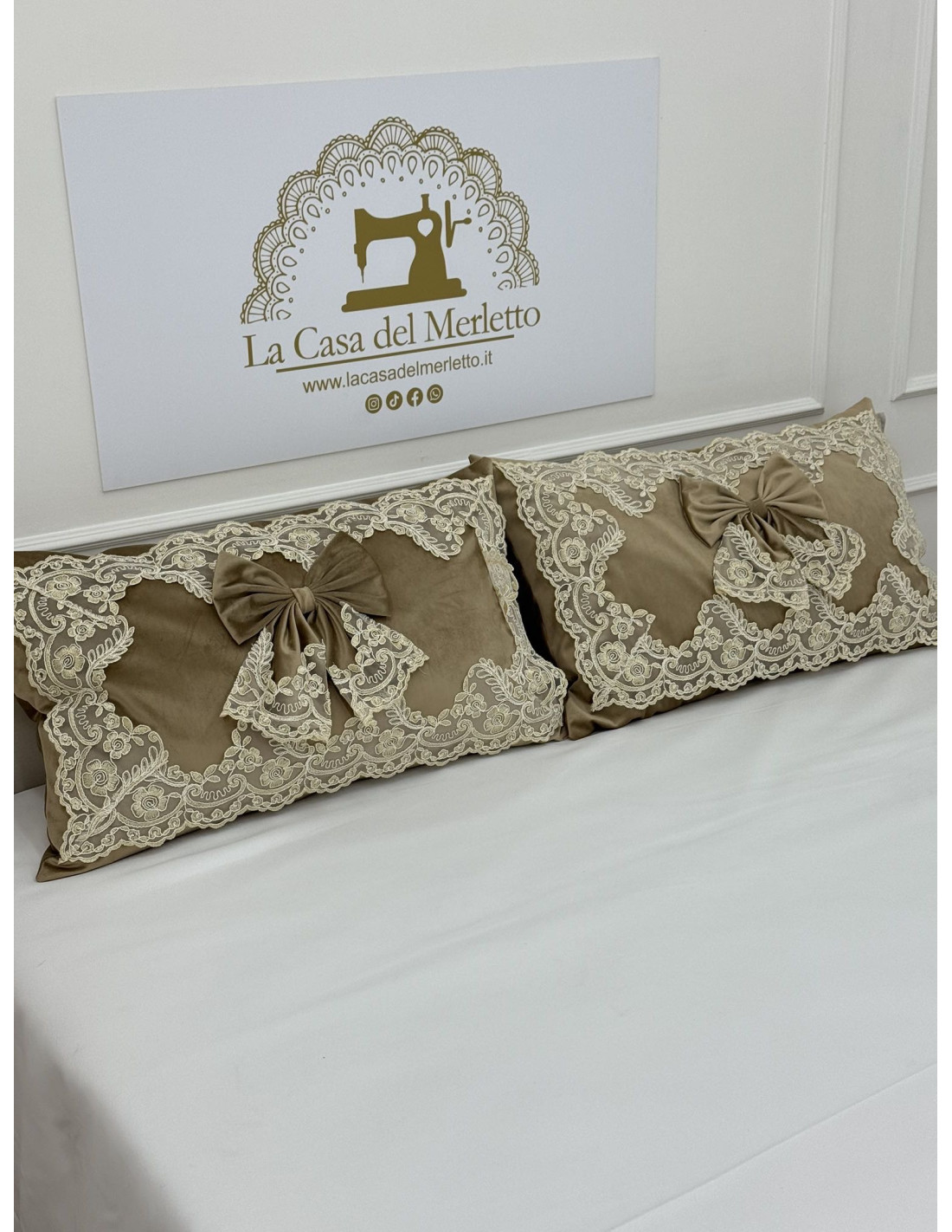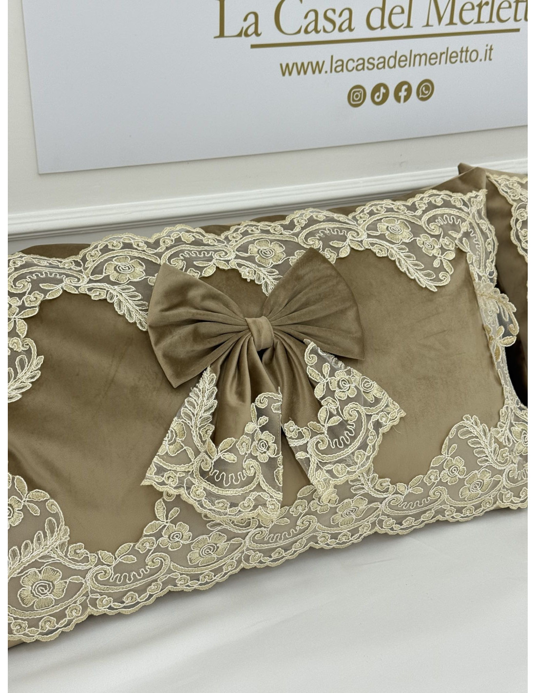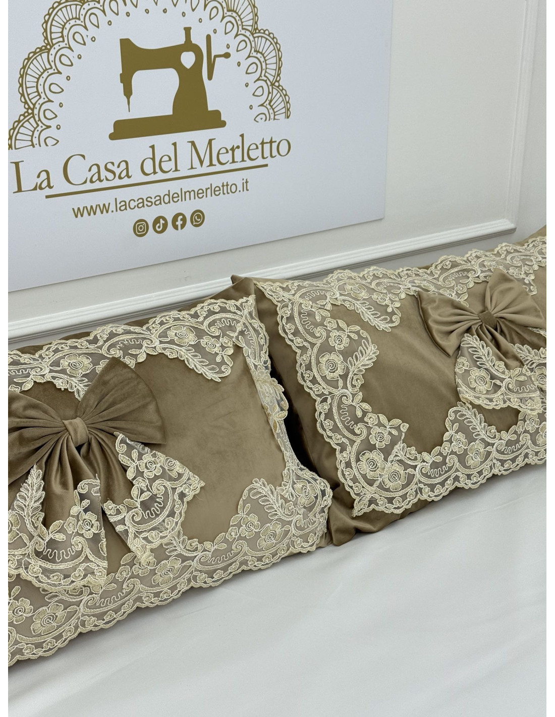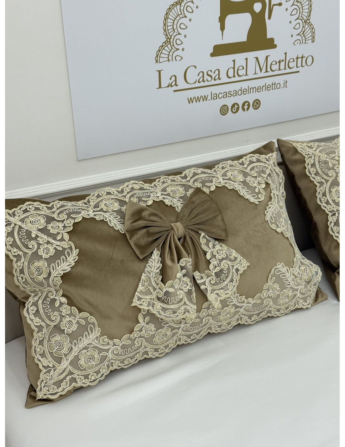 Realizzati in morbido velluto tortora e impreziositi da inserti in pregiato rebrodé avorio,, i guanciali 50x80 cm donano un tocco raffinato e luminoso al letto.