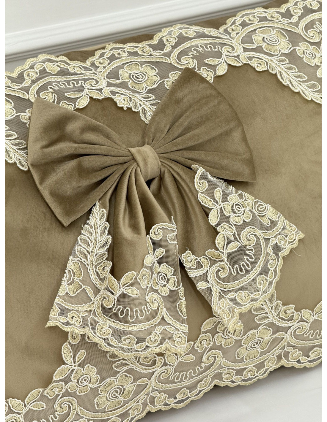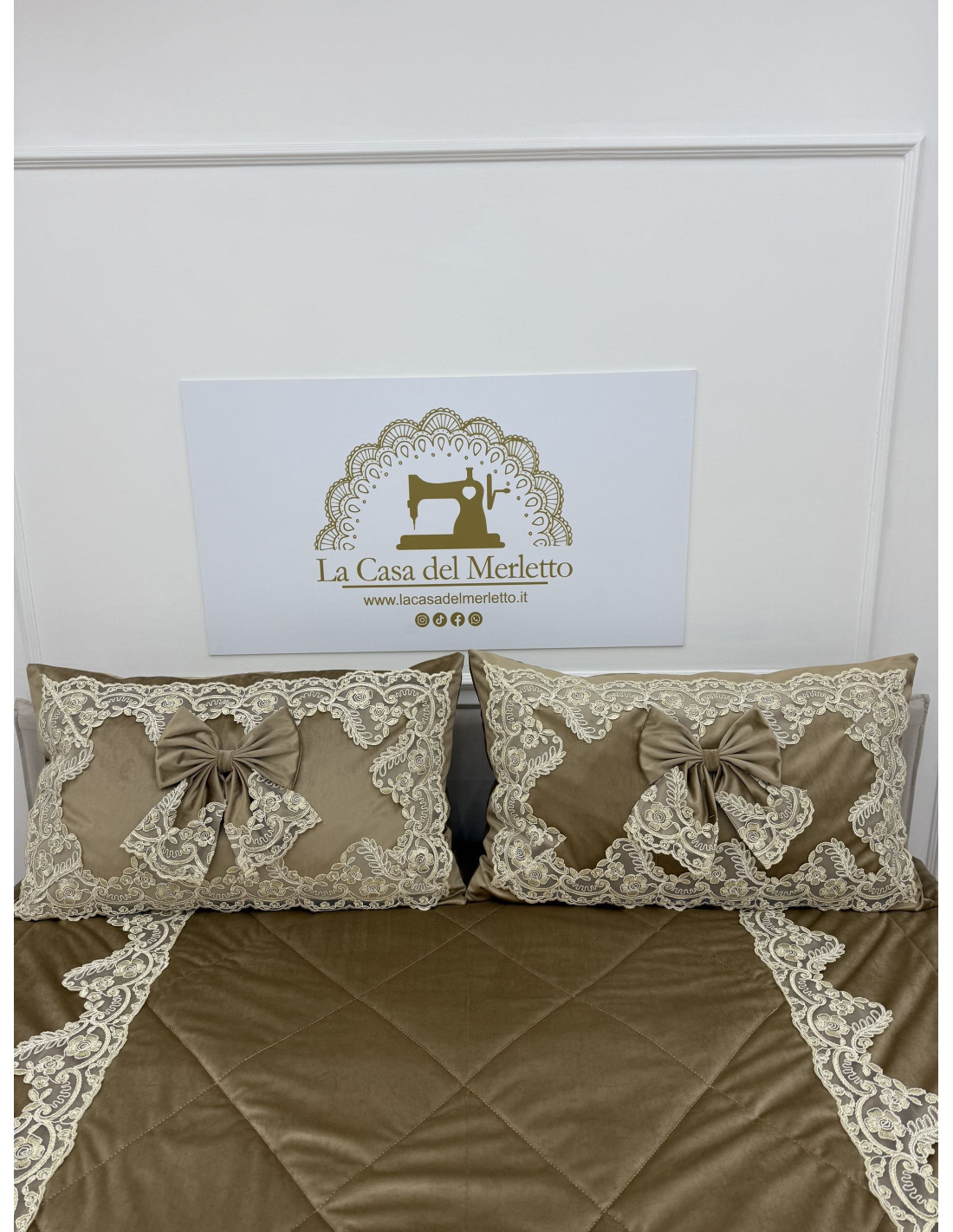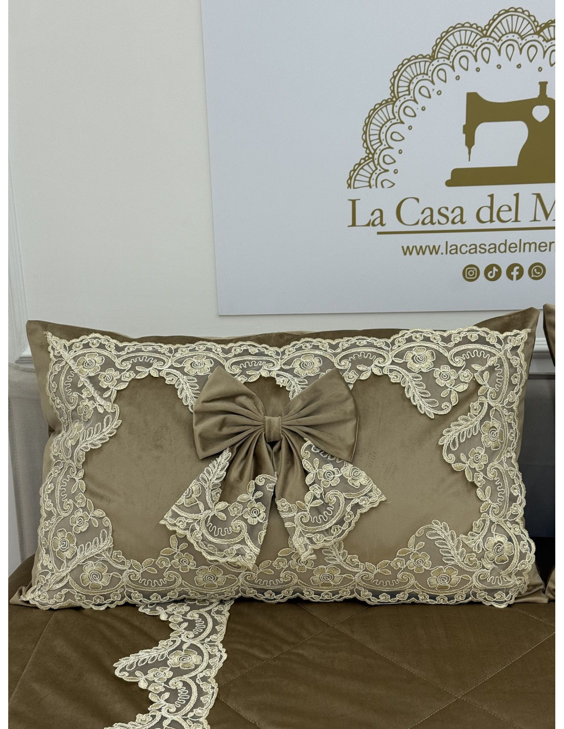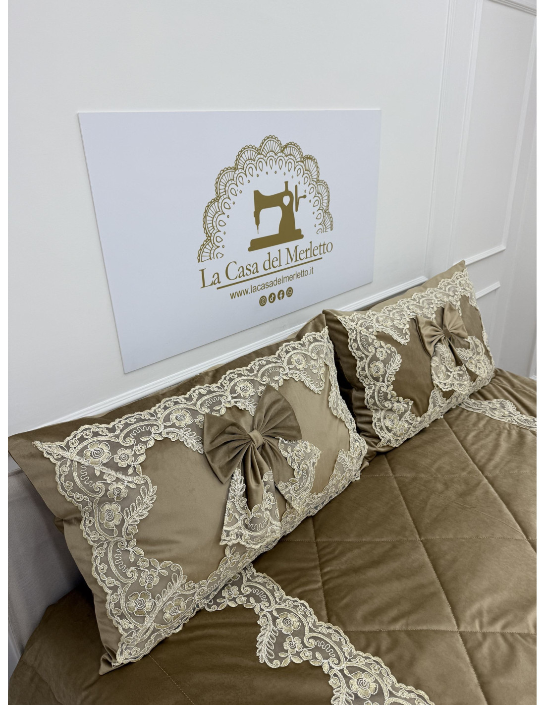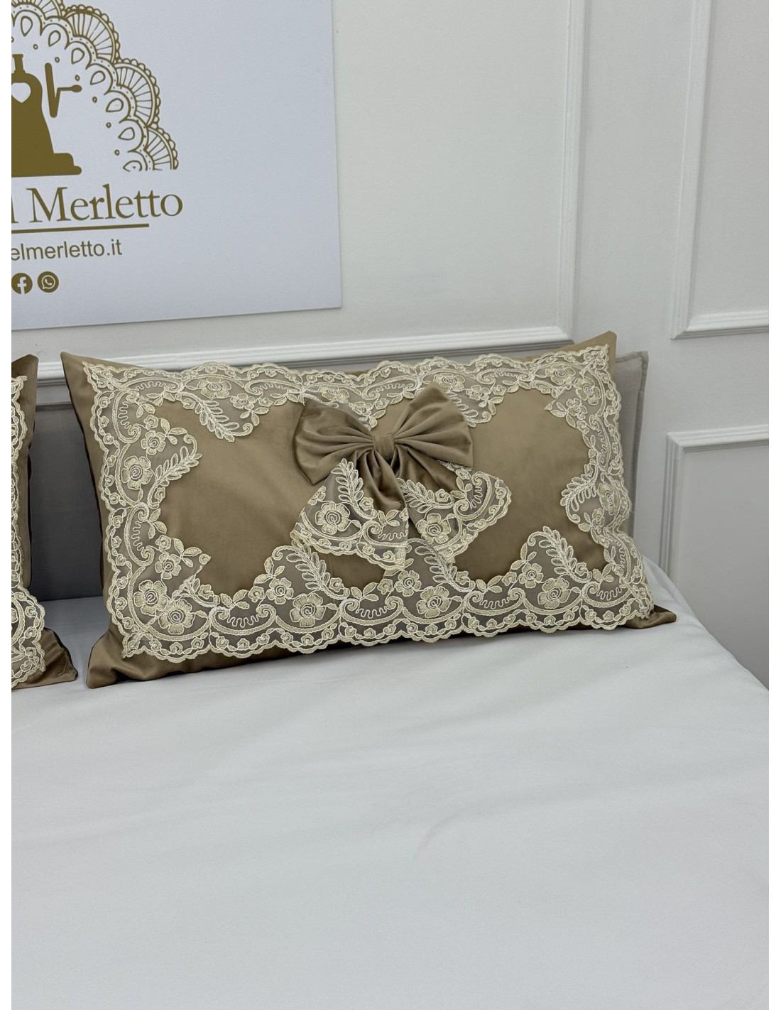Realizzati in morbido velluto tortora e impreziositi da inserti in pregiato rebrodé avorio,, i guanciali 50x80 cm donano un tocco raffinato e luminoso al letto.