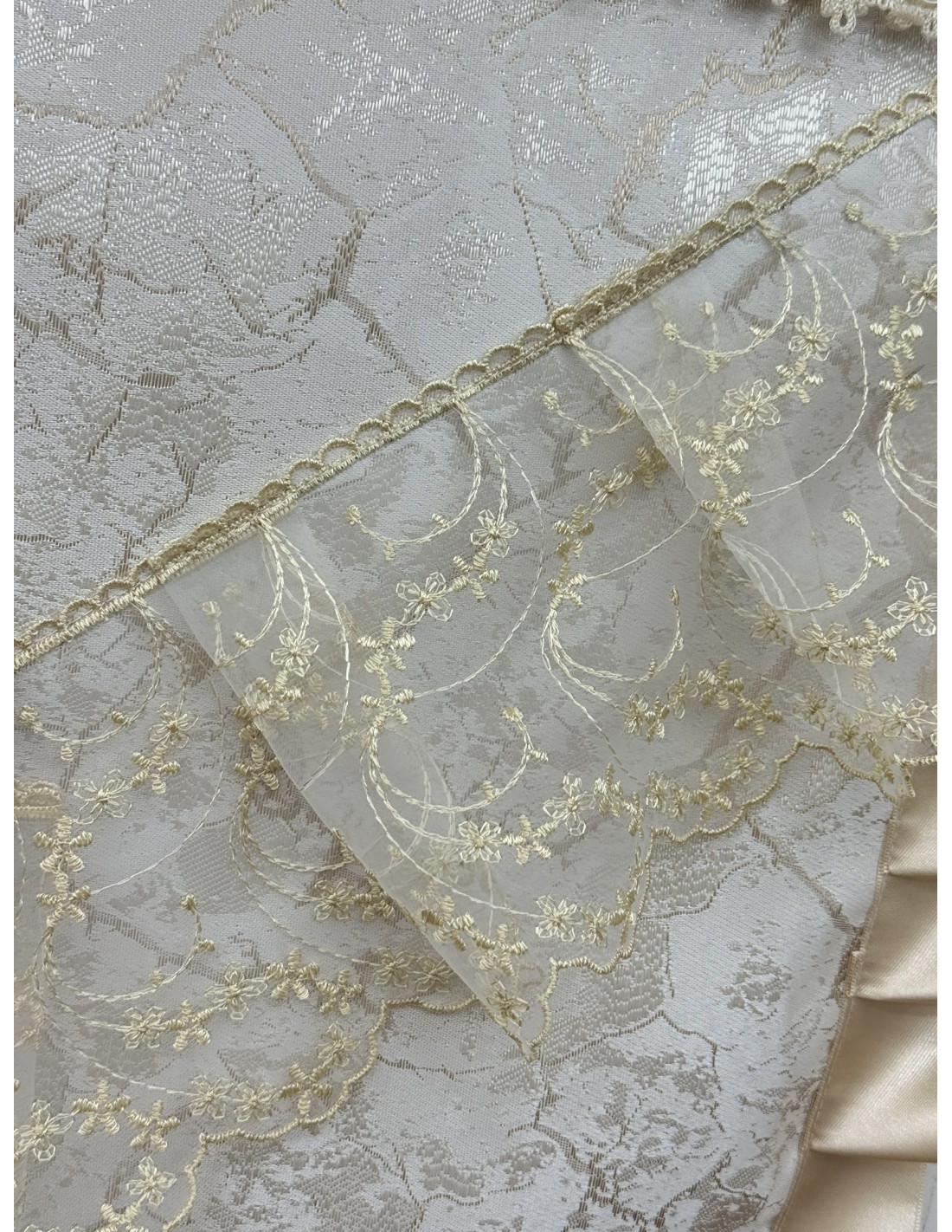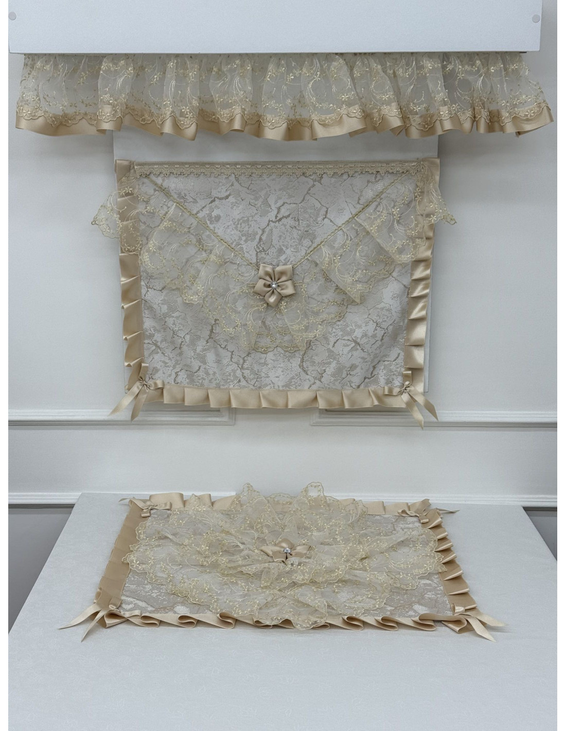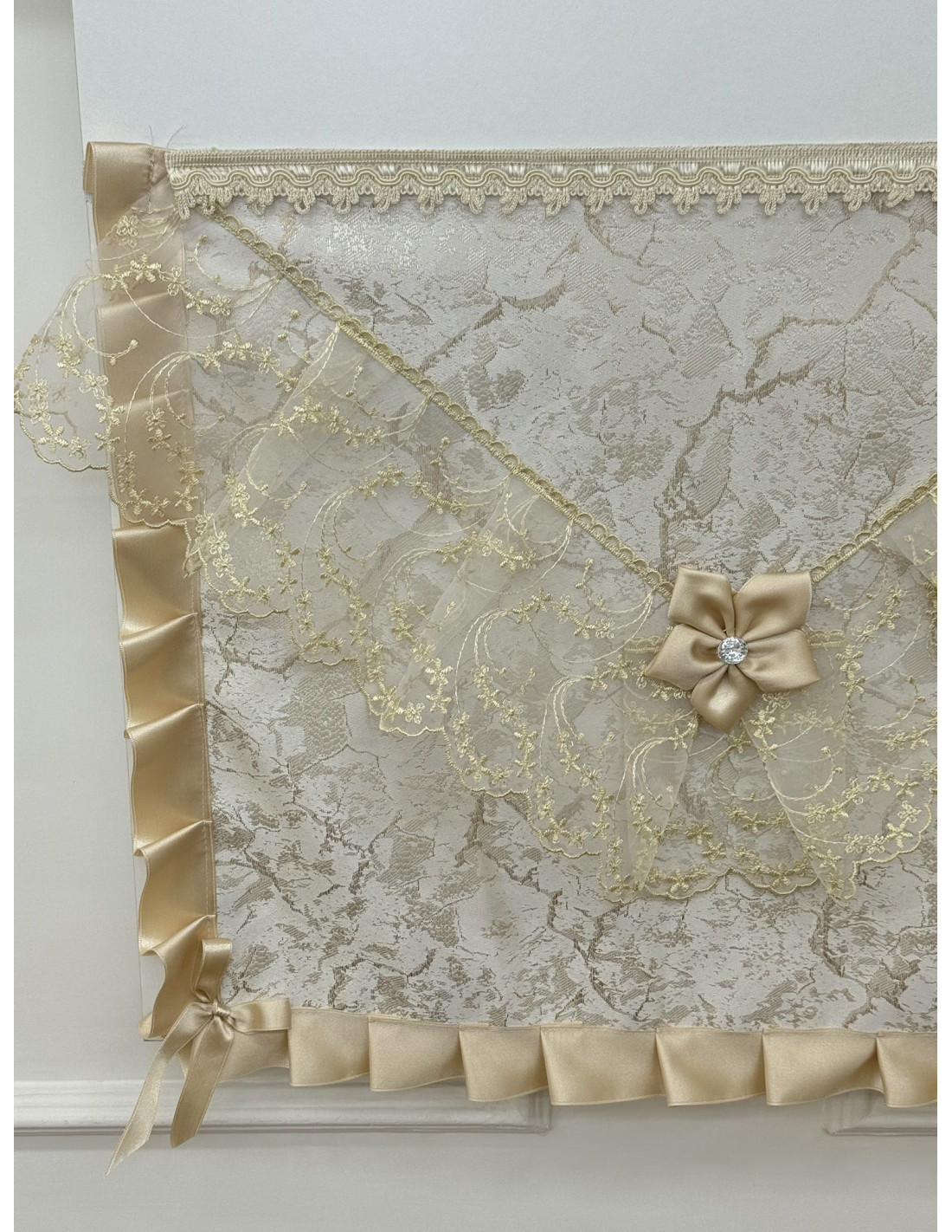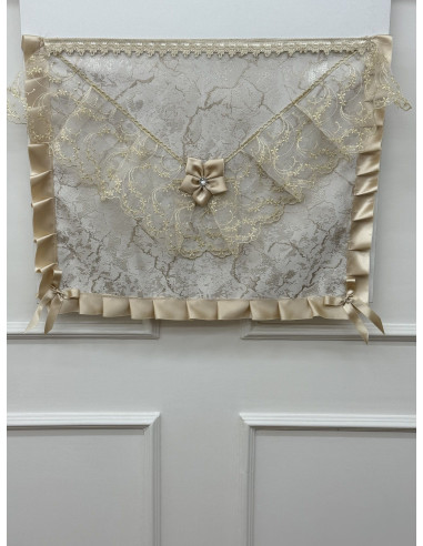 Copri forno in stoffa effetto marmo avorio con raso intorno. Il prodotto presenta una balza di organza, rifinito con fiocchi piccoli e stella centrale. Il forno ha una molla dietro che si inserisce all'apertura dello stesso.