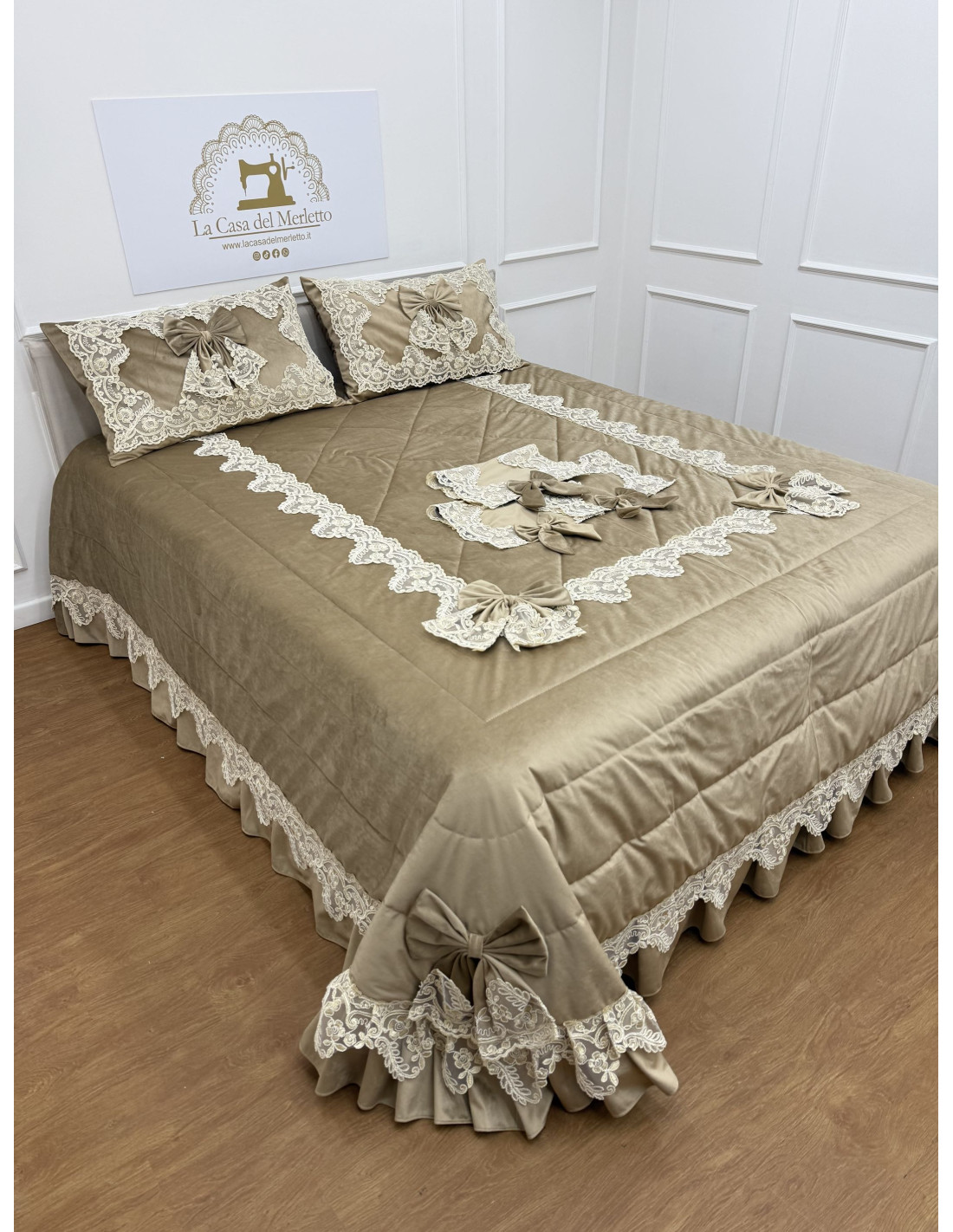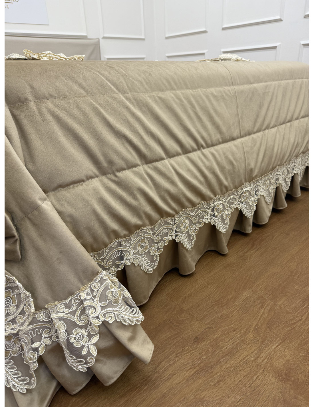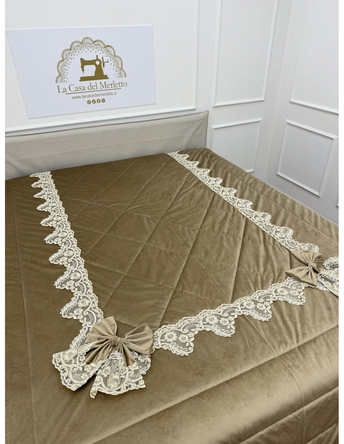 La Trapunta 320 GR “Incanto Rebrodé” è un capolavoro di stile ed eleganza, realizzata in soffice velluto tortora e impreziosita da delicati inserti in rebrodé avorio.