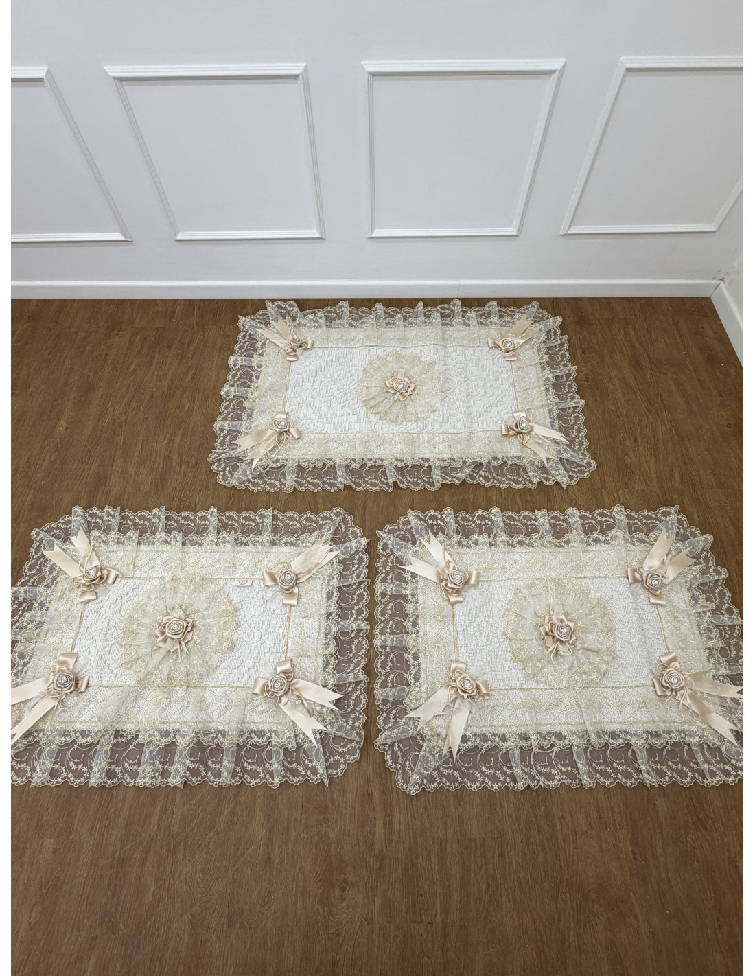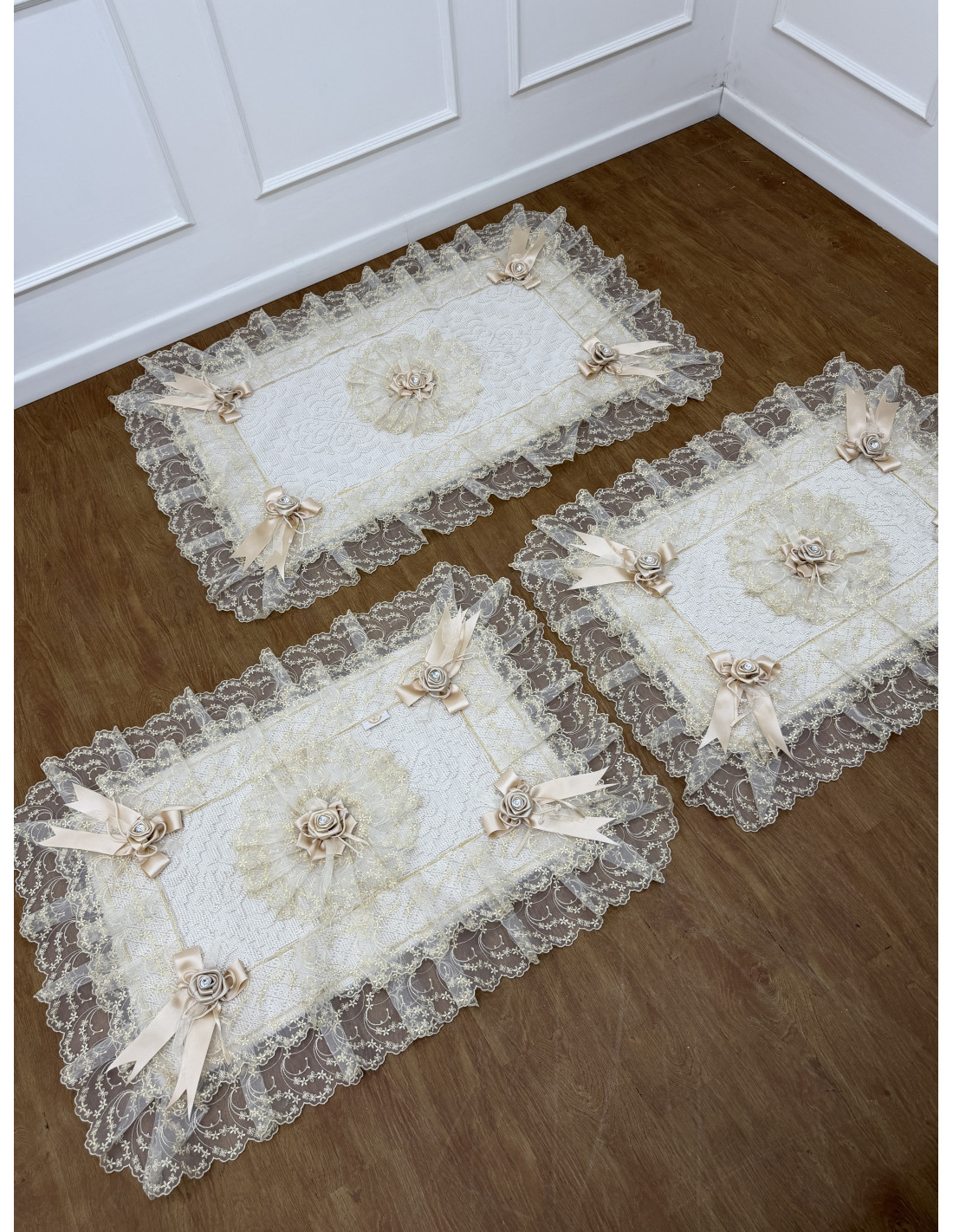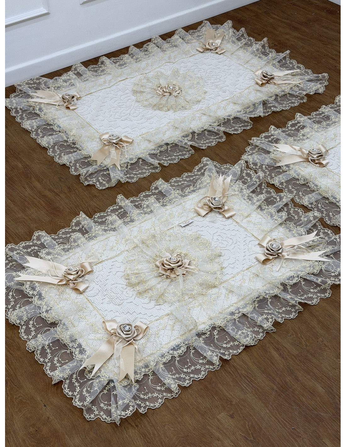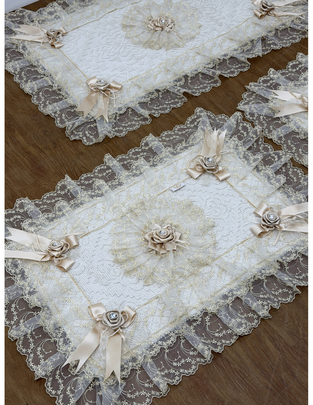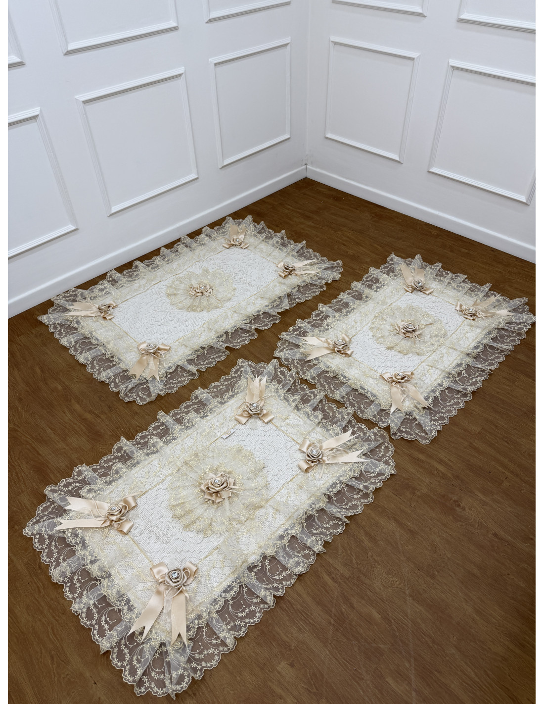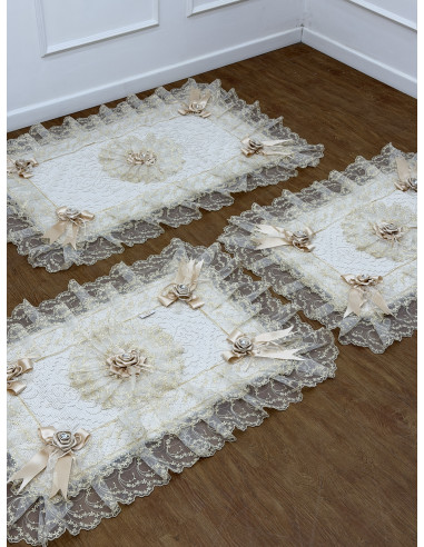 Tappeti sardi avorio, rifiniti con doppia balza di organza avorio alto con fiocchi e rose in raso con swarovsky e coccarda centrale con rosone. Il prodotto si può comporre acquistando due piccoli e un grande formando un tris tappeti da camera.