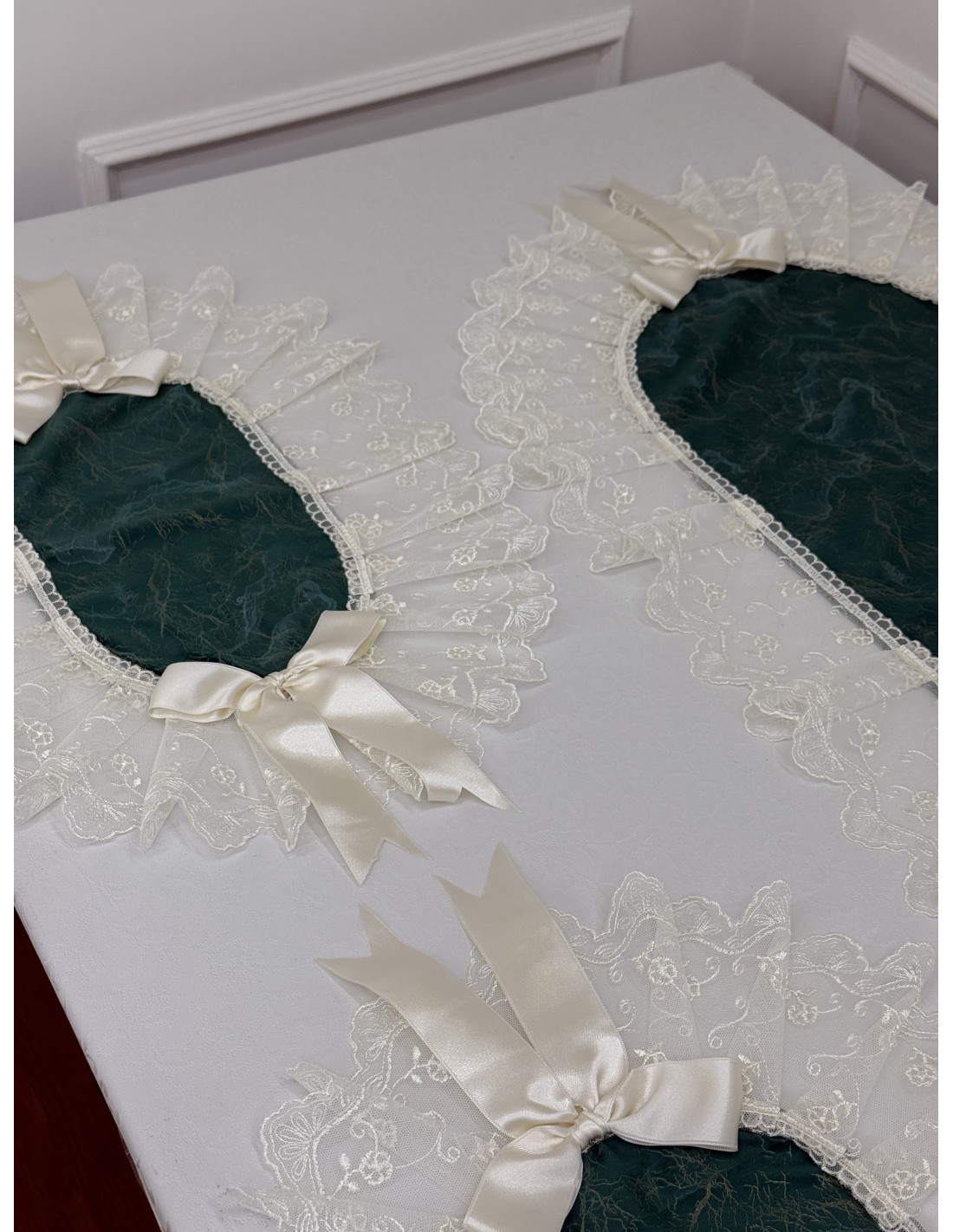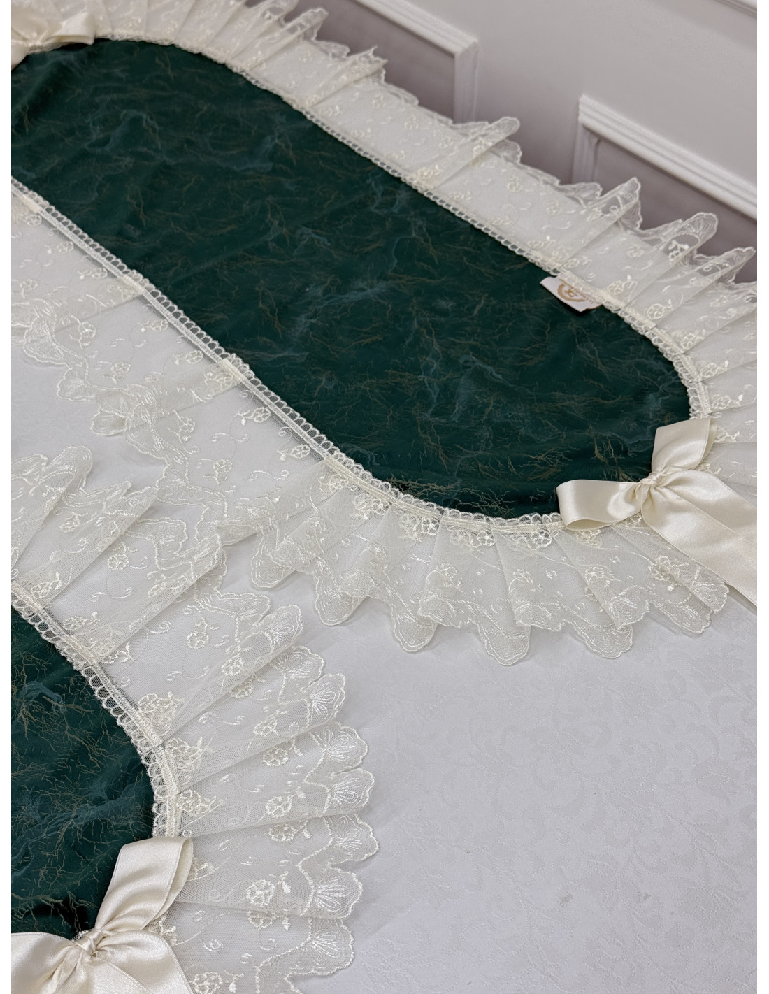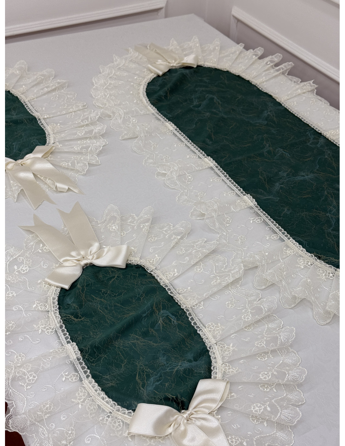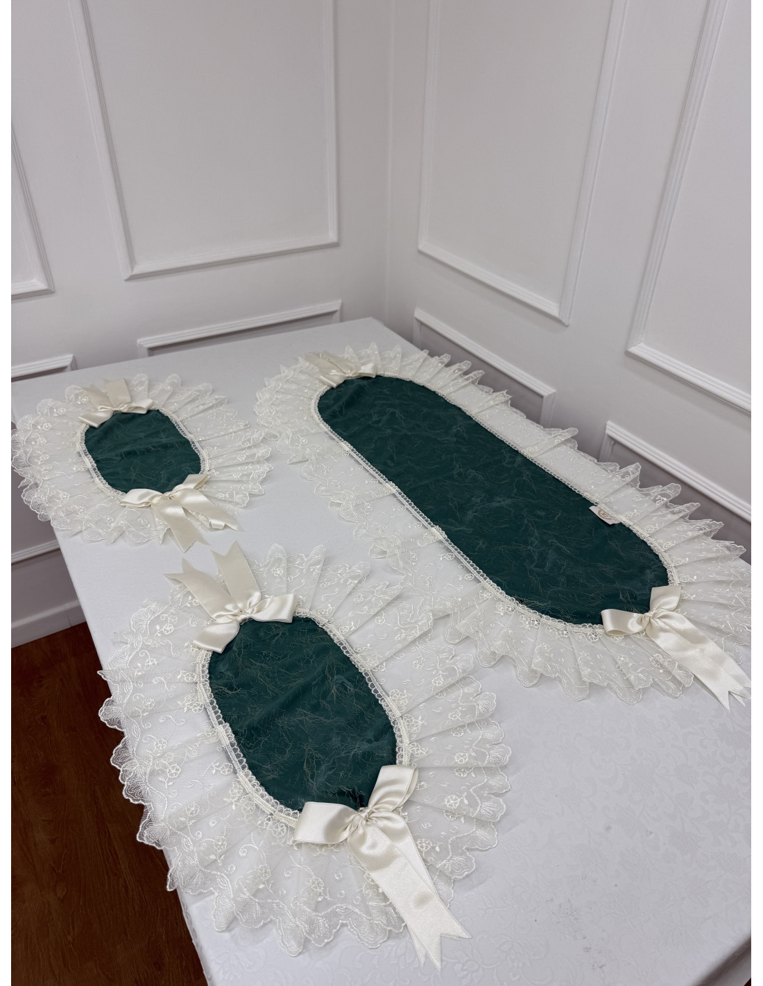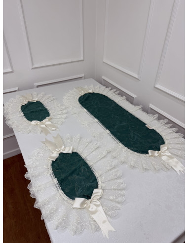 Elegante set di centri realizzati in morbido velluto, rifiniti con pregiato merletto e decorati con delicati fiocchi, per un tocco raffinato e senza tempo. Un complemento d’arredo perfetto per impreziosire tavoli, consolle e credenze con stile.