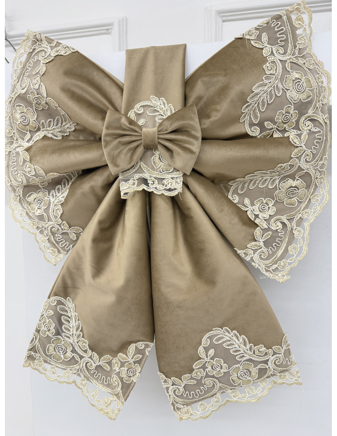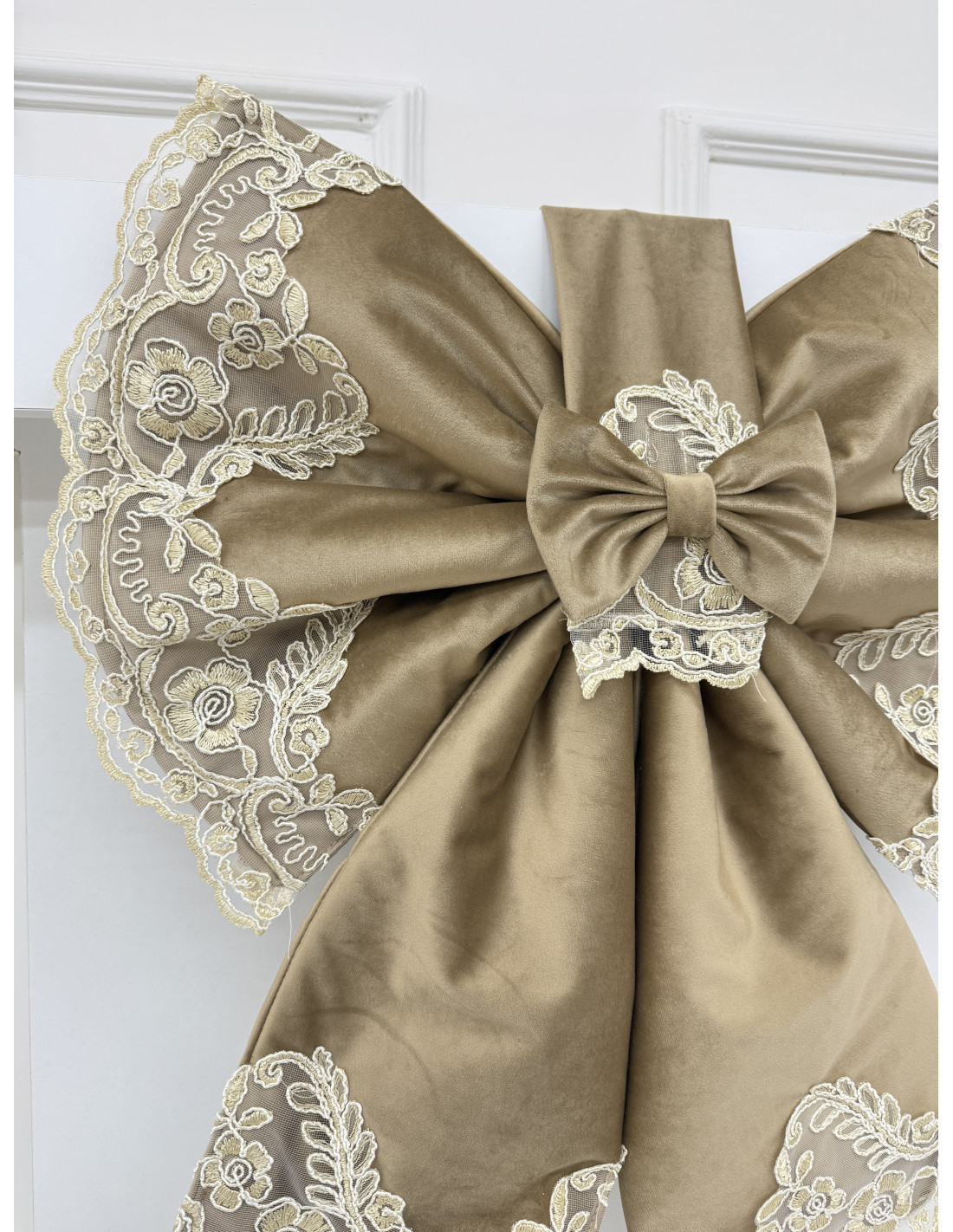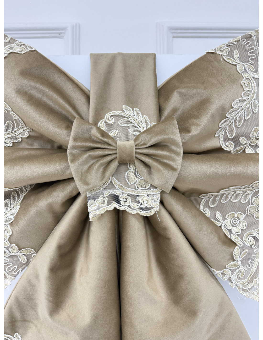 Elegante copriforno a forma di fiocco, realizzato in morbido velluto e impreziosito da delicato pizzo rebrodé. Si applica facilmente grazie alla pratica chiusura a strappo che si inserisce sulla maniglia del forno, donando un tocco raffinato e romantico alla cucina.
