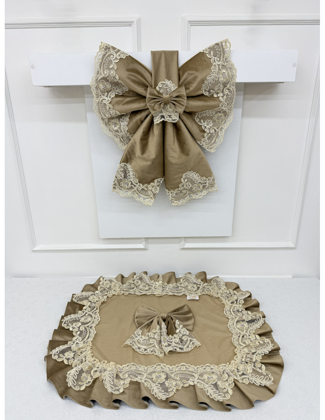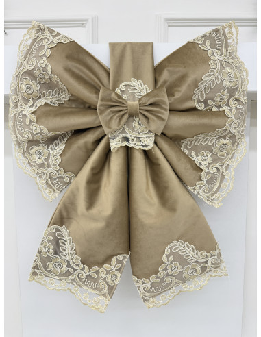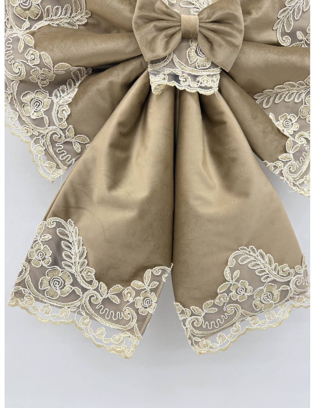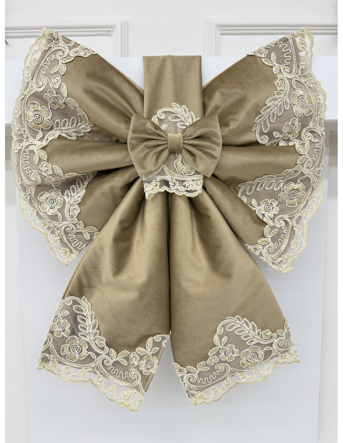 Elegante copriforno a forma di fiocco, realizzato in morbido velluto e impreziosito da delicato pizzo rebrodé. Si applica facilmente grazie alla pratica chiusura a strappo che si inserisce sulla maniglia del forno, donando un tocco raffinato e romantico alla cucina.
