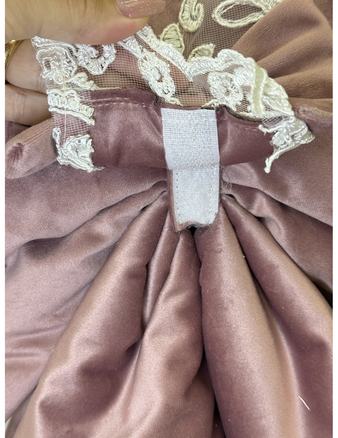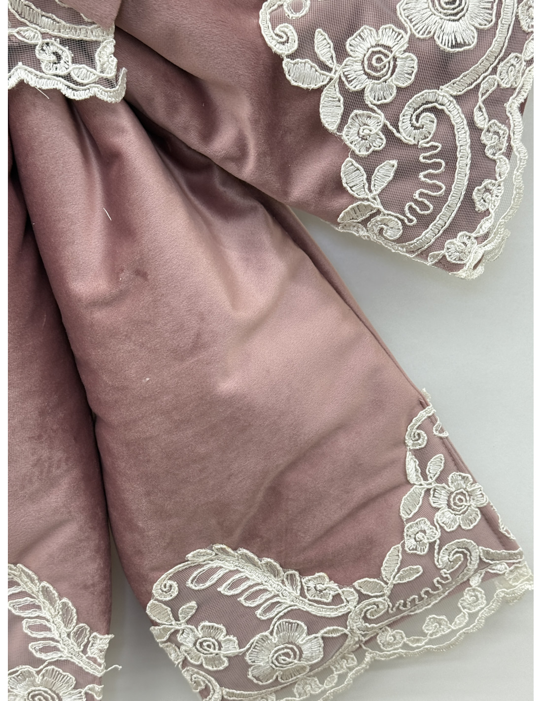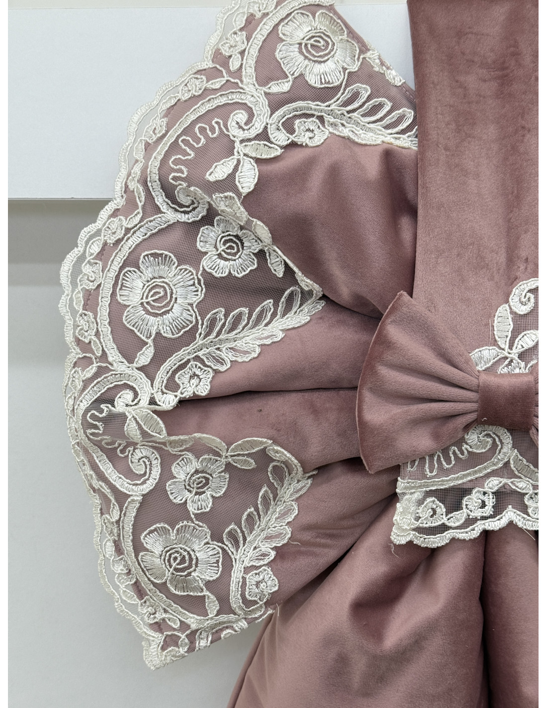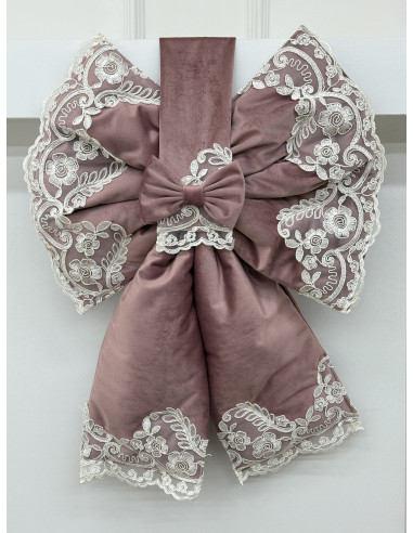 Elegante copriforno a forma di fiocco, realizzato in morbido velluto e impreziosito da delicato pizzo rebrodé. Si applica facilmente grazie alla pratica chiusura a strappo che si inserisce sulla maniglia del forno, donando un tocco raffinato e romantico alla cucina.