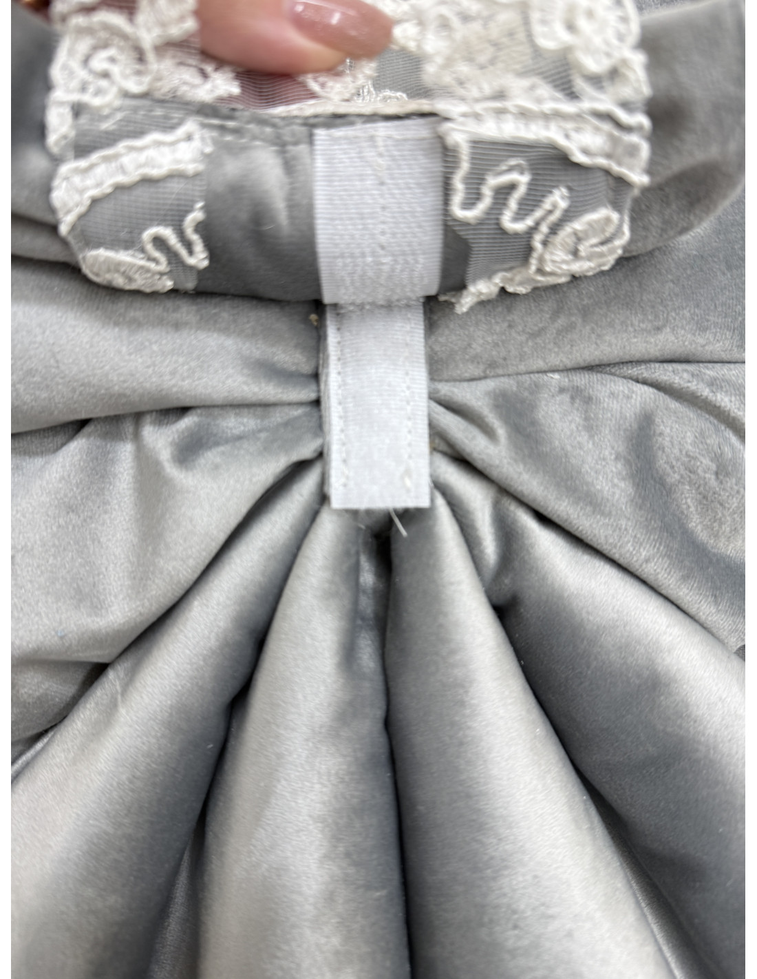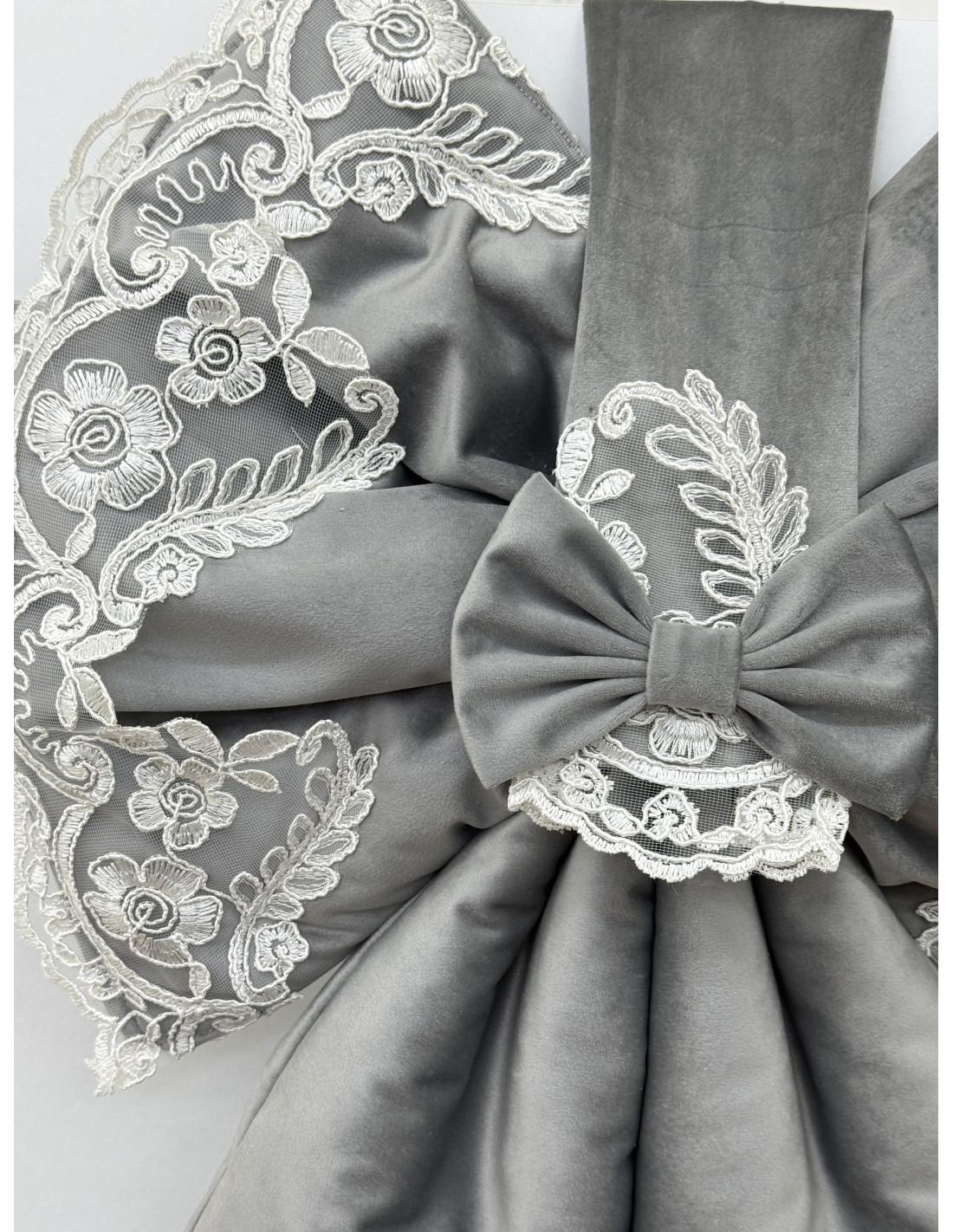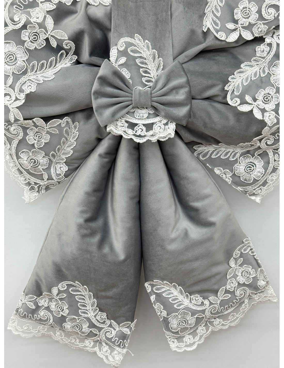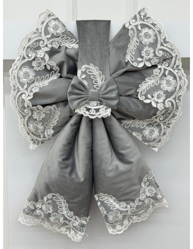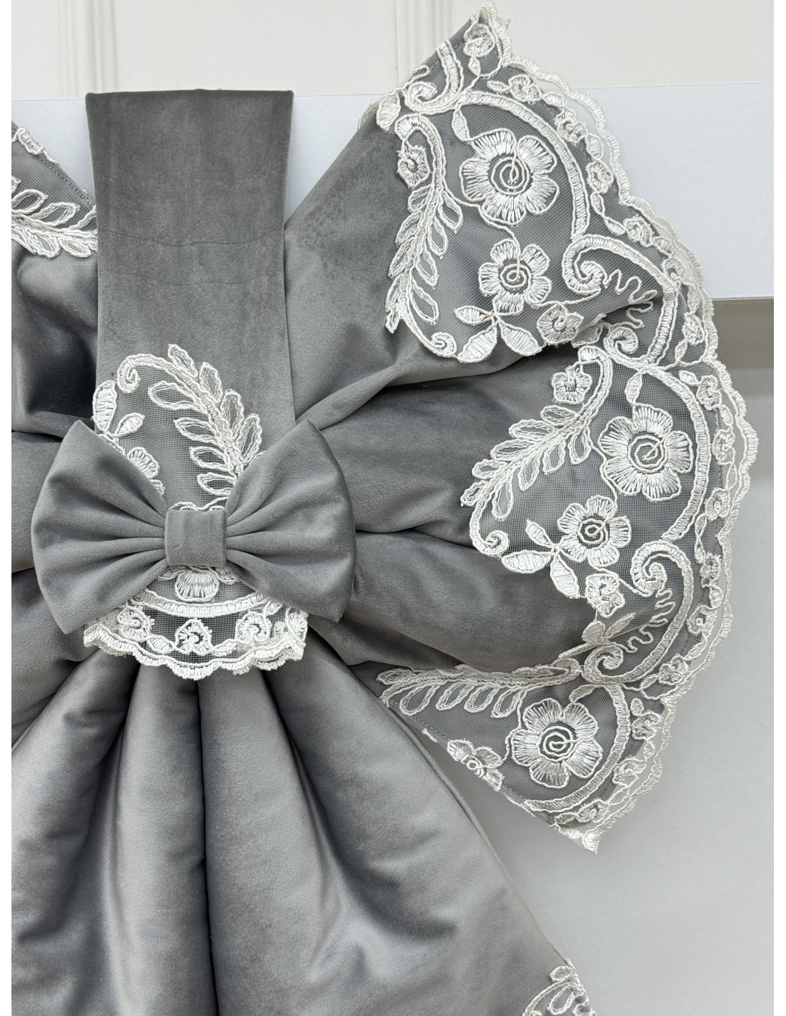 Elegante copriforno a forma di fiocco, realizzato in morbido velluto e impreziosito da delicato pizzo rebrodé. Si applica facilmente grazie alla pratica chiusura a strappo che si inserisce sulla maniglia del forno, donando un tocco raffinato e romantico alla cucina.