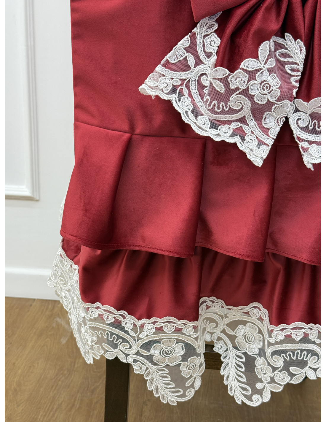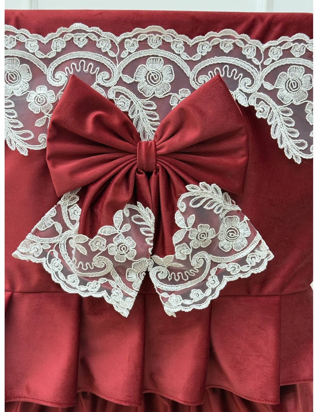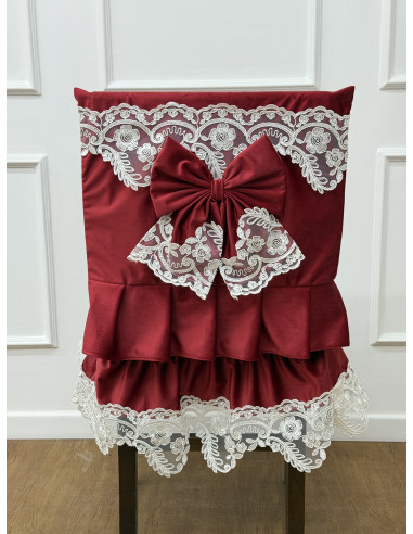 La spalliera è anch’essa realizzata in velluto, con imbottitura interna per un comfort maggiore, e arricchita da un grande fioccone centrale in velluto e rebrodé che dona un tocco romantico e ricercato alla sedia.