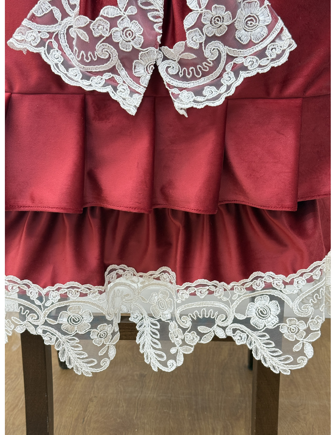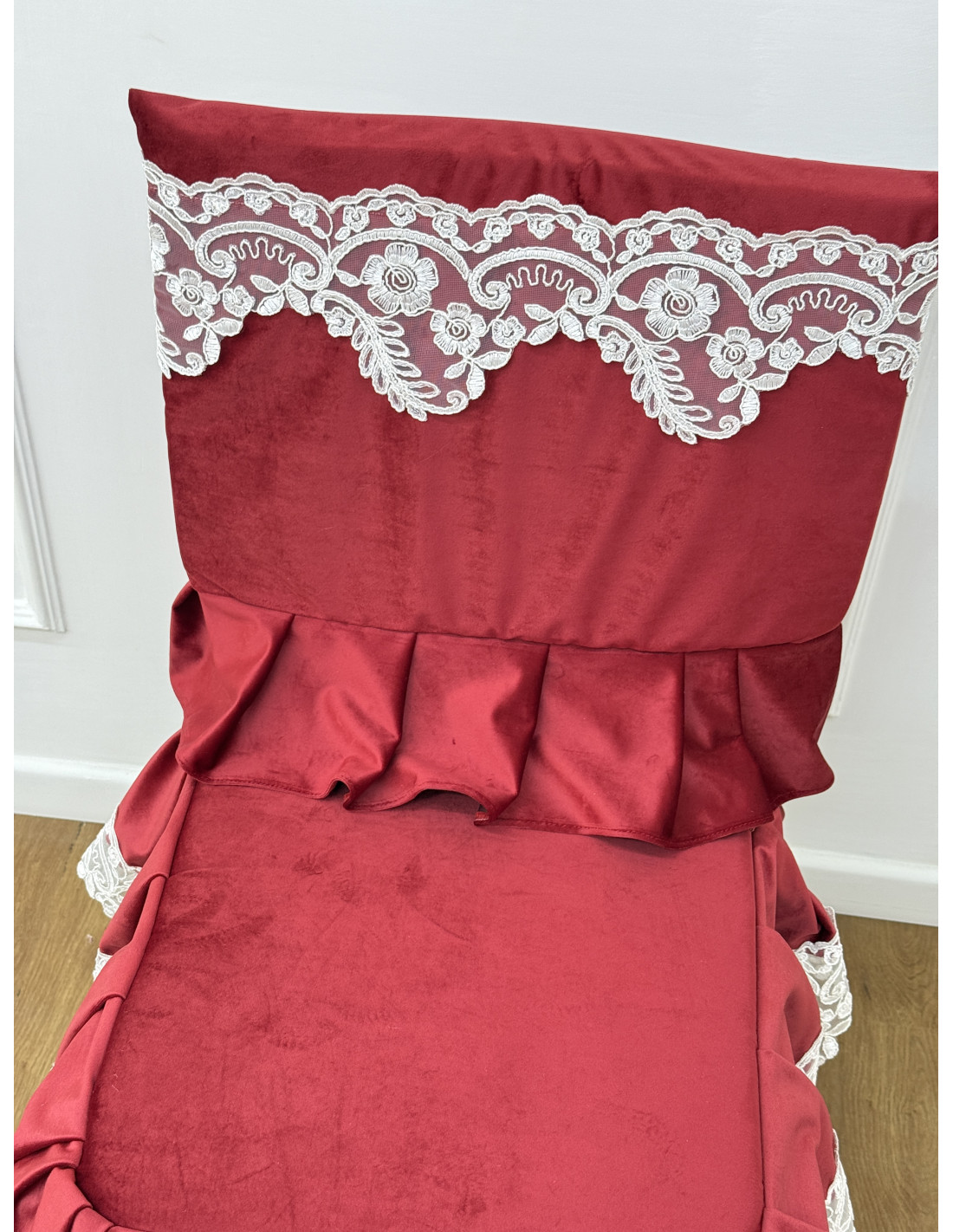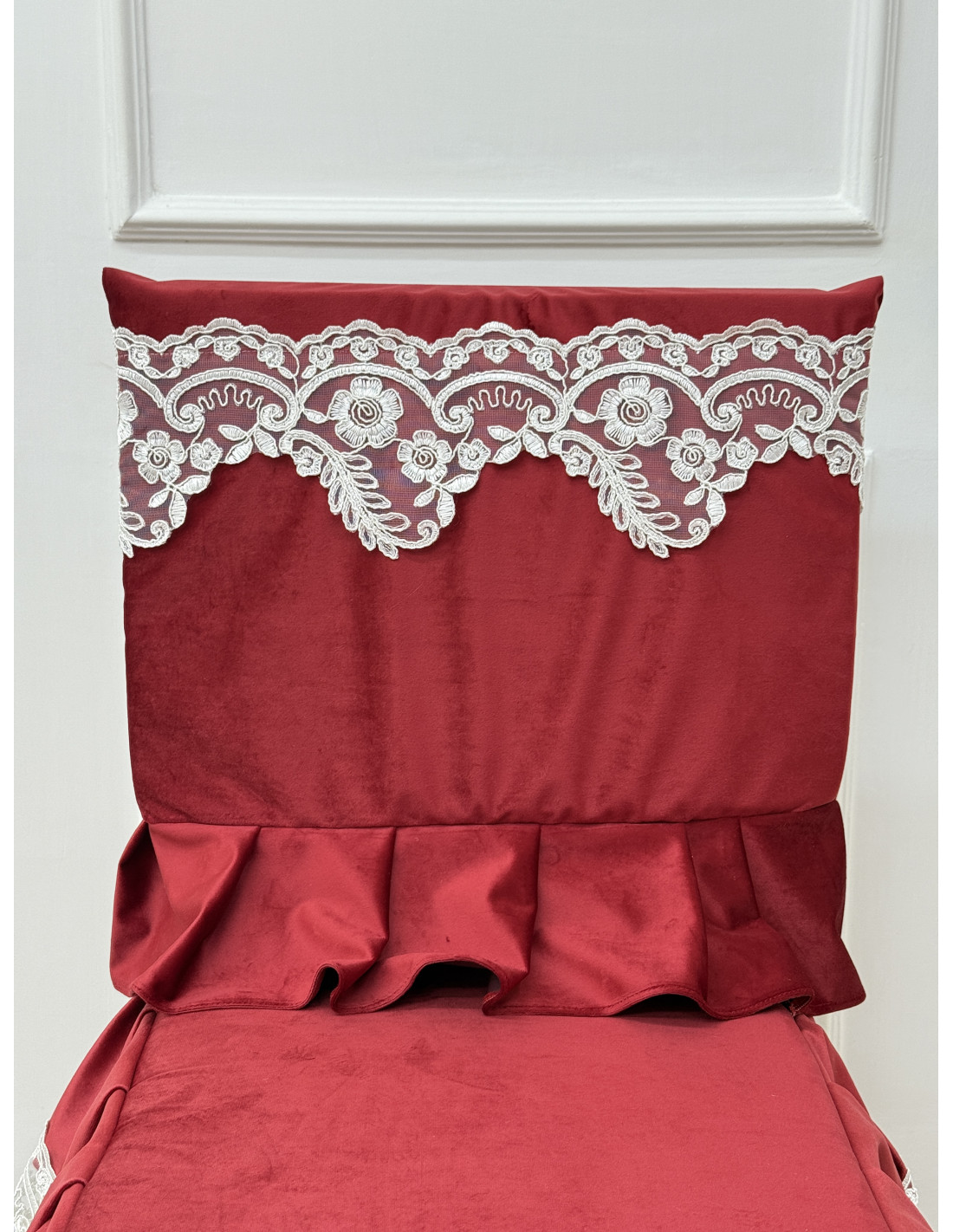 Elegante set composto da 1 coprischienale e 1 cuscino in pregiato velluto, impreziosito da raffinato pizzo rebrodé.