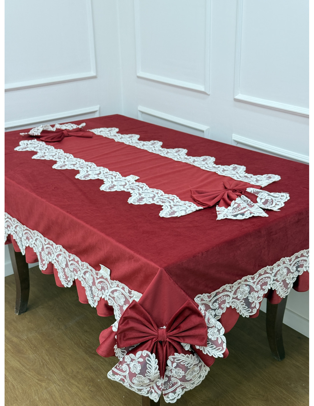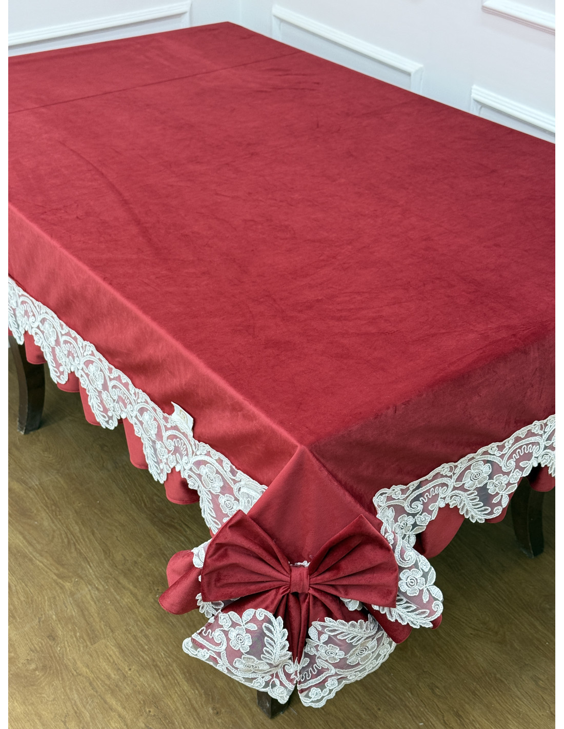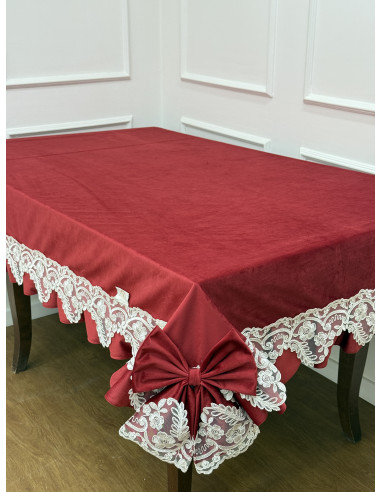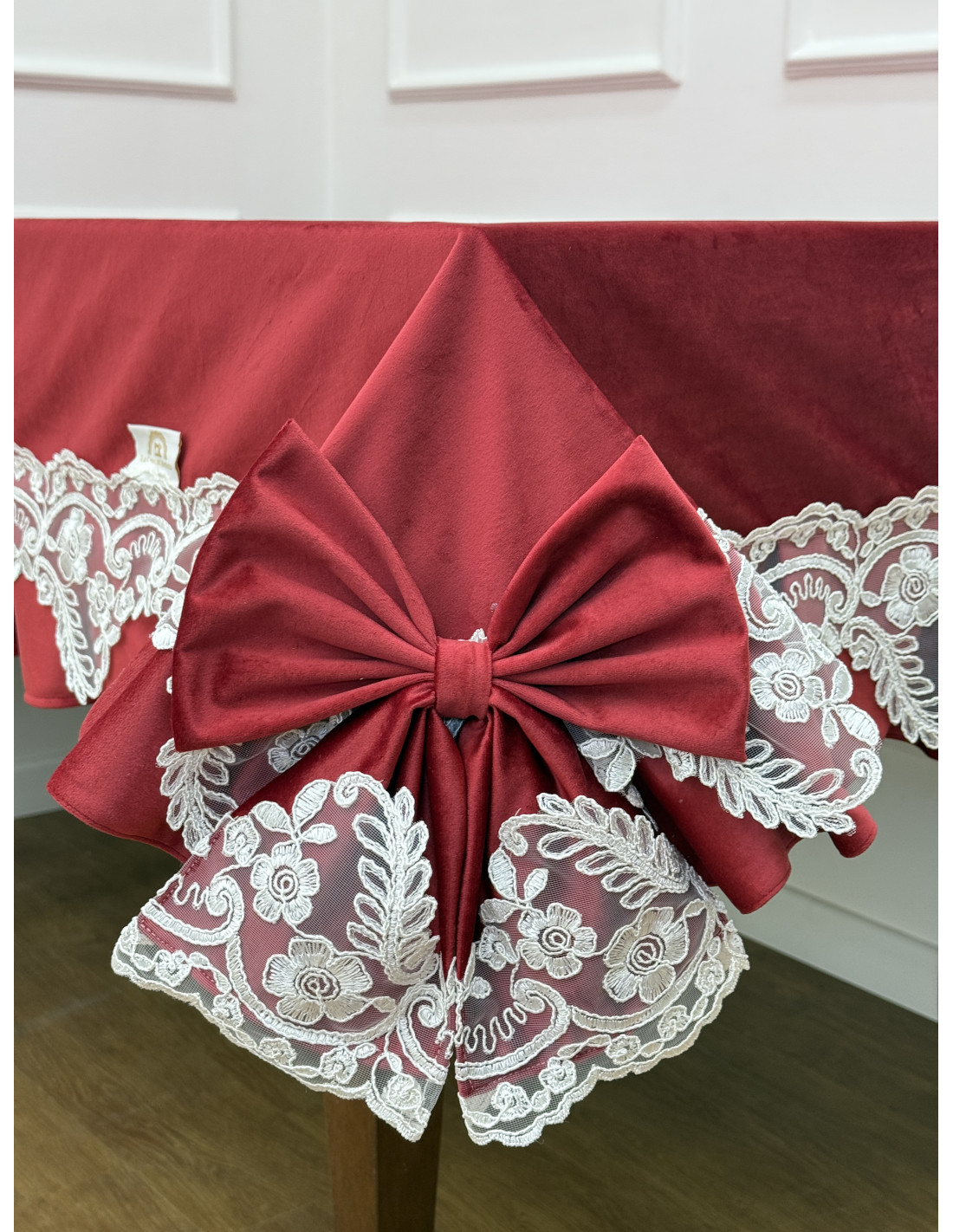 Raffinata tovaglia realizzata in pregiato velluto, impreziosita da elegante pizzo rebrodé e arricchita da fiocconi decorativi in velluto e rebrodé posizionati sui quattro lati.