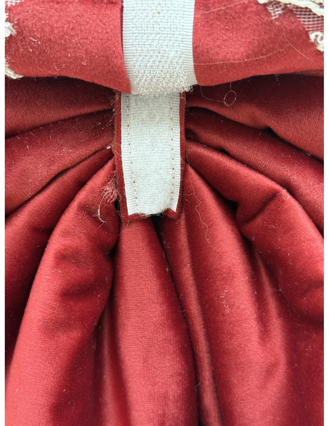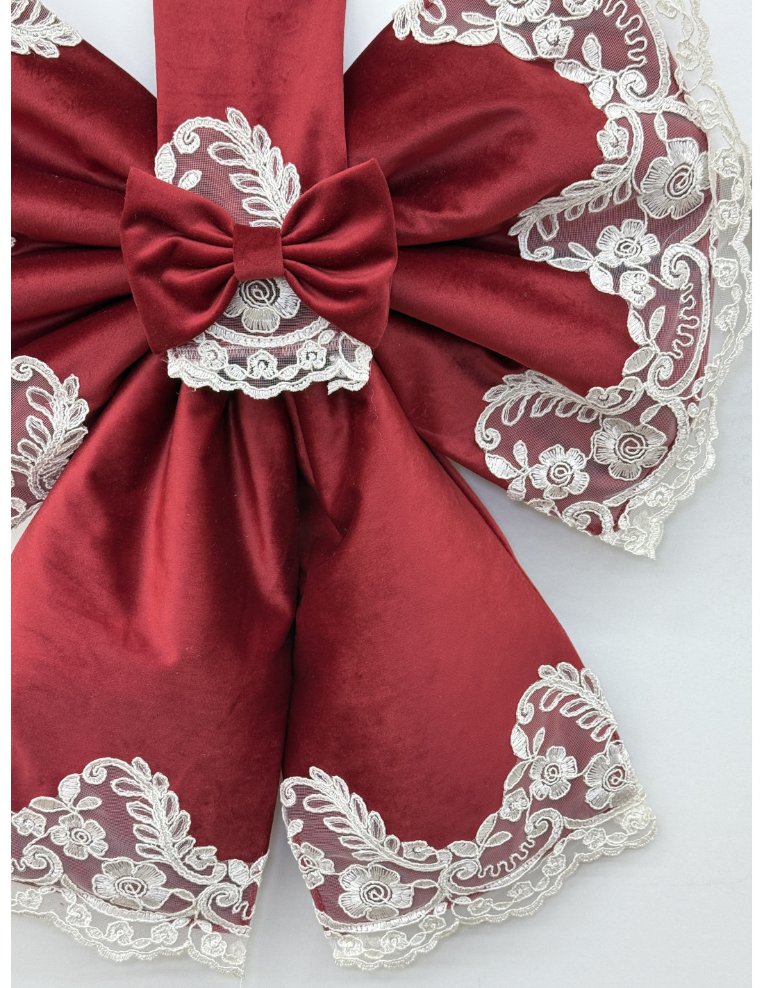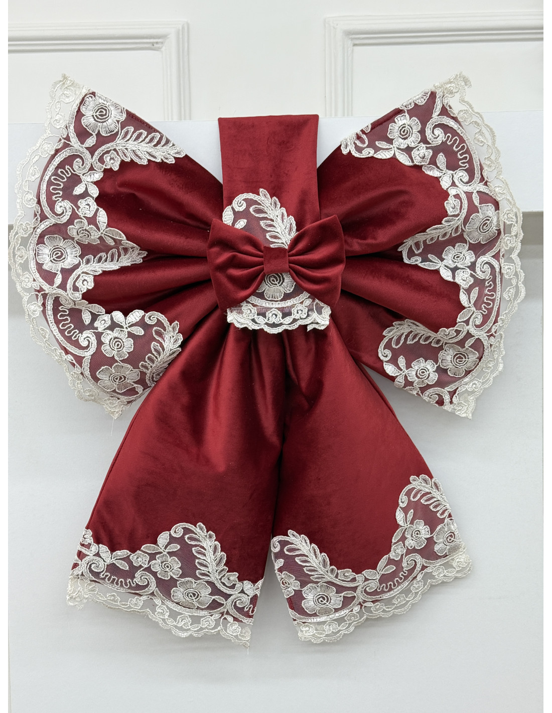 Elegante copriforno a forma di fiocco, realizzato in morbido velluto e impreziosito da delicato pizzo rebrodé. Si applica facilmente grazie alla pratica chiusura a strappo che si inserisce sulla maniglia del forno, donando un tocco raffinato e romantico alla cucina.