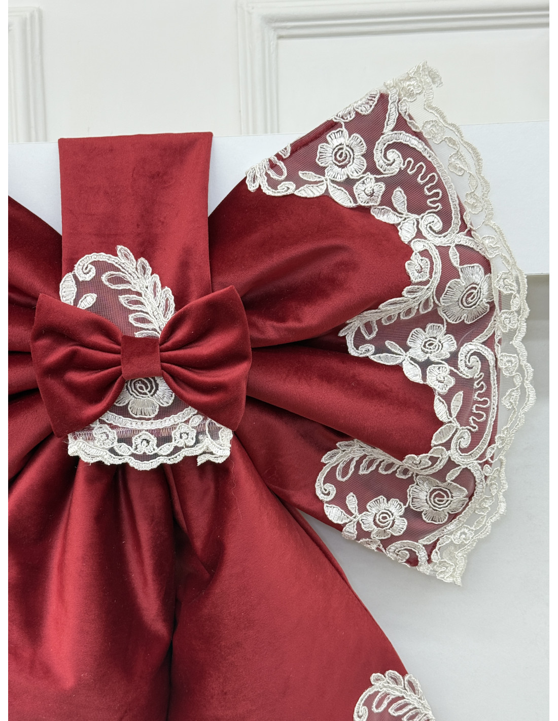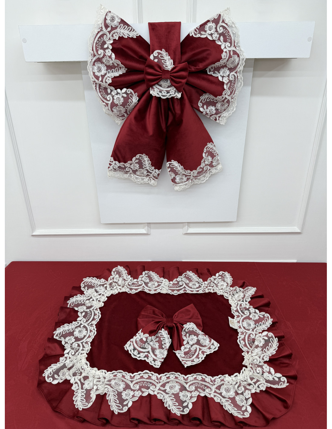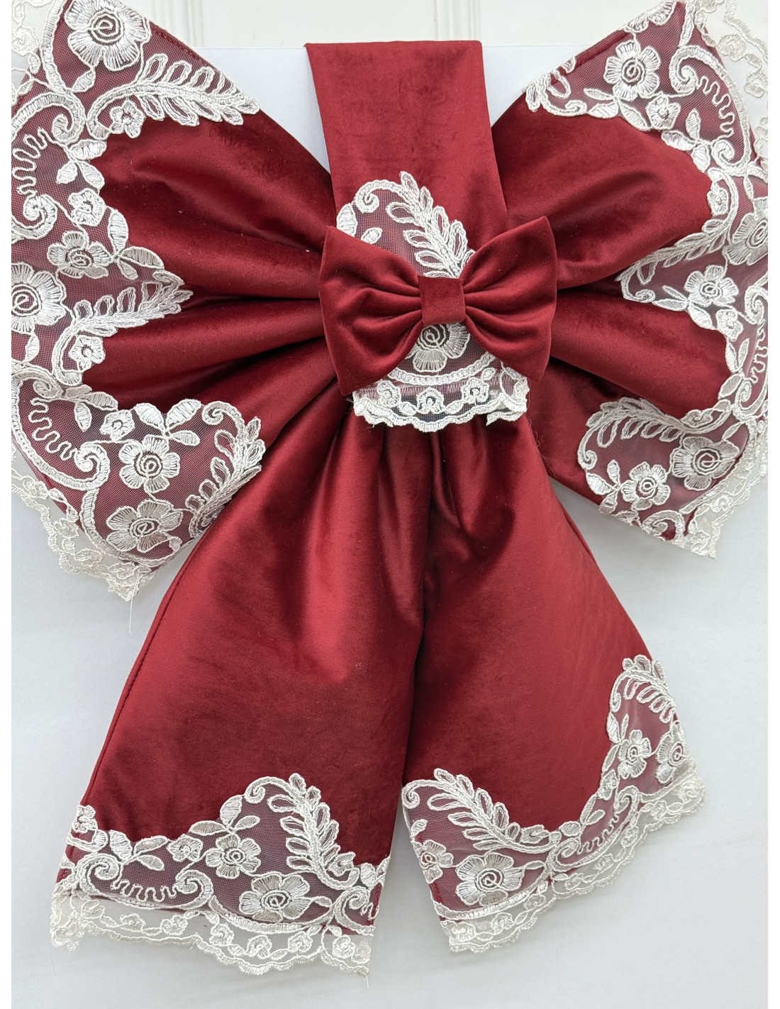 Elegante copriforno a forma di fiocco, realizzato in morbido velluto e impreziosito da delicato pizzo rebrodé. Si applica facilmente grazie alla pratica chiusura a strappo che si inserisce sulla maniglia del forno, donando un tocco raffinato e romantico alla cucina.