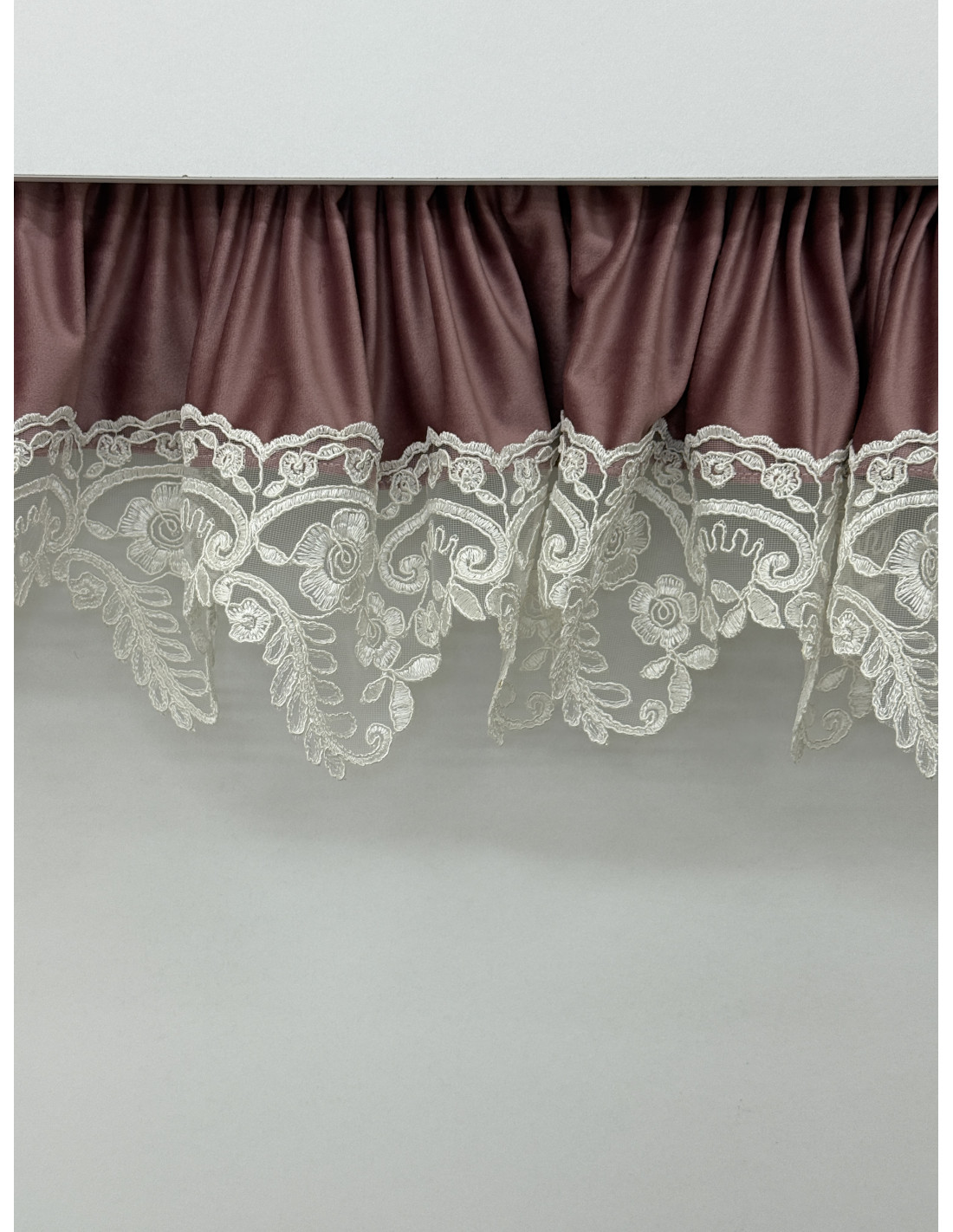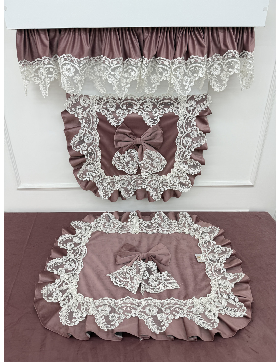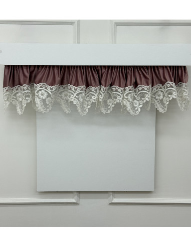 Raffinata sottocappa realizzata in pregiato velluto e impreziosita da elegante pizzo rebrodé, perfetta per completare con stile e armonia la decorazione della cucina.