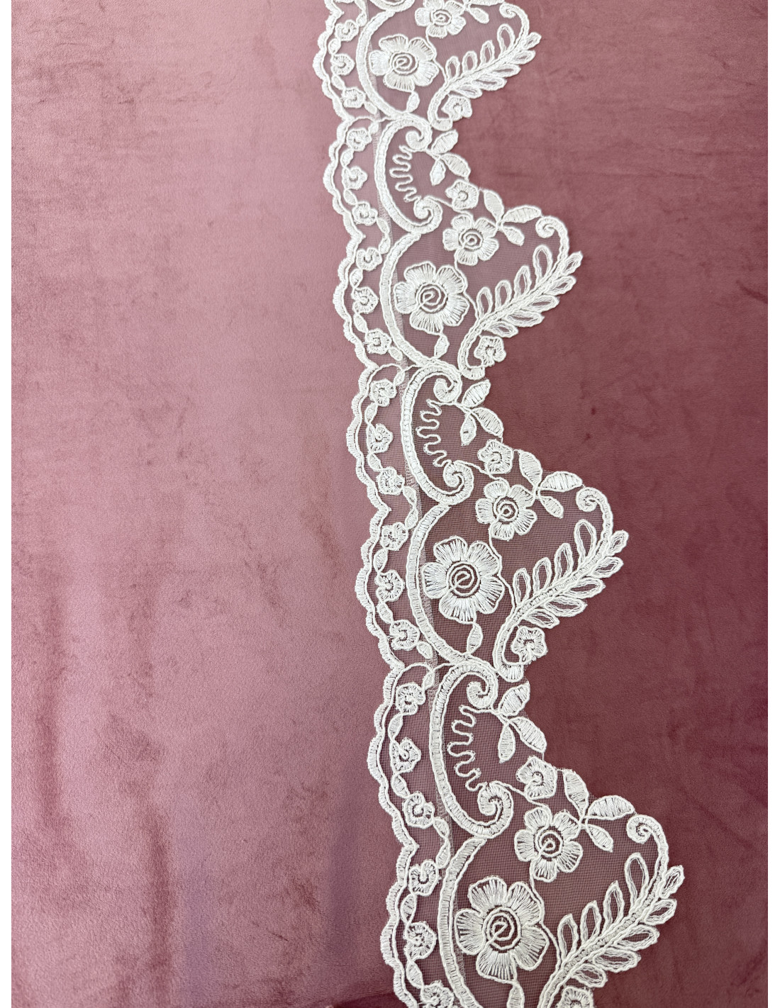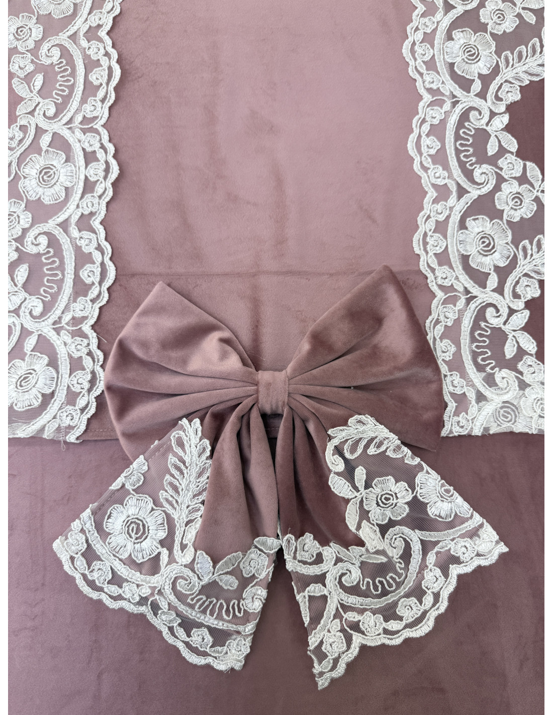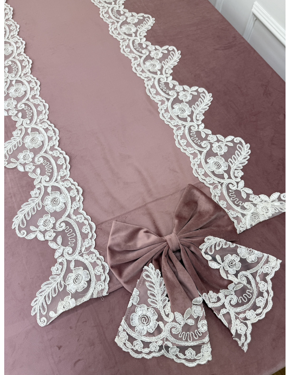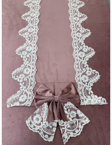 Elegante runner realizzato in morbido velluto, rifinito con delicato pizzo rebrodé e arricchito da raffinati fiocconi in velluto e rebrodé ai lati, per un tocco romantico e sofisticato alla tua tavola o ai tuoi complementi d’arredo.