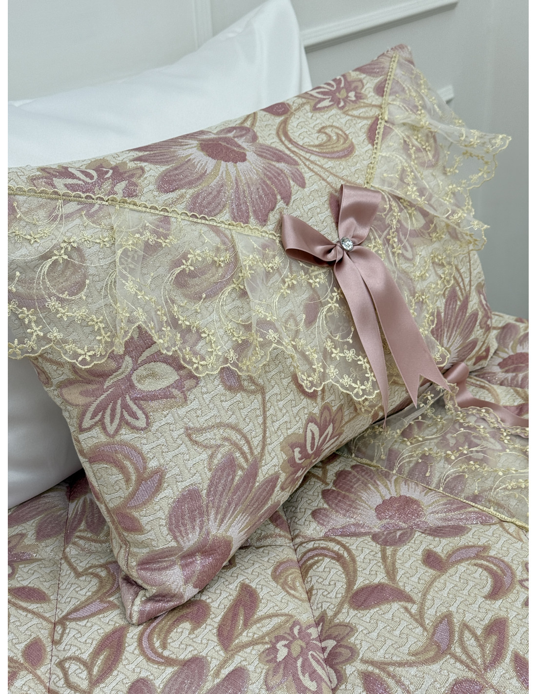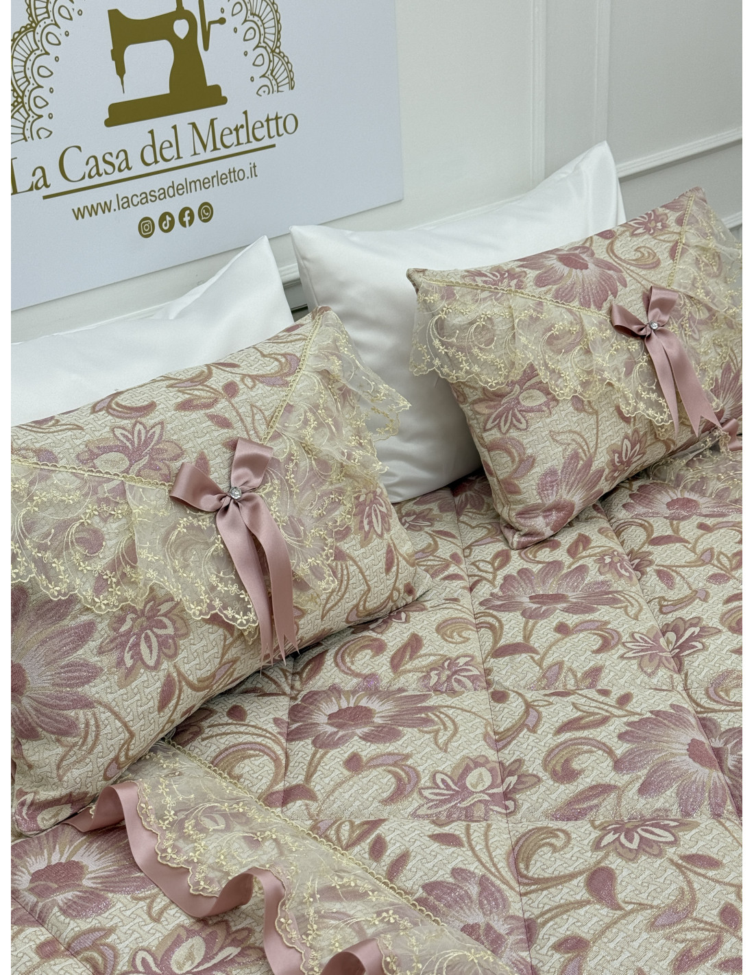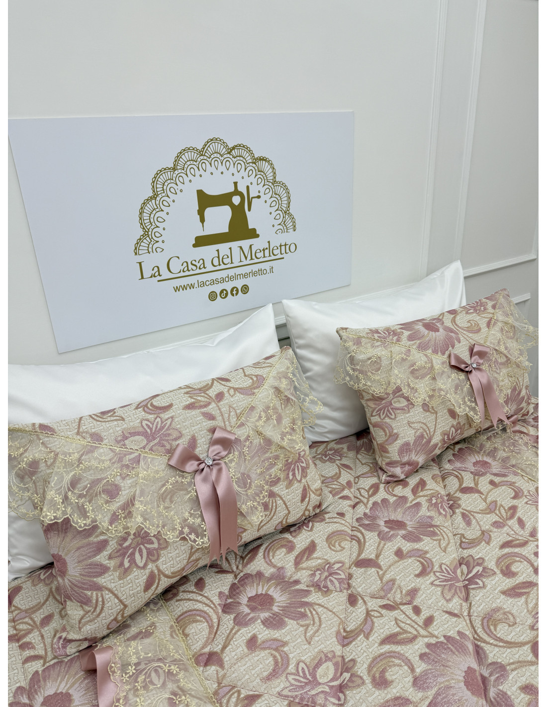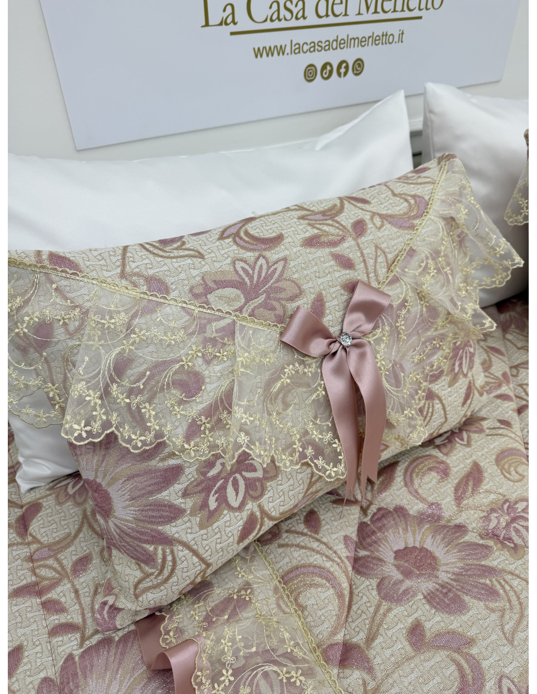 Coppia cuscini rettangolare in stoffa gobelin rosa , rifinito con balza di merletto e fiocco. Il prodotto arriverà compreso di anima interna .