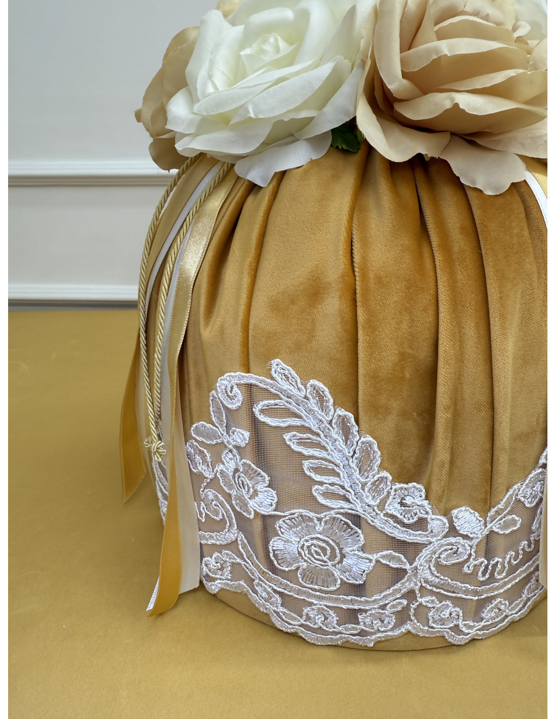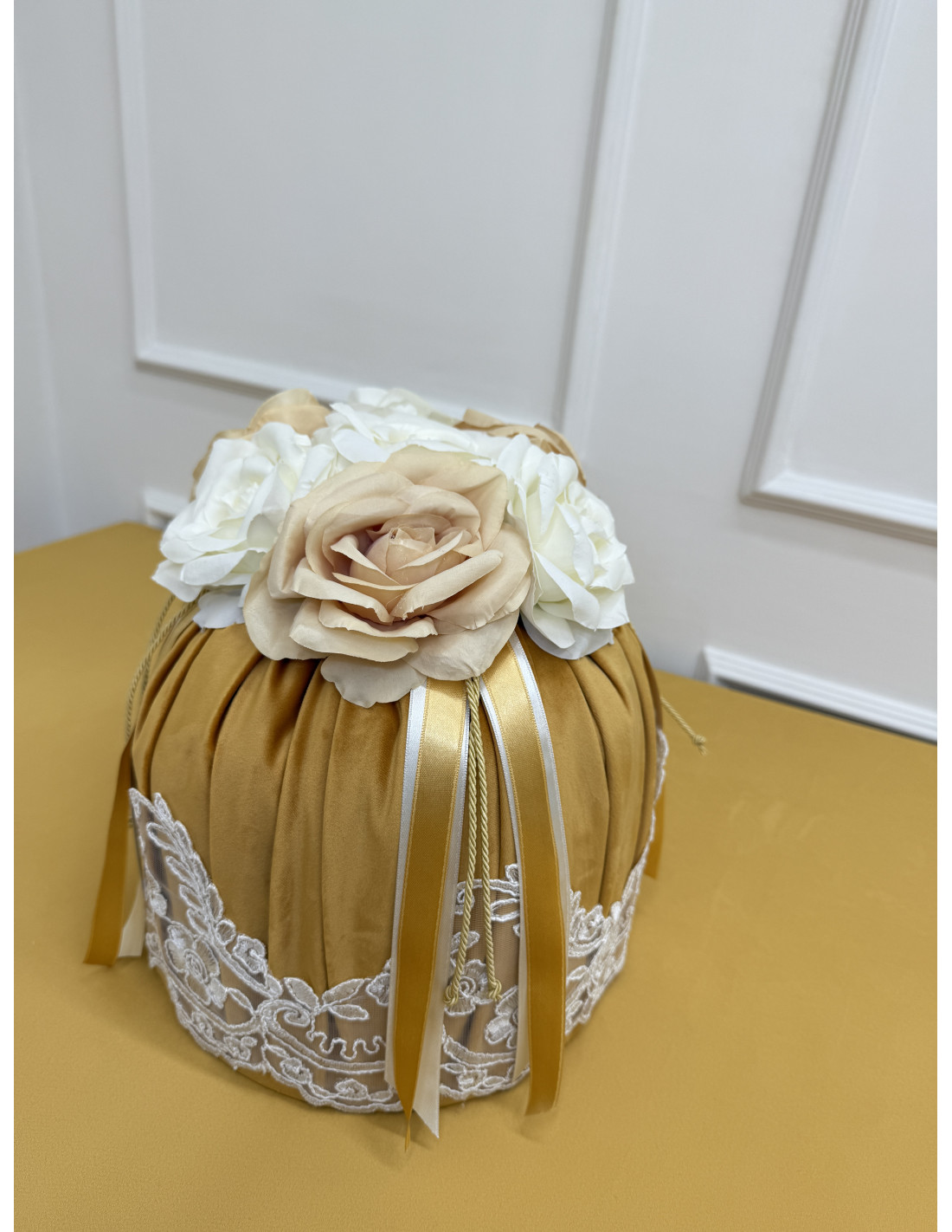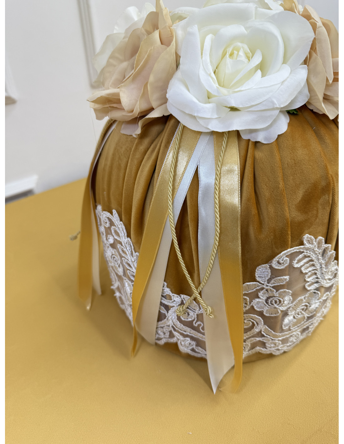 Bon Bon grande in velluto e tulle Swarovski, rifinito con rose finte e applicazioni di raso e cordoncini