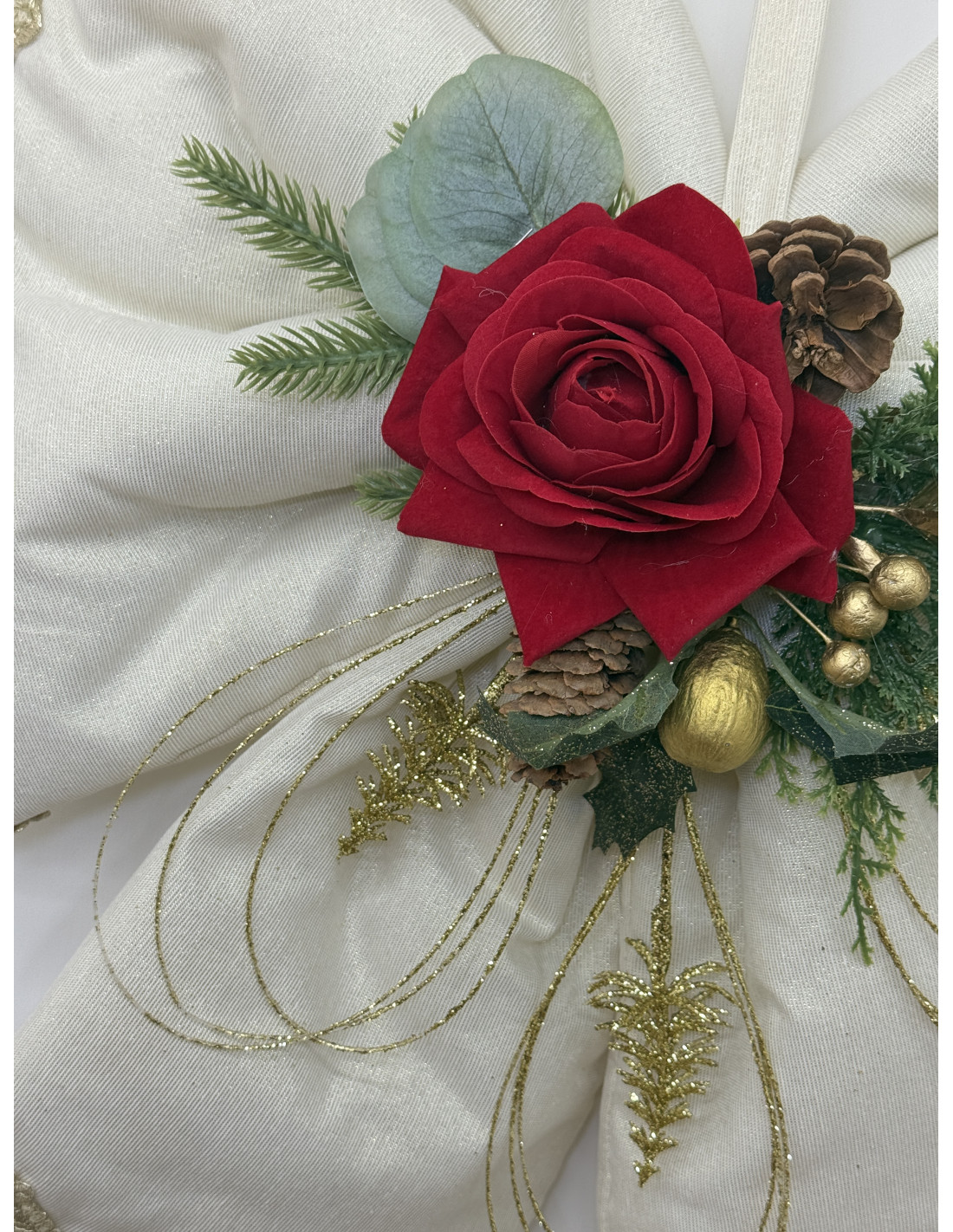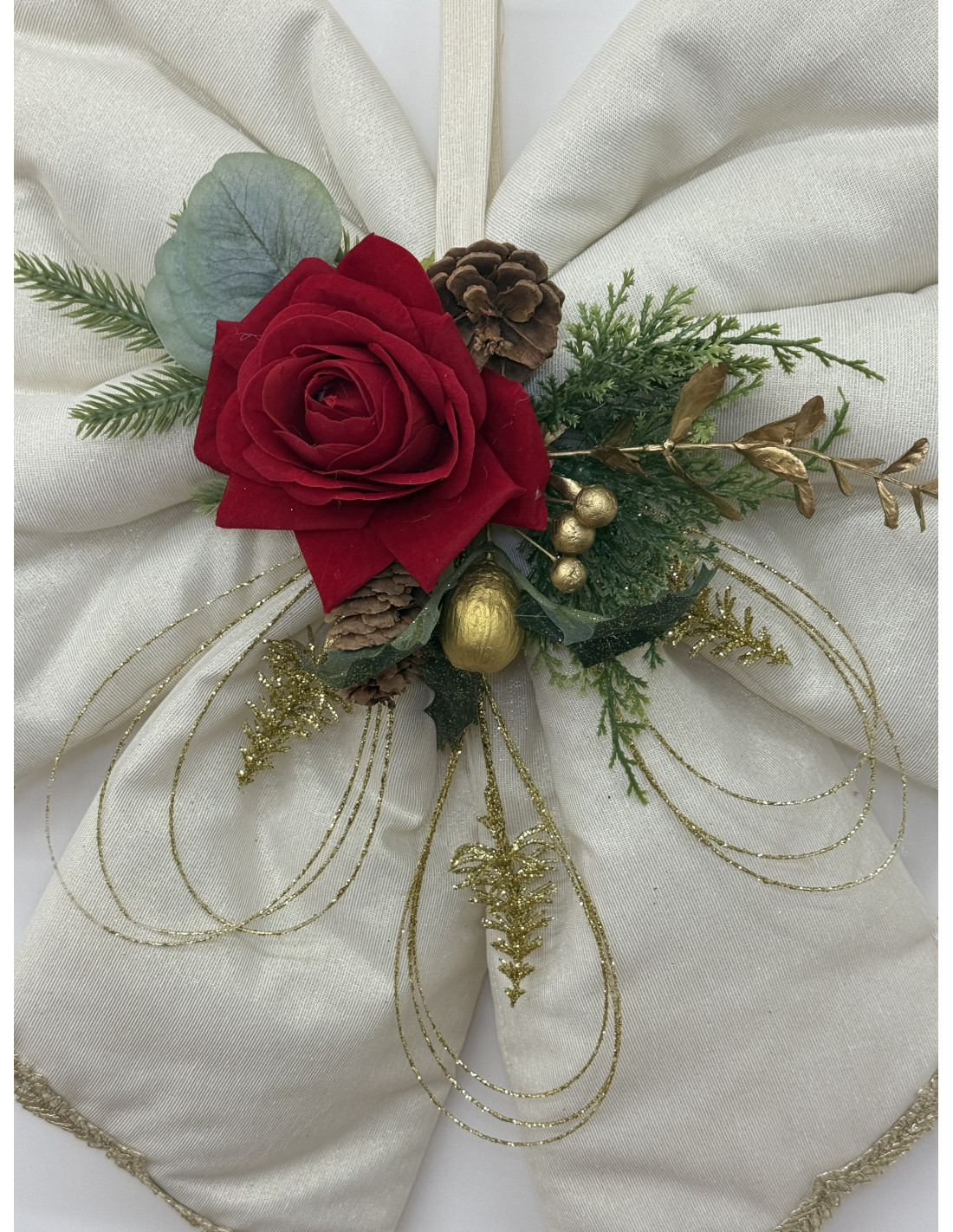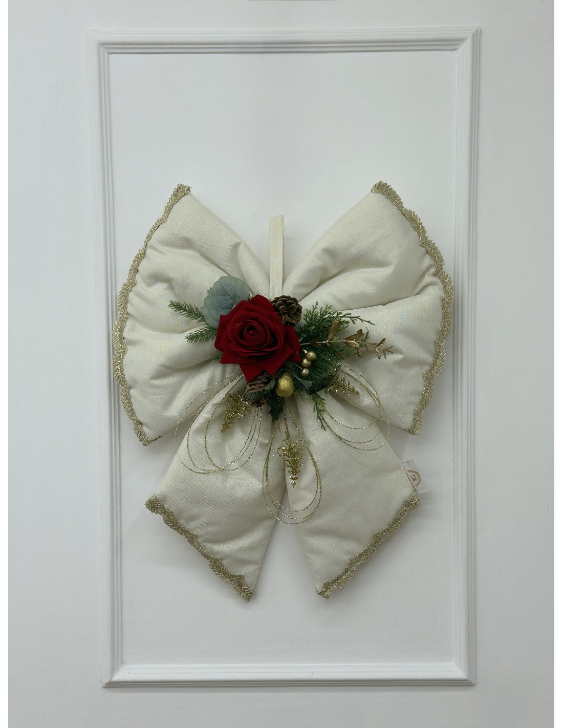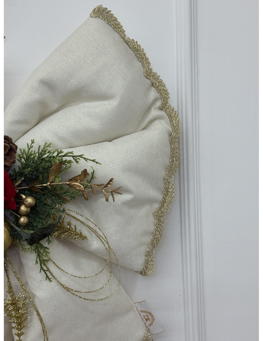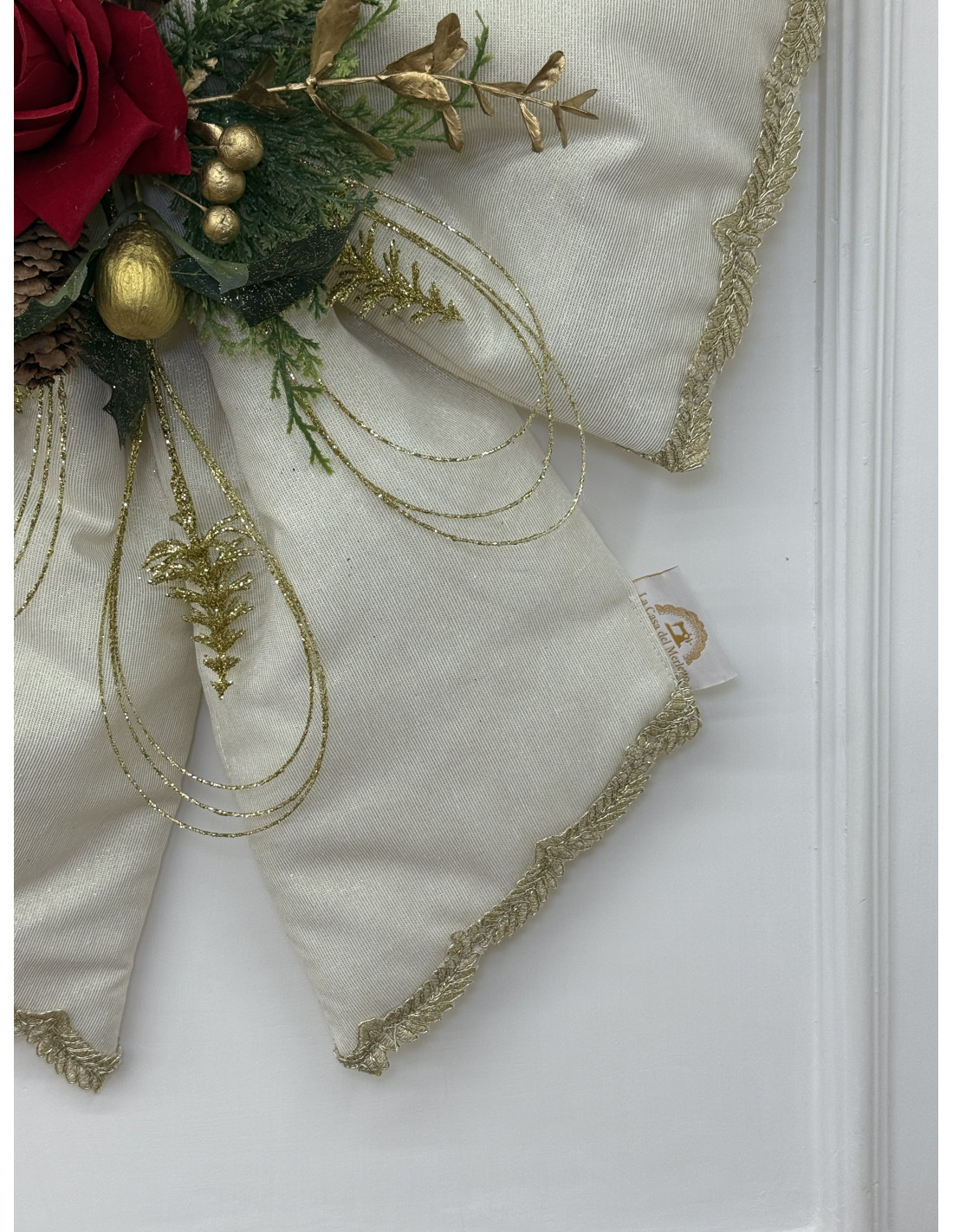 Fiocco natalizio realizzato in preziosa stoffa Lurex con decorazioni natalizie luminose.