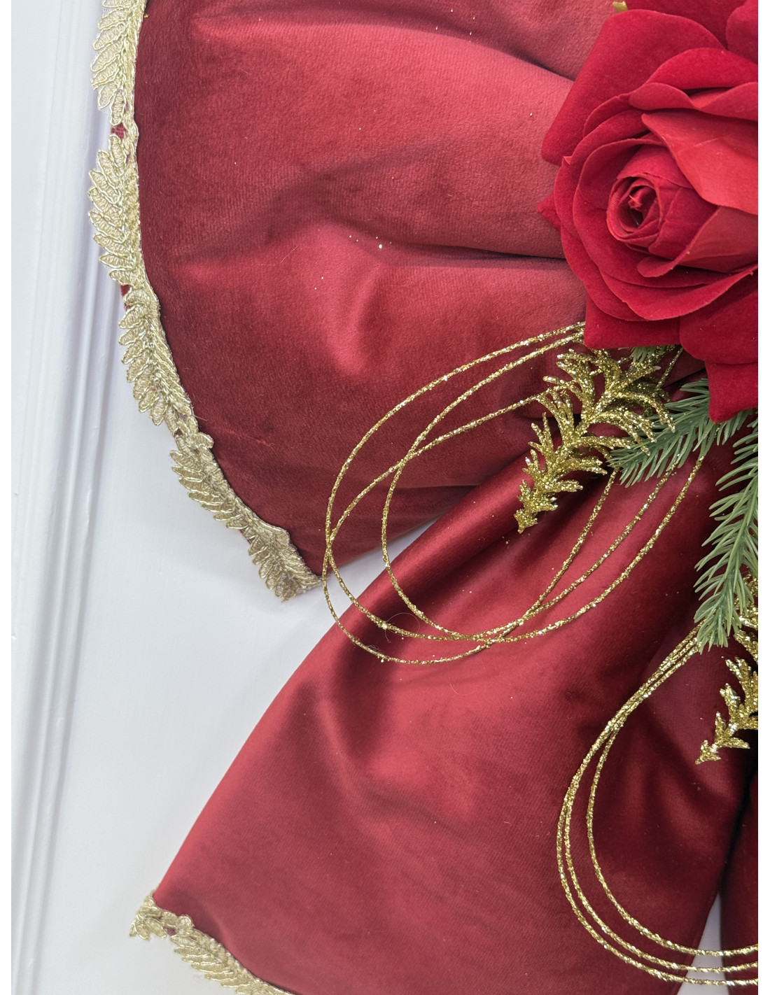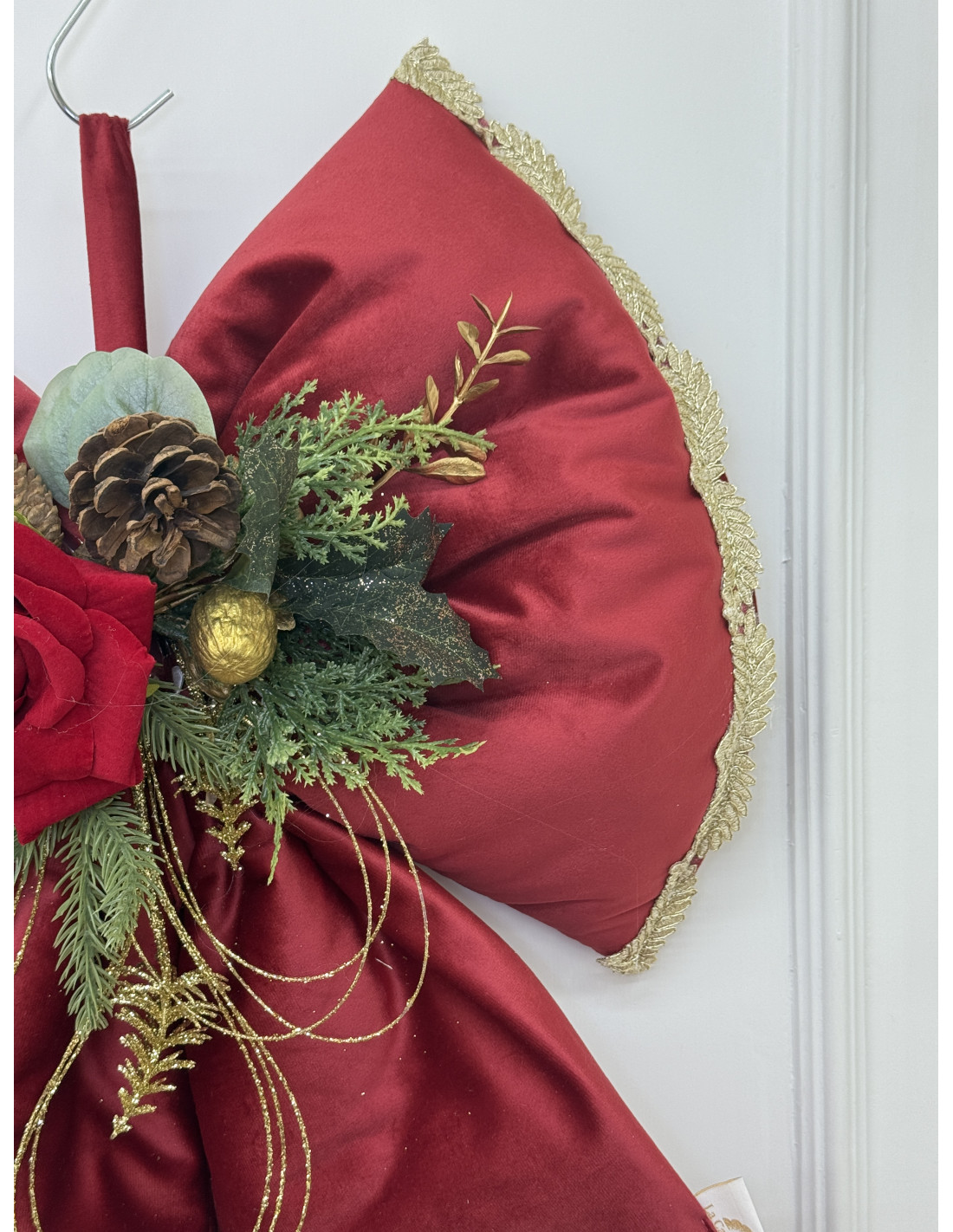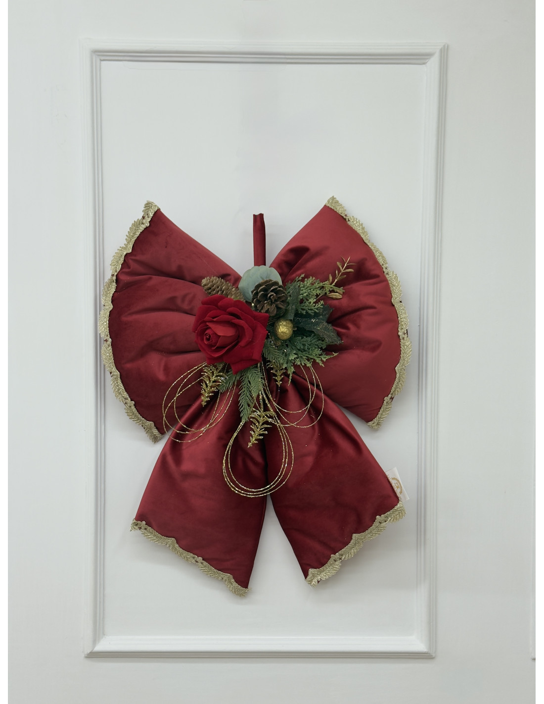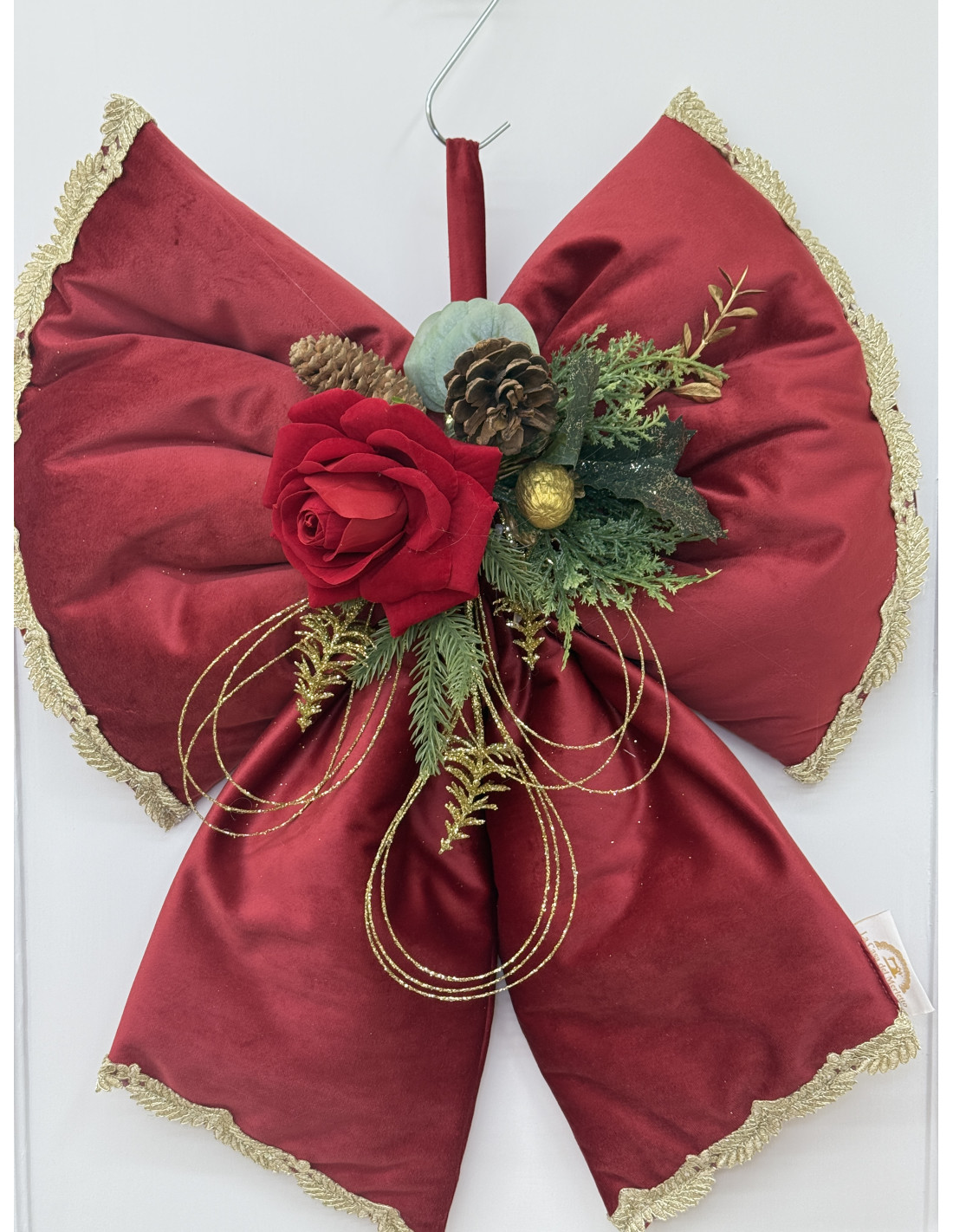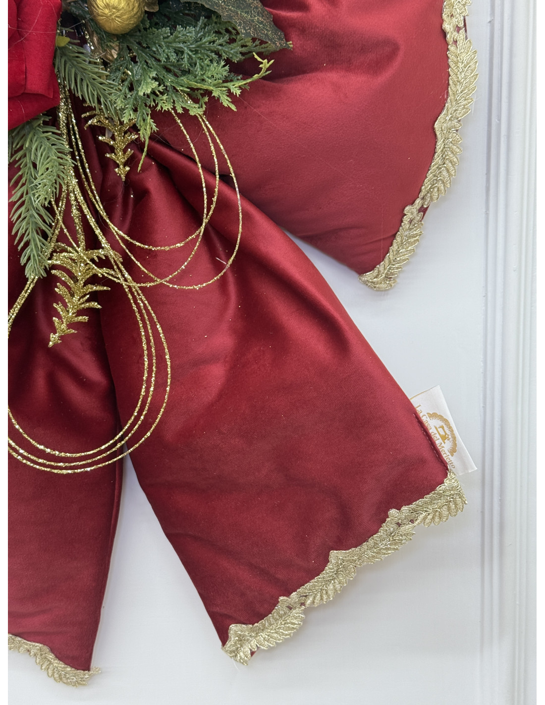 Fiocco natalizio in velluto rosso, impreziosito da decorazioni oro.