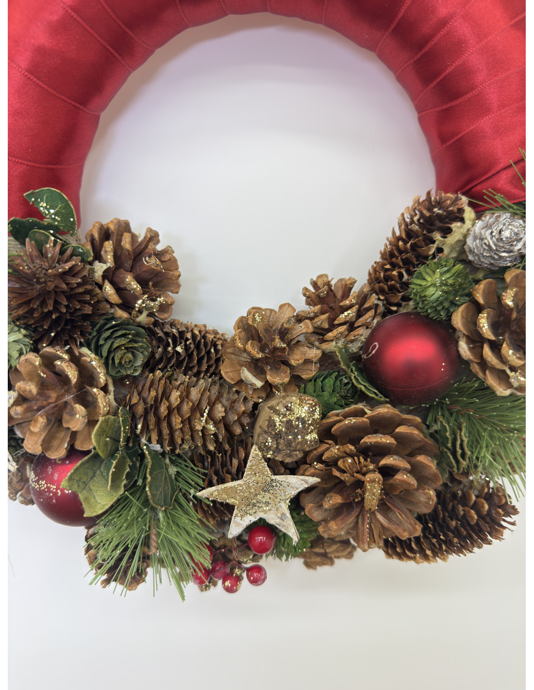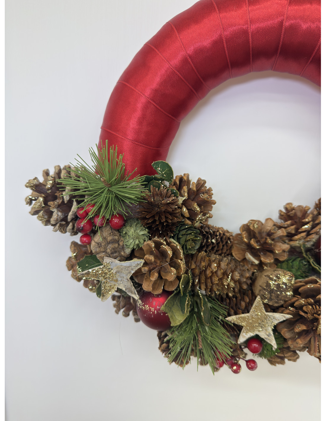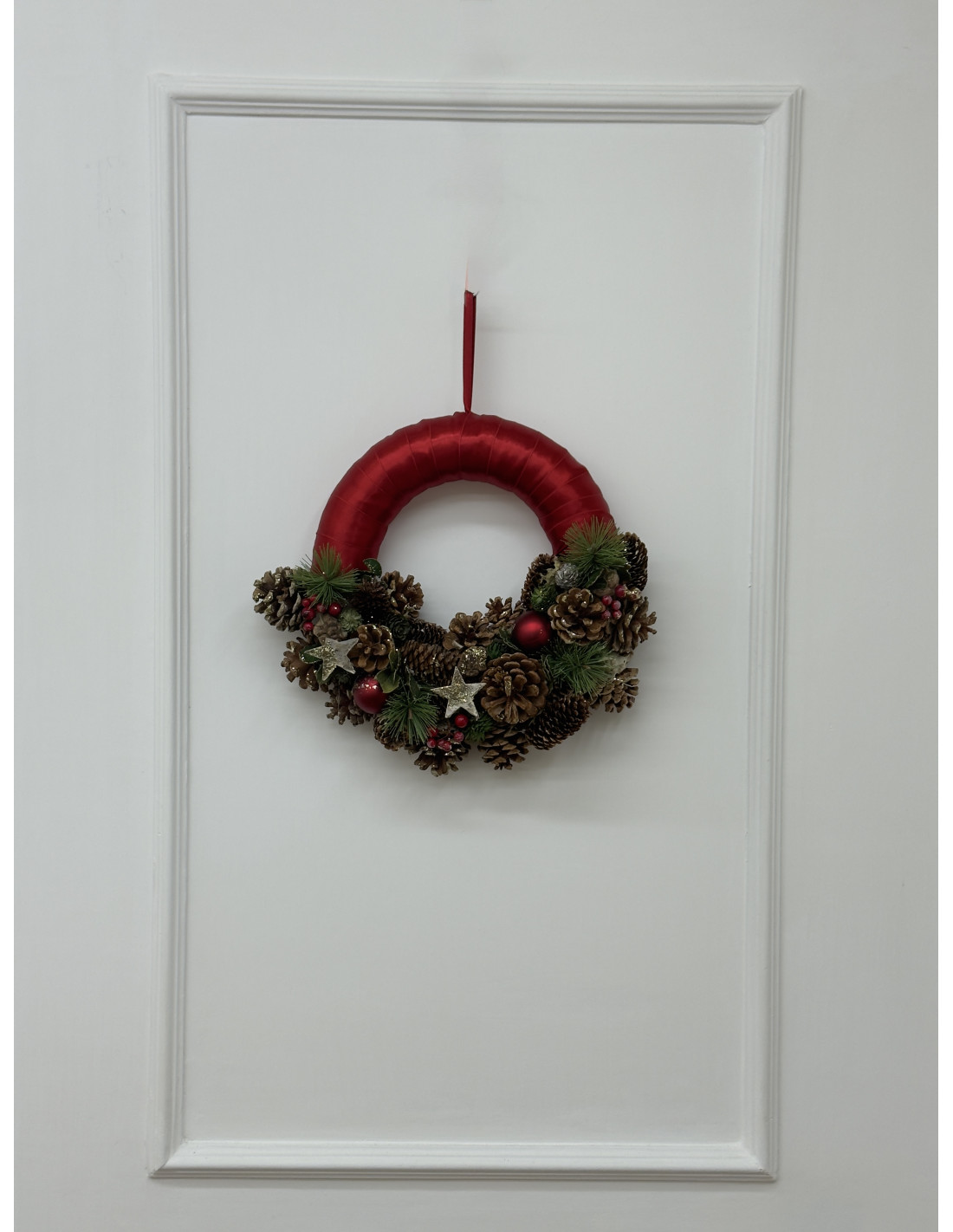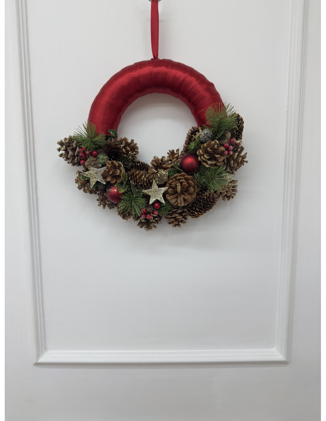 Raffinata ghirlanda natalizia da appendere, realizzata con base rivestita in raso rosso e decorata con pigne naturali, rametti di pino, bacche e dettagli dorati. Le stelle glitterate e le piccole sfere rosse donano un tocco di luce e calore, perfetto per accogliere gli ospiti con stile e spirito natalizio.