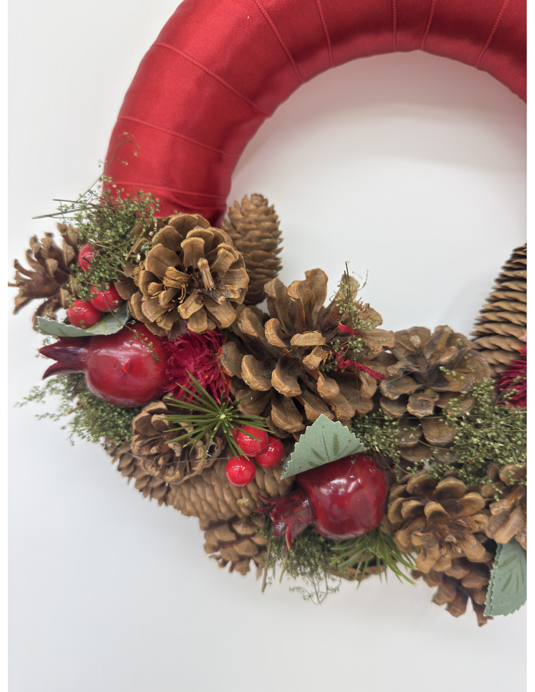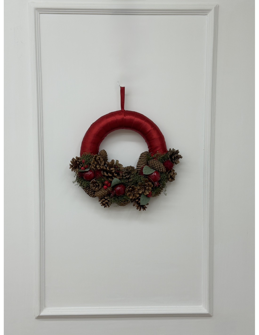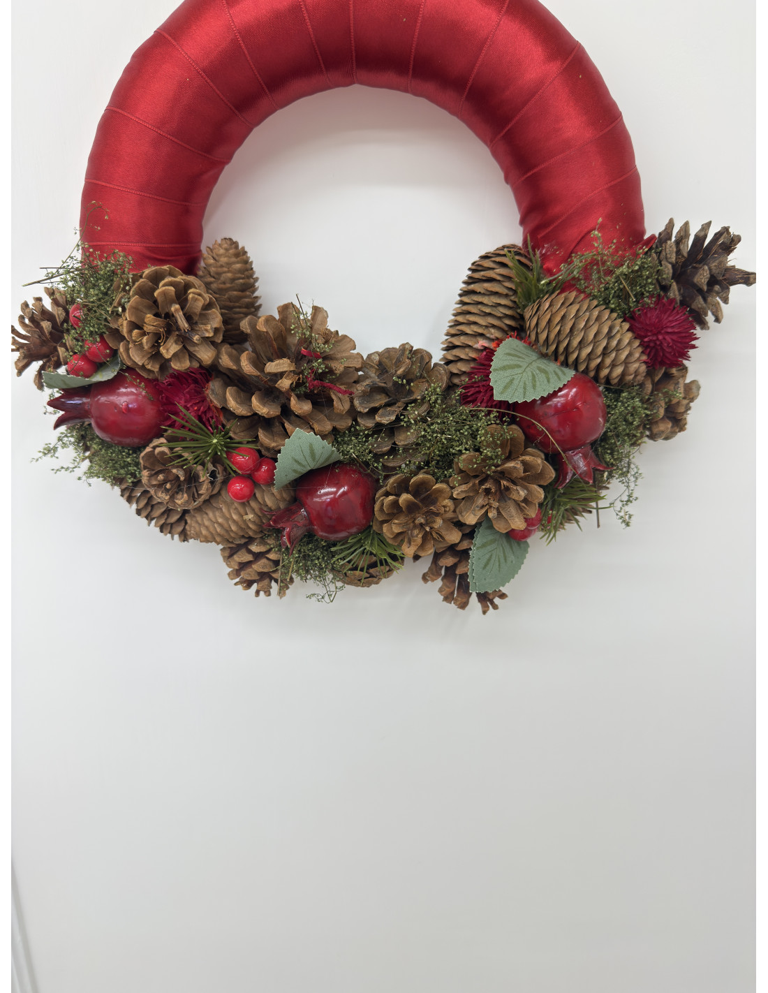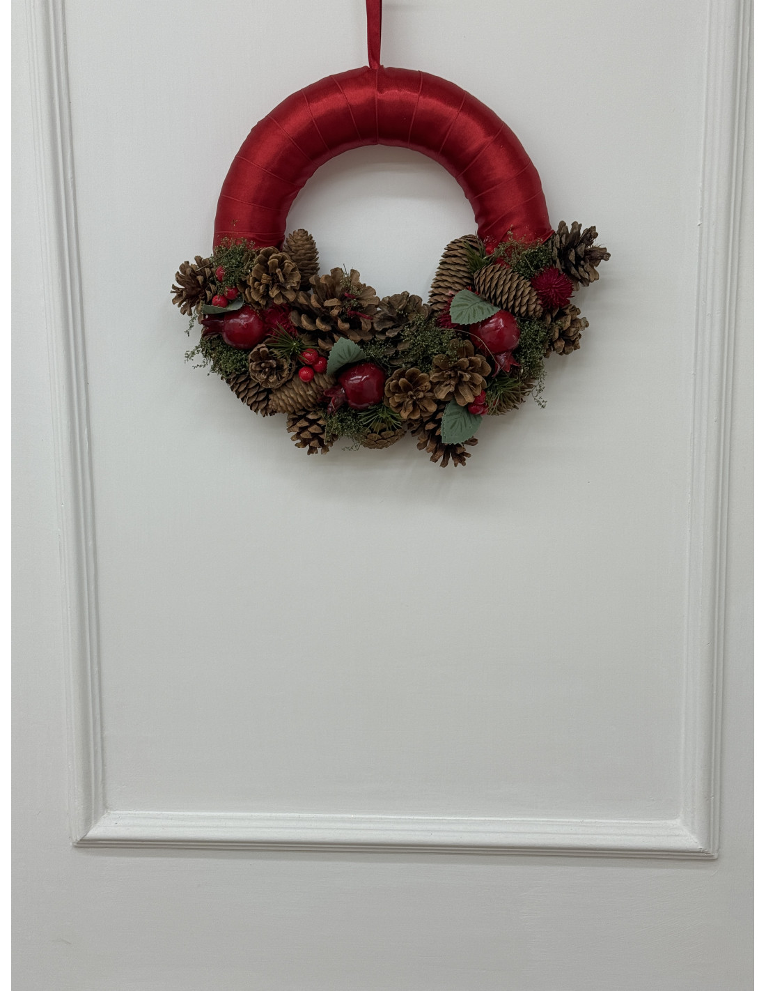 Raffinata ghirlanda natalizia da appendere, realizzata con base rivestita in raso rosso e decorata con pigne naturali, rametti di pino, bacche e dettagli rossi. Le piccole sfere rosse donano un tocco di luce e calore, perfetto per accogliere gli ospiti con stile e spirito natalizio.