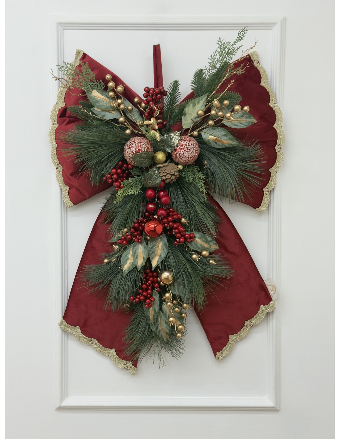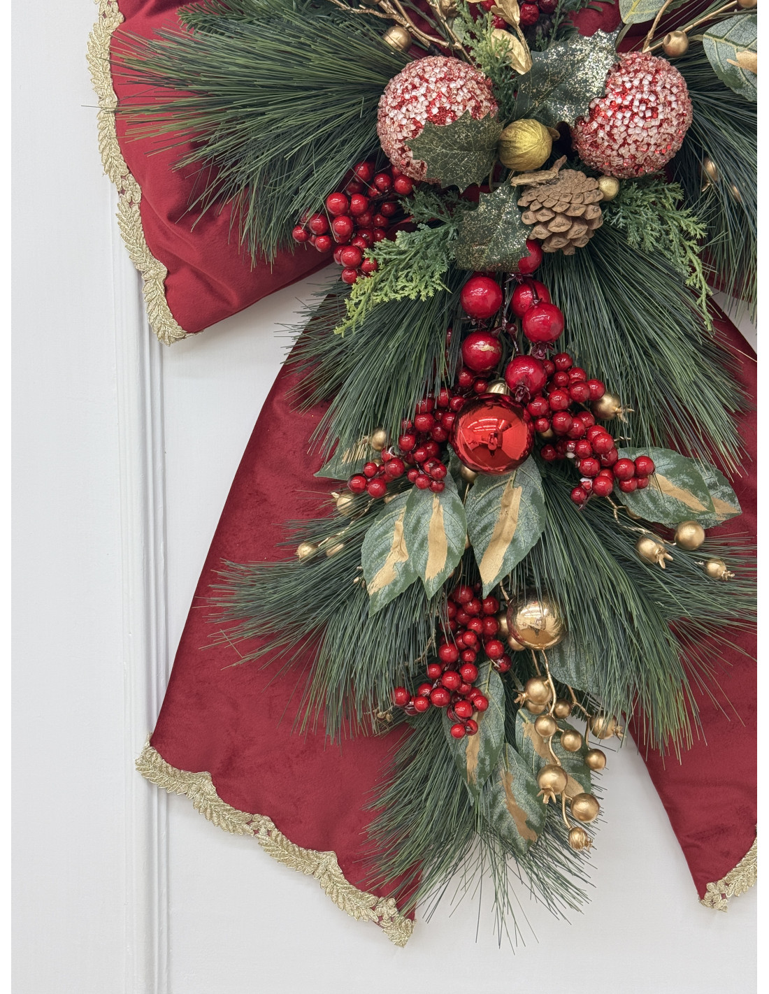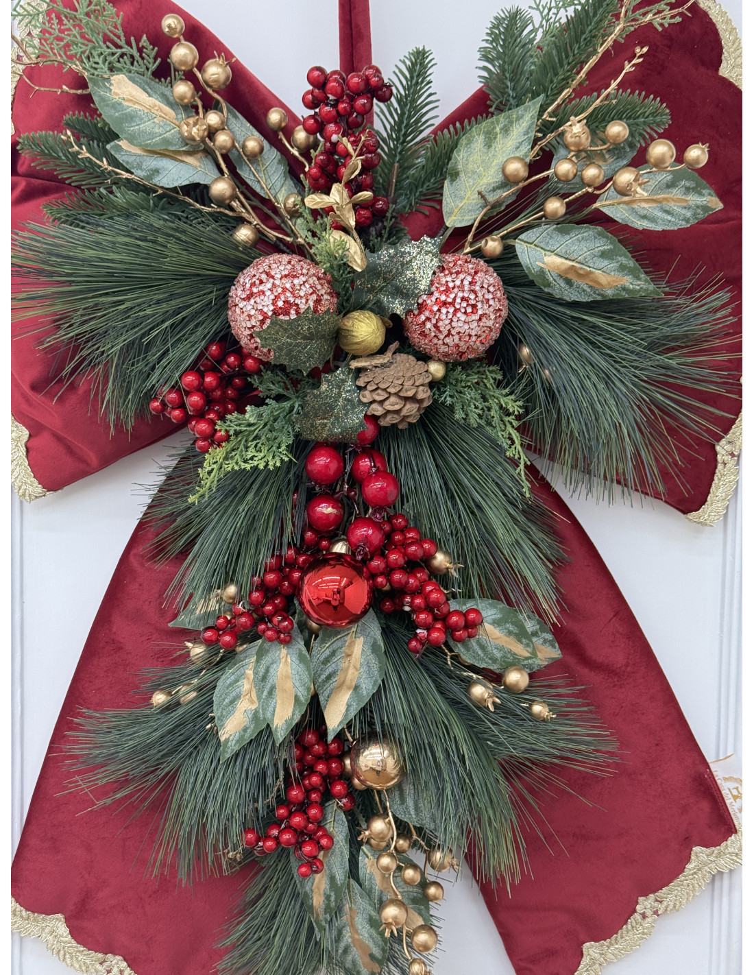 Scenografico fiocco natalizio da appendere, realizzato in velluto rosso con bordo dorato e ricche decorazioni centrali di pigne, bacche rosse, sfere oro e rami di pino. Un complemento d’arredo che cattura subito l’attenzione, perfetto per creare un’atmosfera calda e festosa.