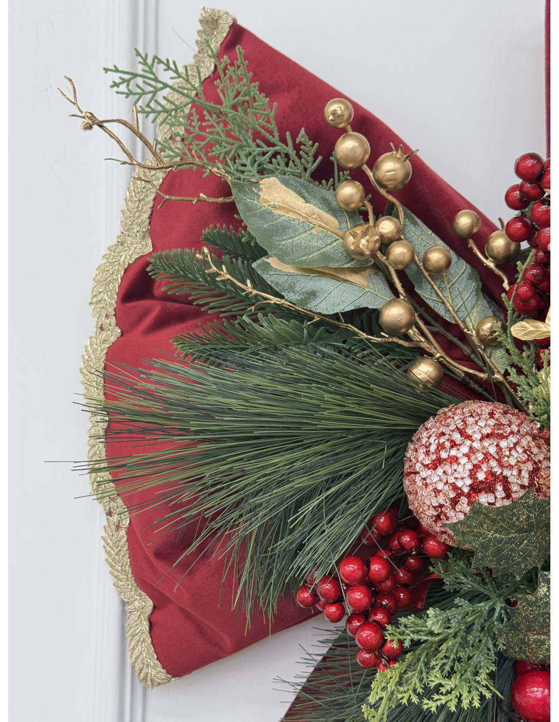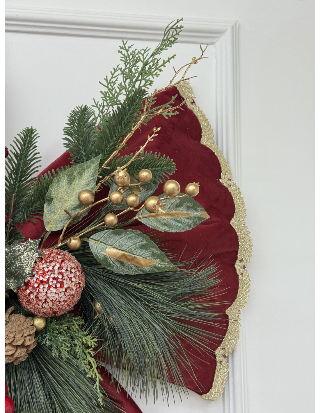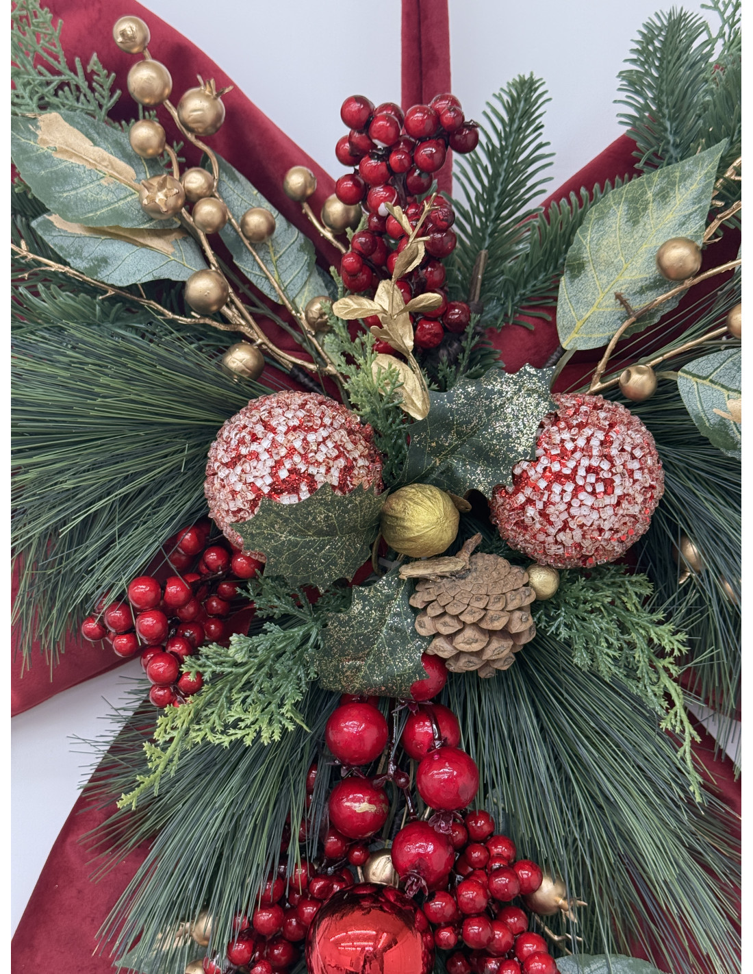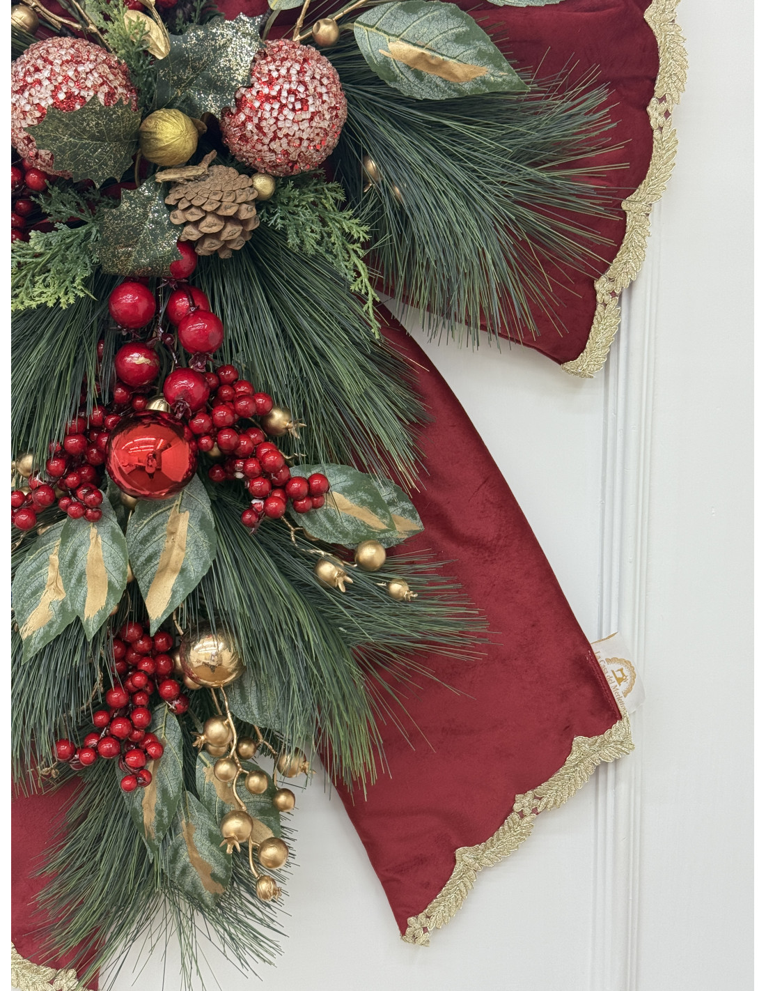 Scenografico fiocco natalizio da appendere, realizzato in velluto rosso con bordo dorato e ricche decorazioni centrali di pigne, bacche rosse, sfere oro e rami di pino. Un complemento d’arredo che cattura subito l’attenzione, perfetto per creare un’atmosfera calda e festosa.