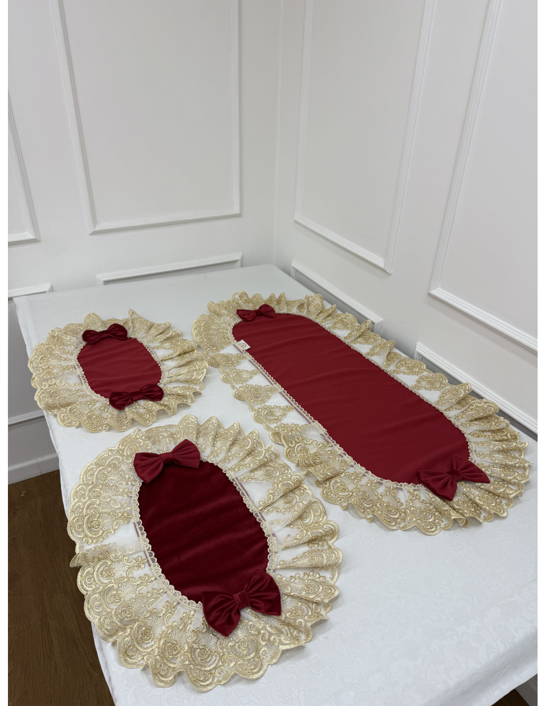Raffina i tuoi ambienti con questo elegante tris centri in velluto rosso, impreziosito da un delicato tulle in Lurex oro che dona luminosità e un tocco festivo.