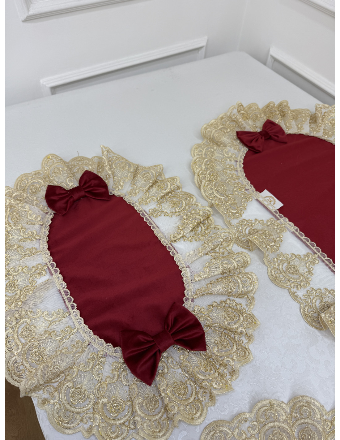 Ogni pezzo è rifinito con fiocchi in velluto rosso, applicati artigianalmente per garantire un risultato curato e armonioso.