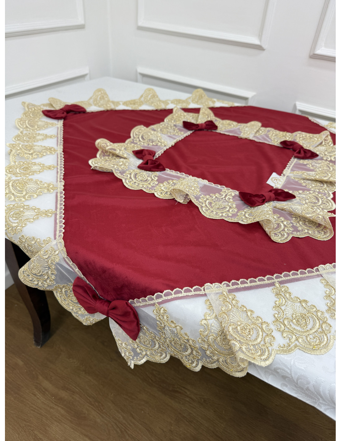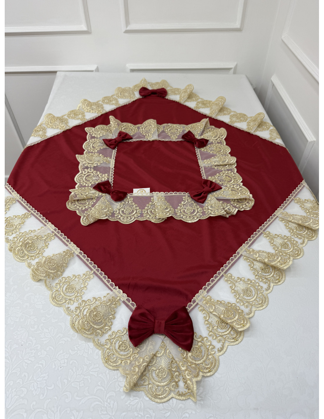 Elegante centro quadrato realizzato in velluto rosso, impreziosito da un raffinato tulle in Lurex oro che aggiunge luminosità e un tocco festivo.