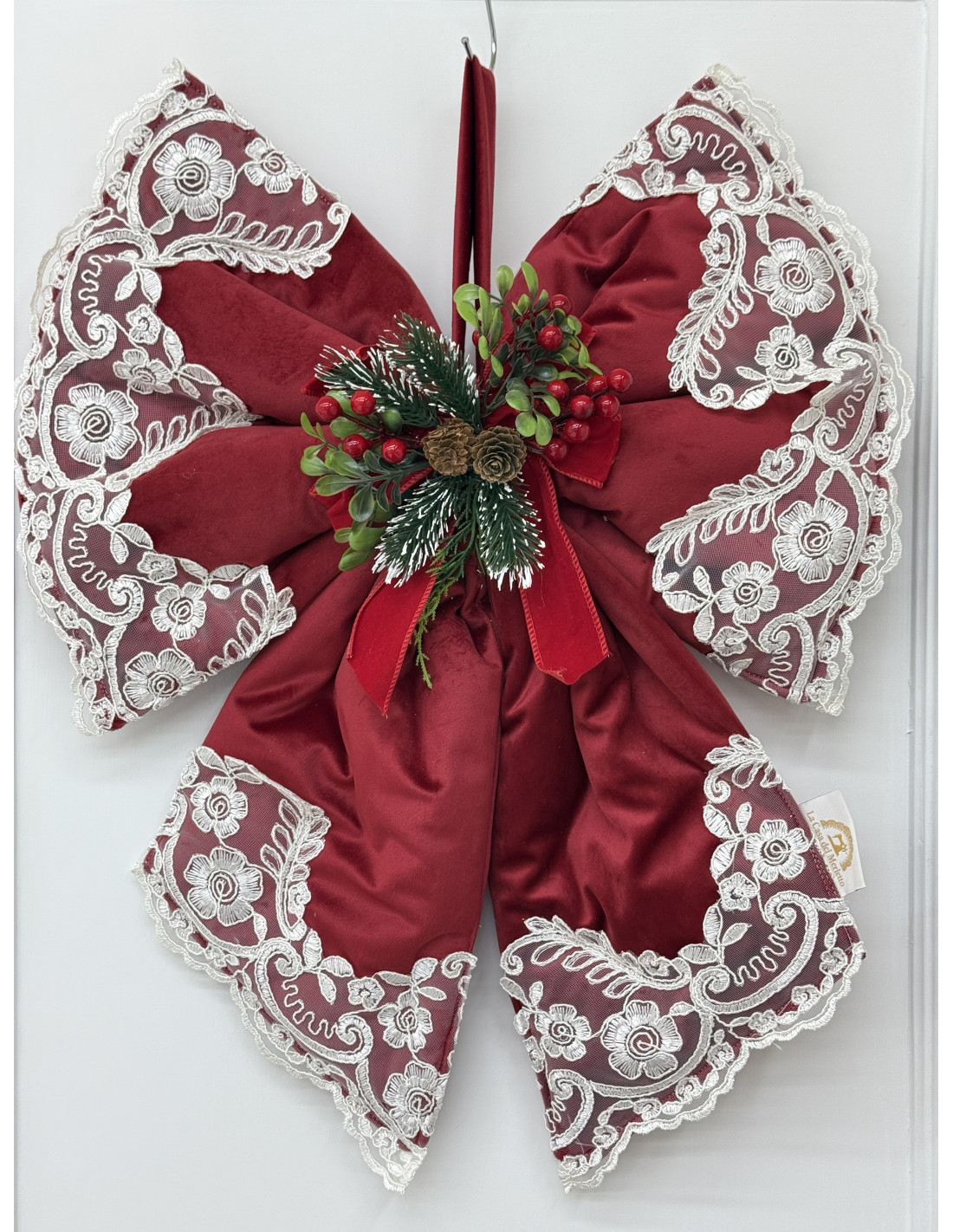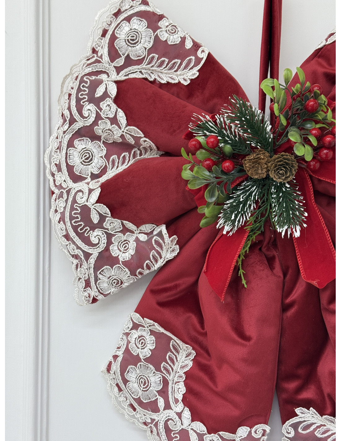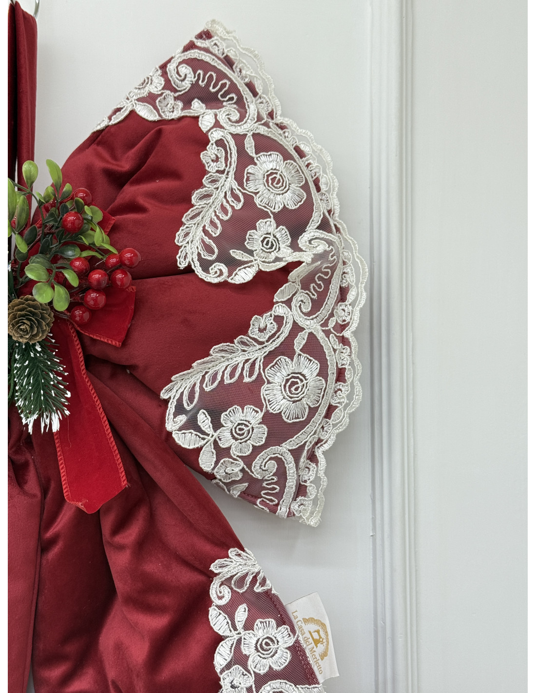 Elegante fiocco natalizio da appendere, realizzato in velluto rosso e impreziosito da delicato pizzo rebrodé.