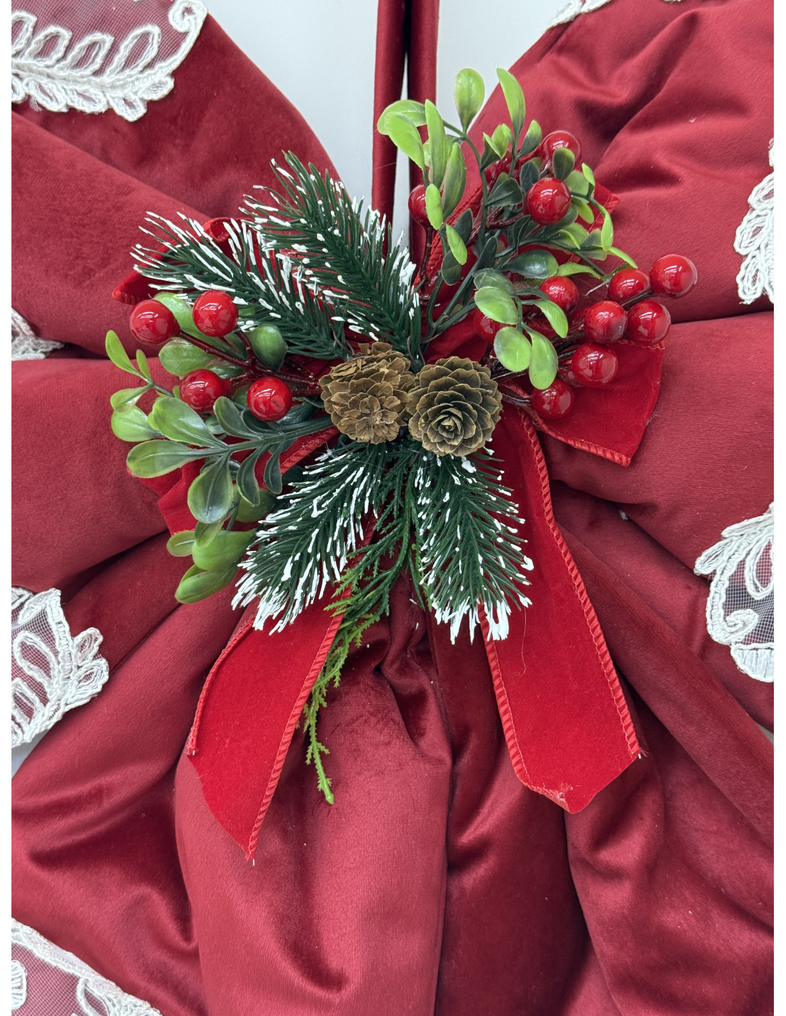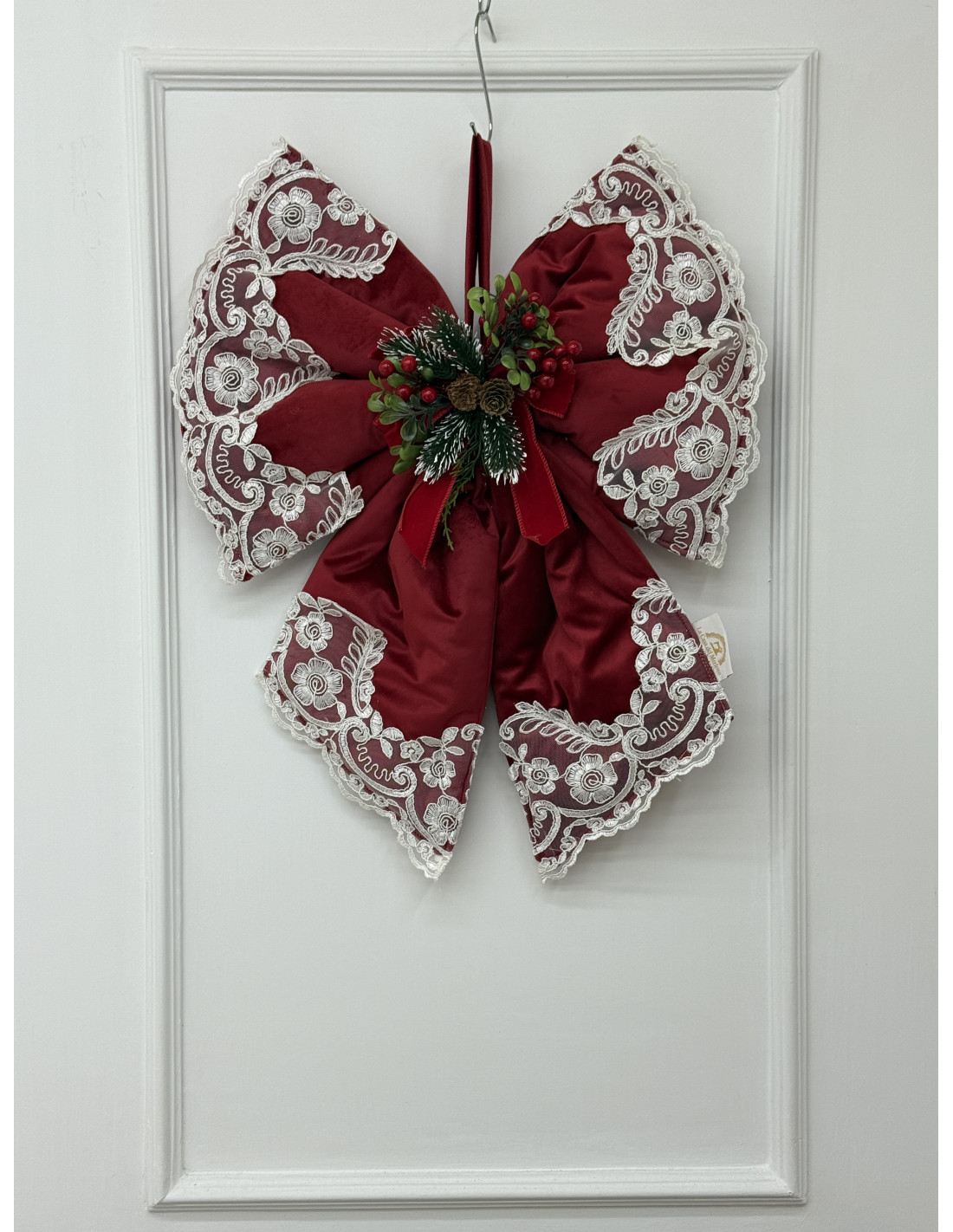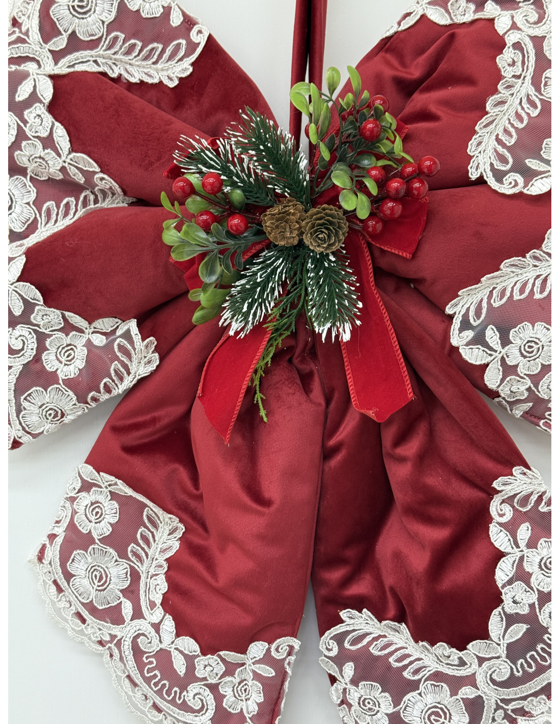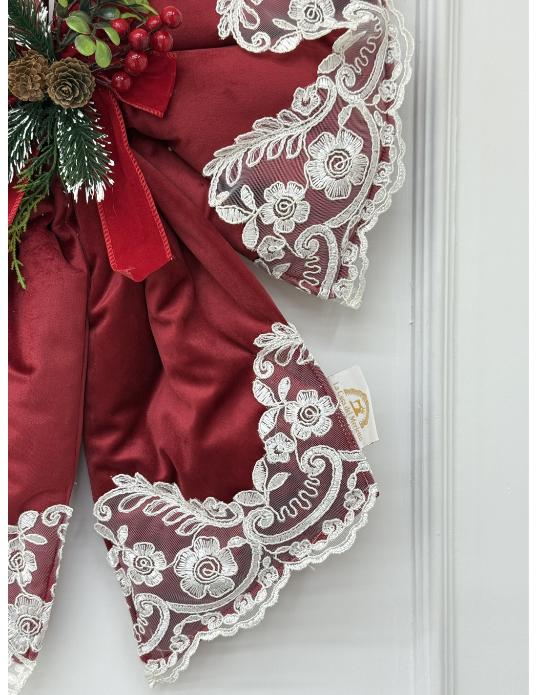 Elegante fiocco natalizio da appendere, realizzato in velluto rosso e impreziosito da delicato pizzo rebrodé.